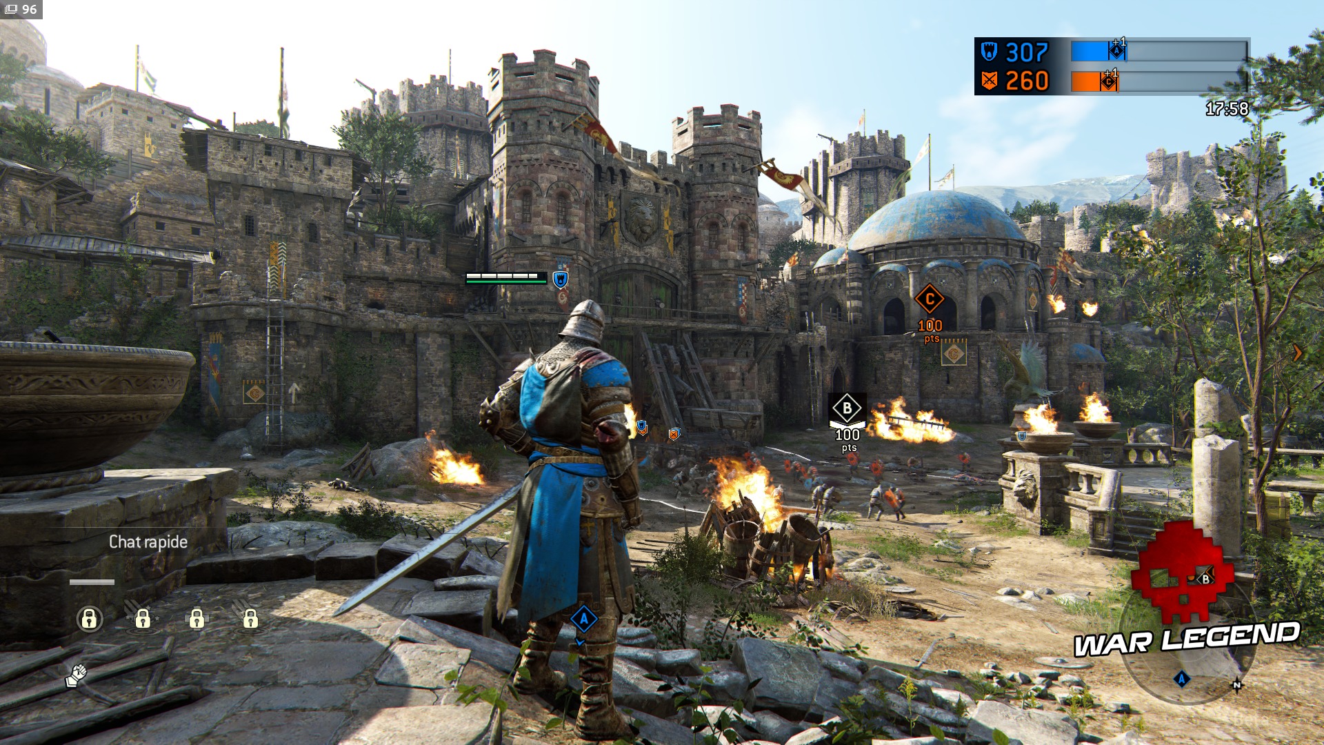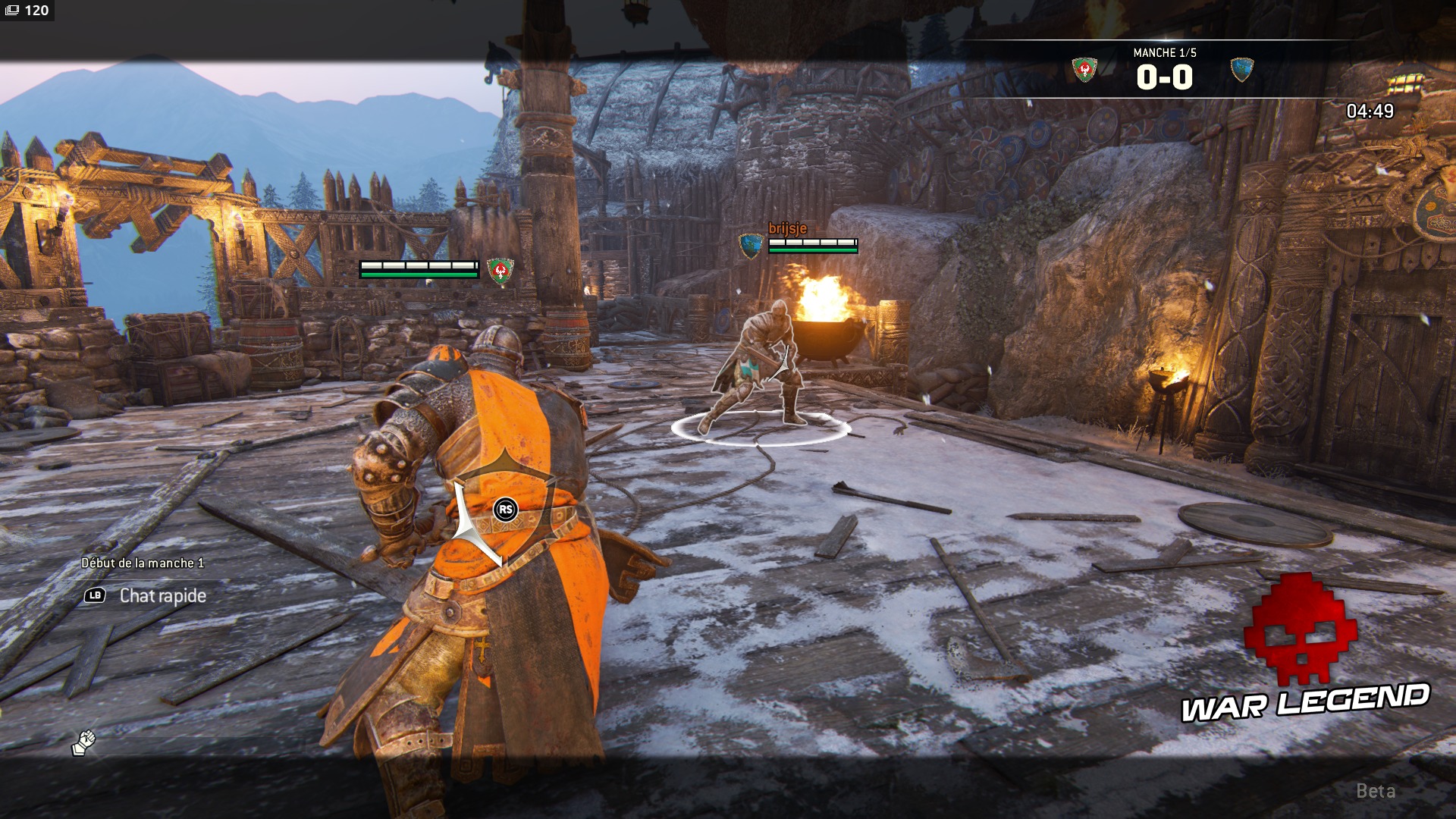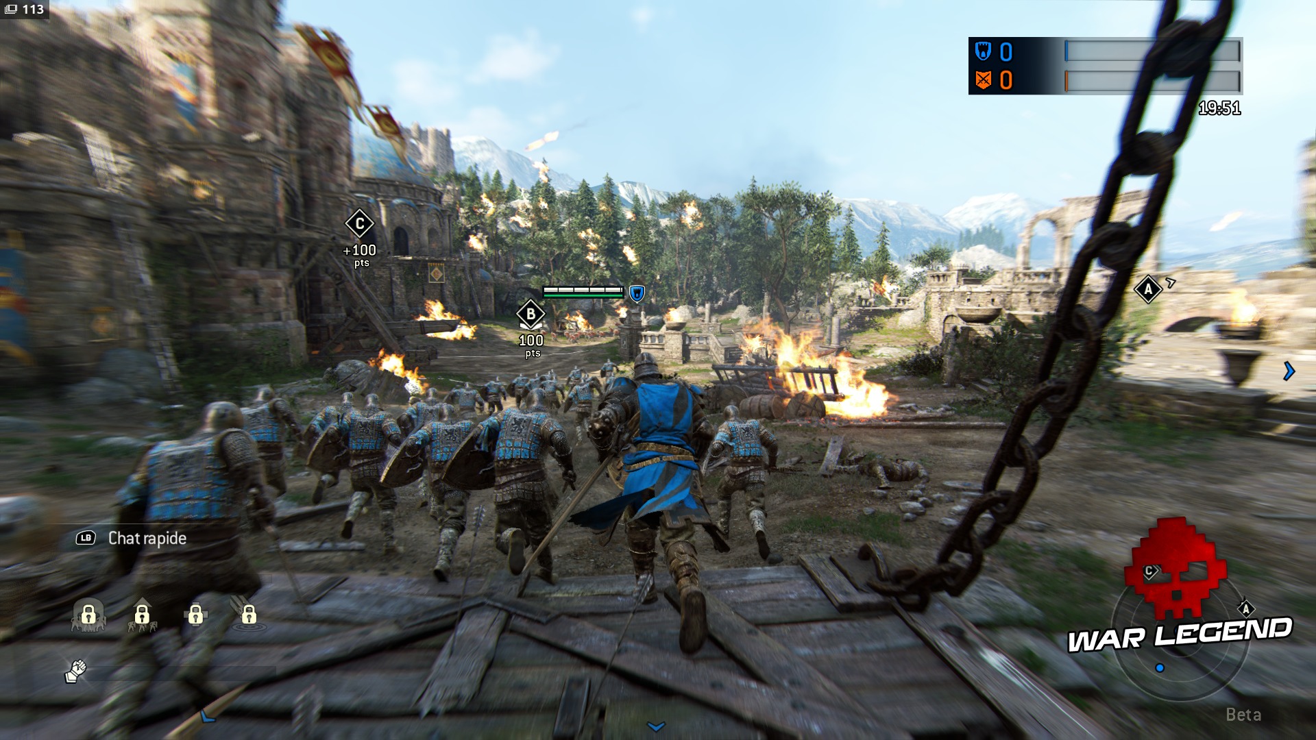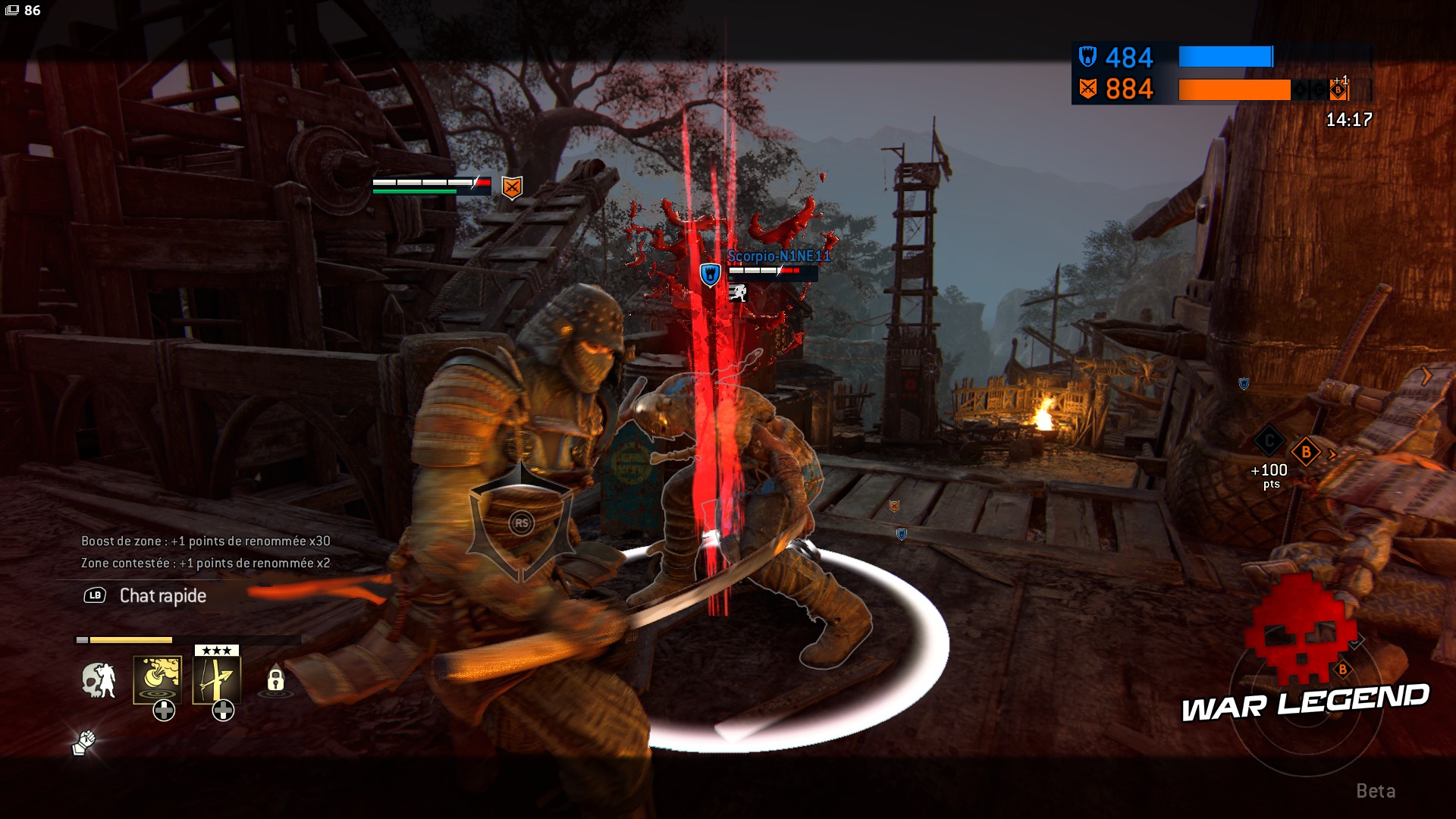 For Honor compte trois modes de jeu : 1v1, 2v2 et Dominion en 4v4. Le mode principal est le Dominion, un mode capture avec trois points d’intérêt, dont le no man’s land constitue le théâtre de PNJs qui se foutent sur la tronche. Tailler dans le lard permet à votre équipe de renforcer son contrôle sur la zone centrale. De plus, les fantassins de votre équipe représentent une bonne solution pour handicaper un adversaire en plein combat afin de gagner un avantage. Une fois l’objectif de score atteint, il faudra éliminer entièrement l’équipe adverse une dernière fois pour confirmer sa victoire, ce qui permet un dernier retour potentiel de la part des défenseurs. Ce n’est ni trop bordélique, ni pas assez. Les PNJs mériteraient en revanche d’être plus dangereux et un peu plus utiles : ils se content de gêner légèrement l’adversaire. En mode Dominion uniquement, votre personnage aura accès à des compétences à choisir en début de partie, comme un soin d’urgence ou un projectile pour gratter de la vie gratuitement à l’adversaire. Elles sont le seul véritable point faible du gameplay, car la majorité ne sont pas intéressantes ou n’apportent pas grand-chose.