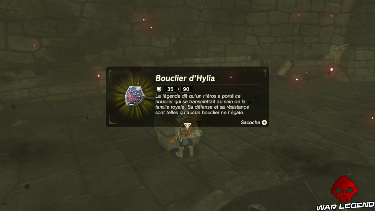 Sortez et prenez à gauche pour continuer à descendre l’allée. Juste avant d’entrer dans la cellule du fond, prenez à gauche pour ouvrir un coffre renfermant une Topaze brute. Continuez ensuite votre chemin pour trouver un gros tas d’ossements. En vous en approchant, il va prendre vie et vous devrez en venir à bout. Quand sa barre de vie sera proche de zéro, vos coups ne lui feront plus rien : bandez votre arc et tirez-lui une flèche dans l’œil (s’il le couvre de sa main, attendez simplement qu’il l’enlève) puis donnez un coup au globe oculaire qui tombe. Grâce à votre prouesse, vous pouvez récupérer une Hallebarde royale, une Épée royale, une Longue épée électrique, et surtout, dans le coffre, le Bouyclier hylien, le meilleur bouclier du jeu, doté d’un résistance et d’une défenses inégalées.