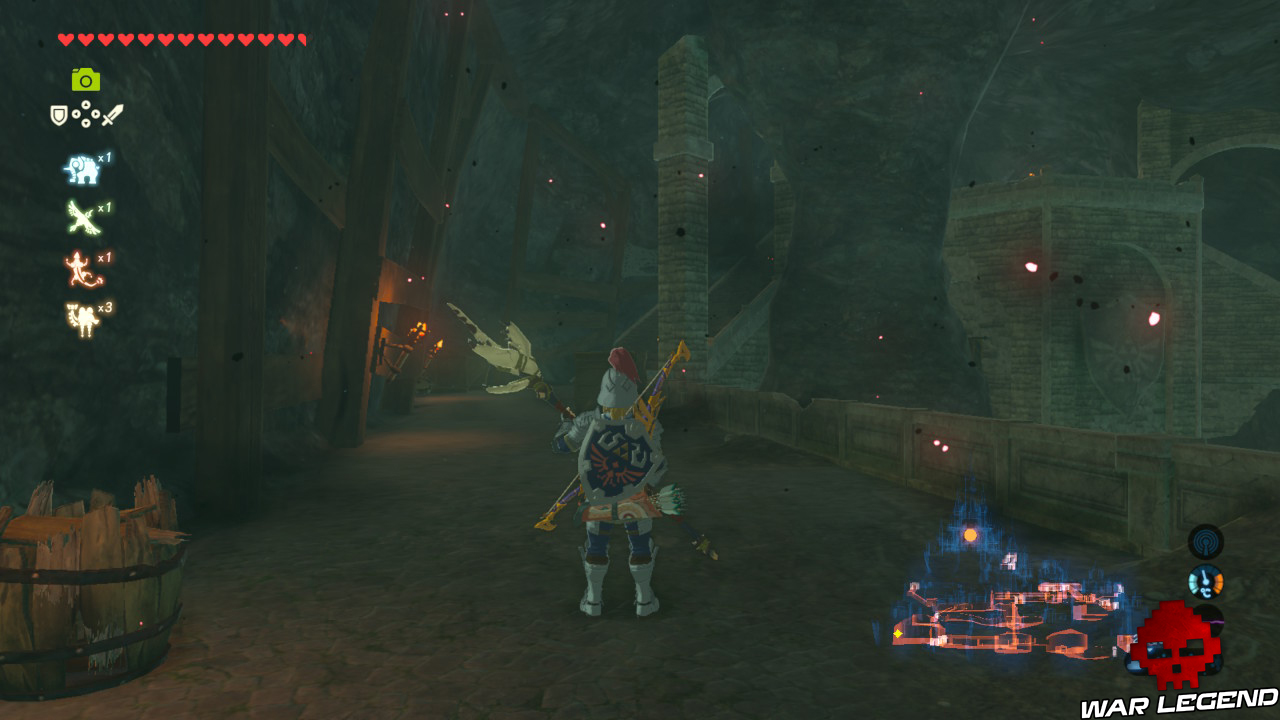 Tuez le Lézalfos noir qui surgit de sa prison puis allez dans cette dernière pour récupérer un Bouclier rouillé (si vous y tenez) et une Baguette des blizzards. Dans la cellule d’en face, il y a une ouverture coincée par des éboulis, faites-les sauter et allez au bout du passage pour trouver un Moblin maniant une une Hallebarde de garde royal, qui vous servira pour la mission secondaire « Les armes du château ».