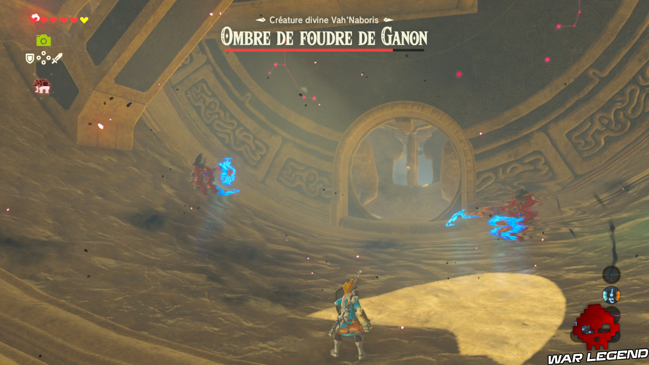 À l’intérieur de la maison, trouvez un Arc gerudo dans un coffre. Montez au poste d’observation pour retrouver Riju. L’objectif pour vous est de frappez les zones roses sur les pieds de Vah’Naboris grâce aux flèches explosives que Riju vous donne (pensez à les équiper !). Veillez à rester dans le cercle de protection, surtout quand un cercle violet se dessine autour de vous.