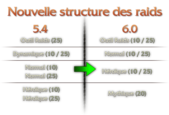 La structure des raids a également été repensée. Le mode normale et héroïque (10 ou 25) disparaissent pour laisser place à un système de raid dynamique qui s’adapte au nombre de personnes dans le raid suivant la difficulté choisie :