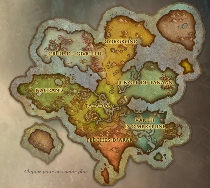 Le niveau maximum accessible passe de 90 à 100. Pour atteindre ce nouveau pallier, une nouvelle carte fait son apparition dotées de 7 nouvelles zones (Crête de Givrefeu, Vallée d’Ombrelune, Gorgrond, Talador, Flèches d’Arakk, Nagrand et Jungle de Tanaan).