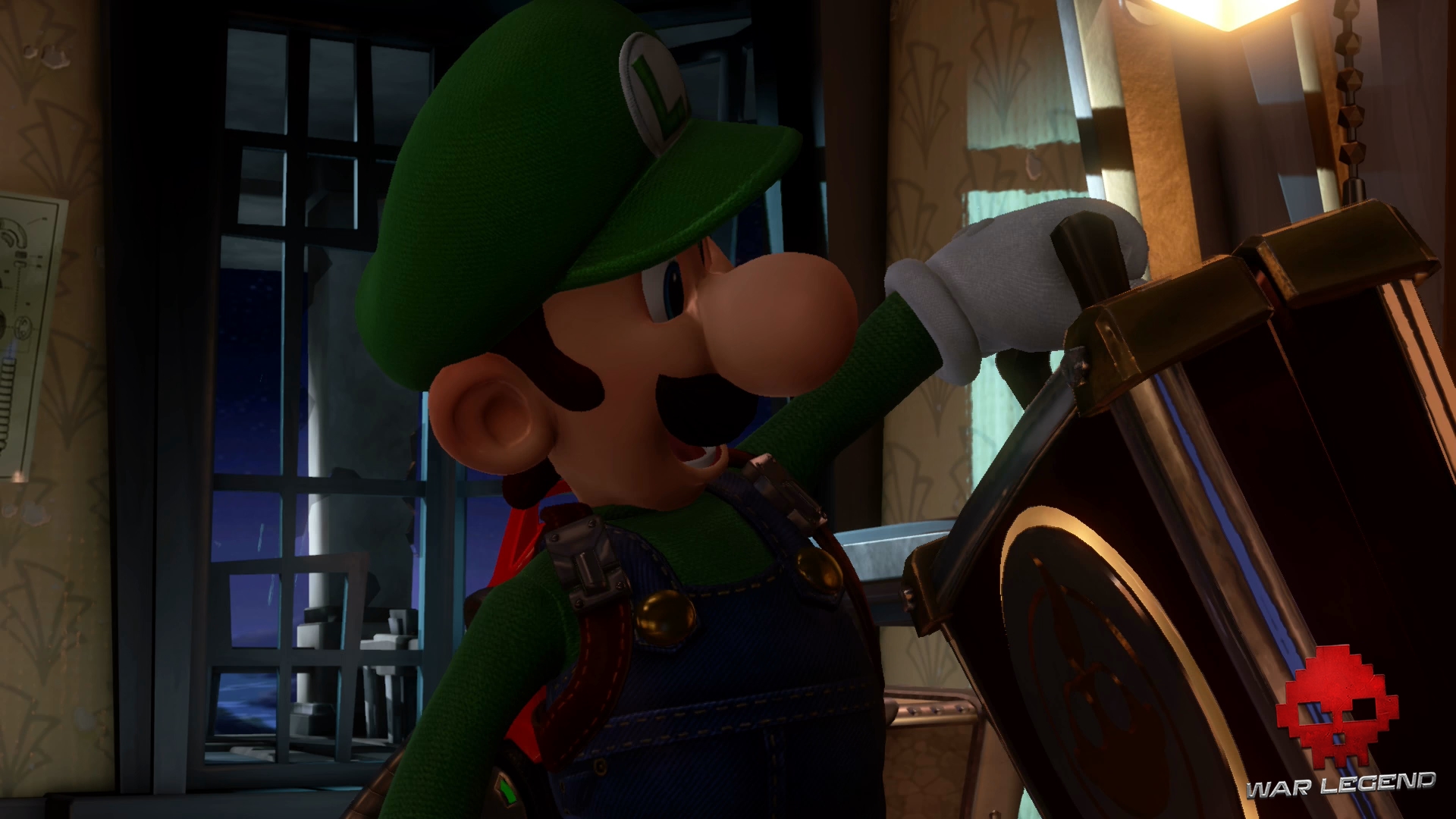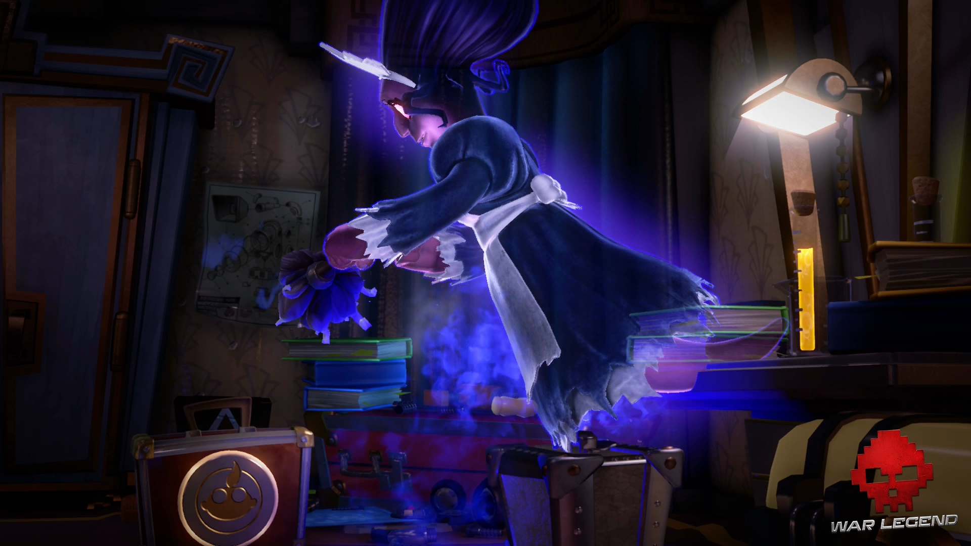 Dominique la Domestique a déniché la valise du professeur avant vous et la trouve très intéressante. En voyant Luigi, le fantôme boniche prend peur et traverse la pièce.
