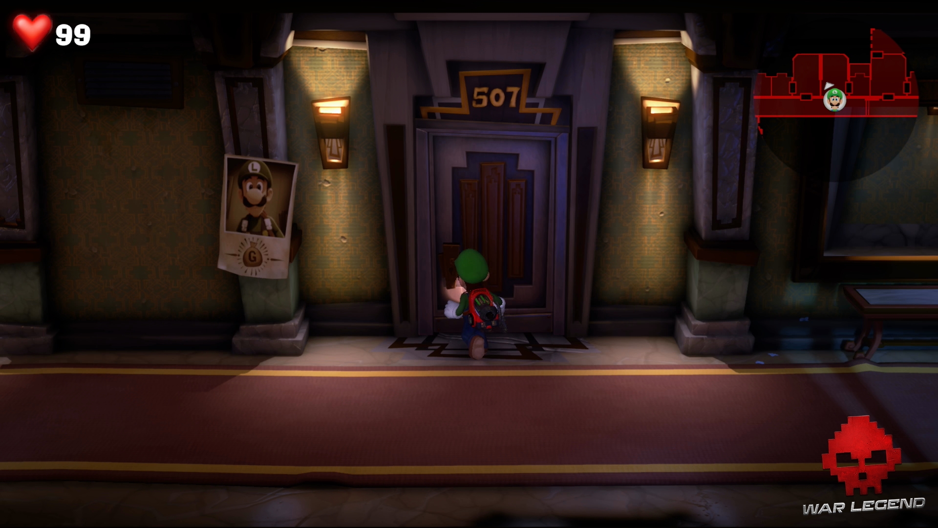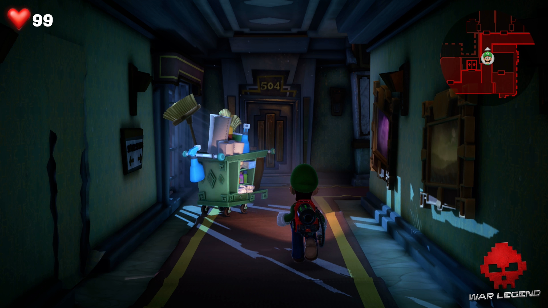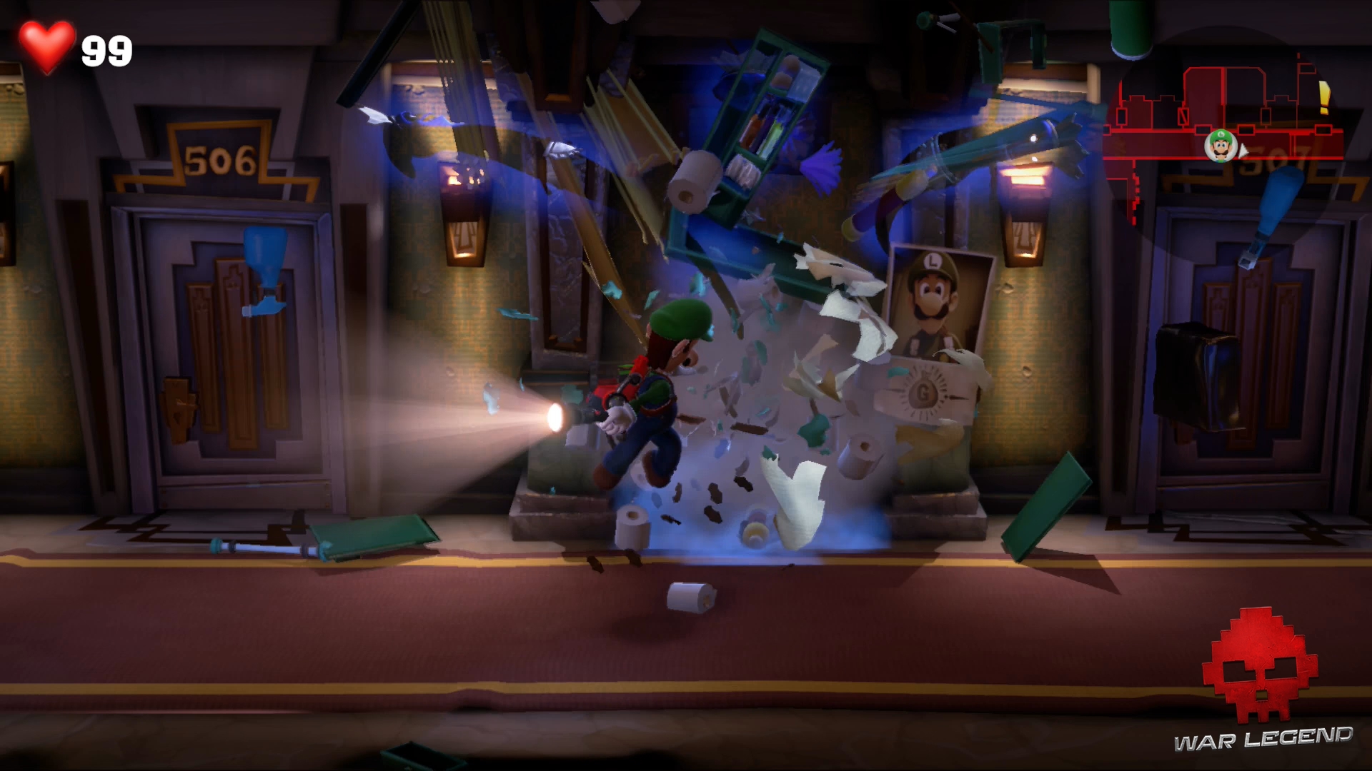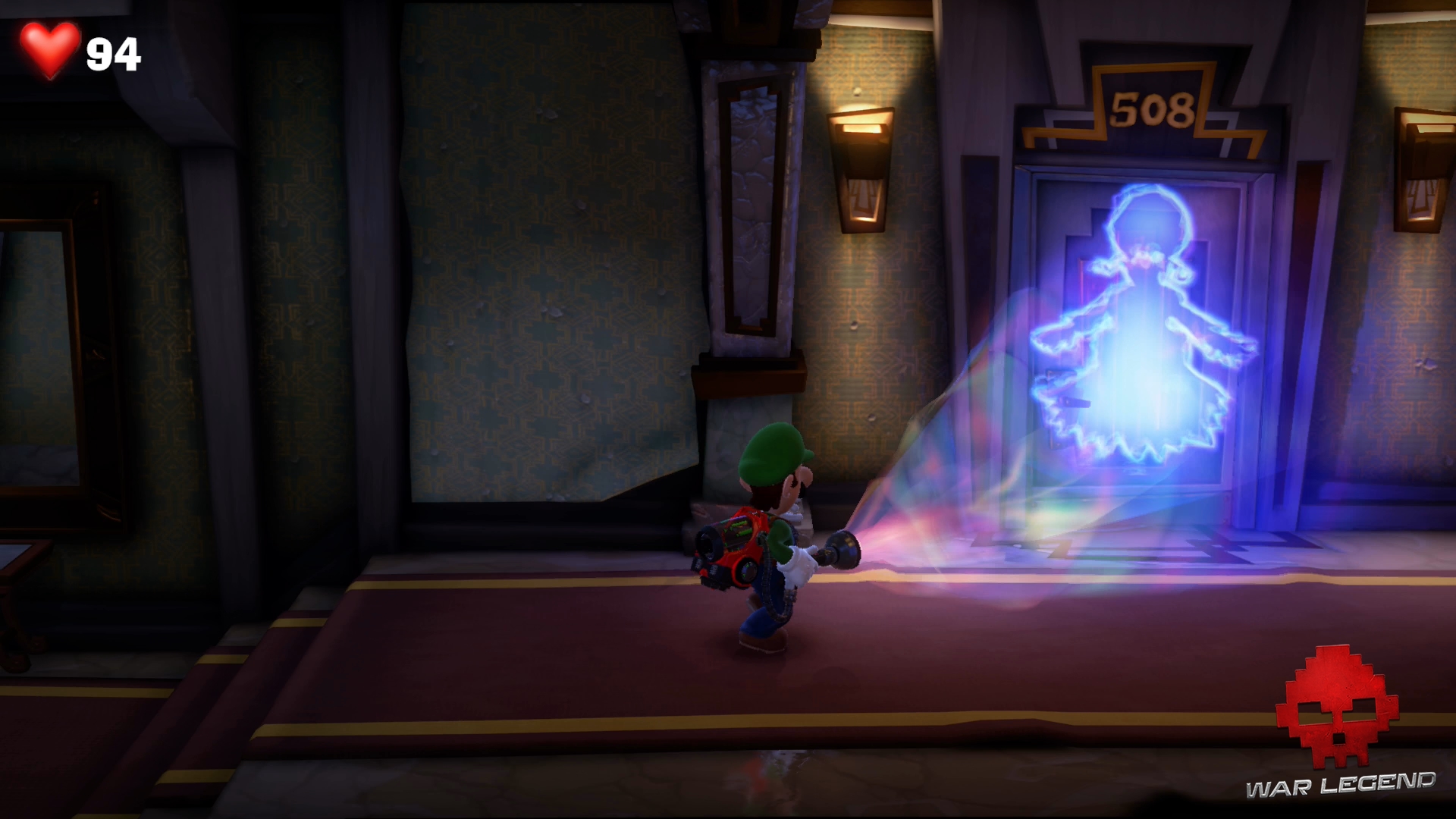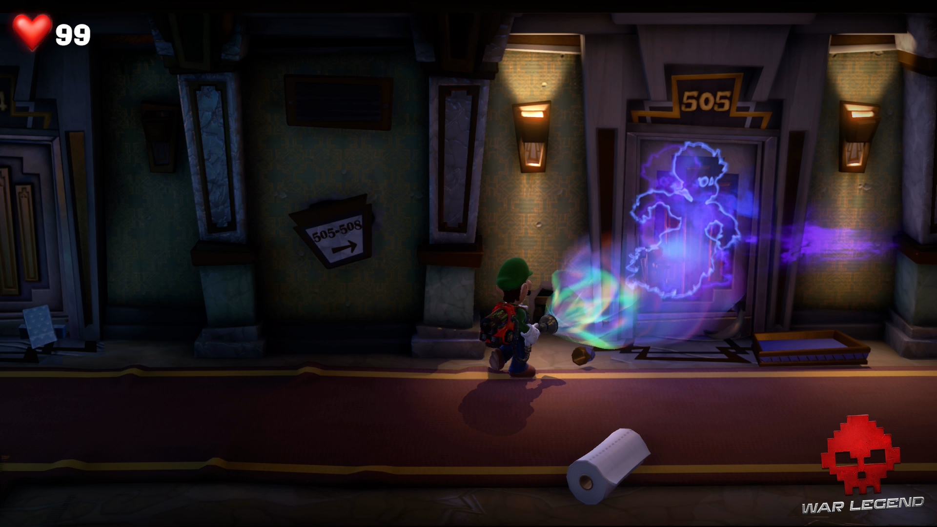 Cette fois, la bonne s’échappe dans le couloir. Impossible de savoir où le fantôme s’est réfugié cette fois-ci… ou peut-être que si. Utilisez le Révéloscope sur la porte de la chambre 505 pour voir sa marque.