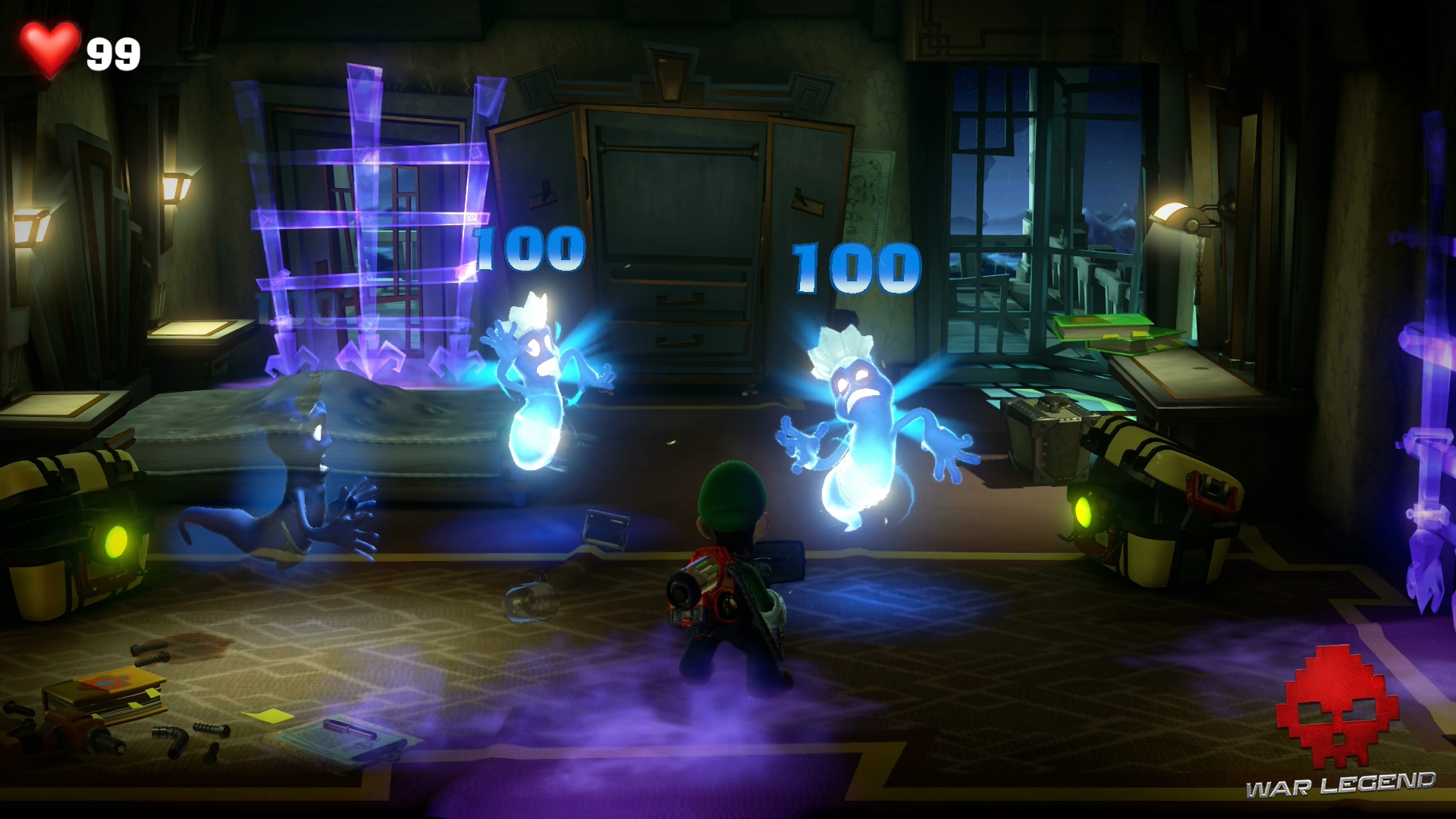 La valise qui est retenue dans son ectoplasme vous empêche de l’aspirer. Le cercle marqué dessus vous donne un indice : utilisez le lance-ventouses.