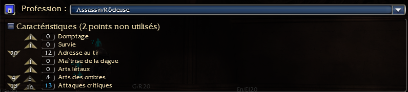 - Quatre caractéristiques communes à toutes les professions: puissance (augmente l’attaque), précision (augmente le % de critique), endurance (augmente l’armure) et vitalité (augmente les points de vie).