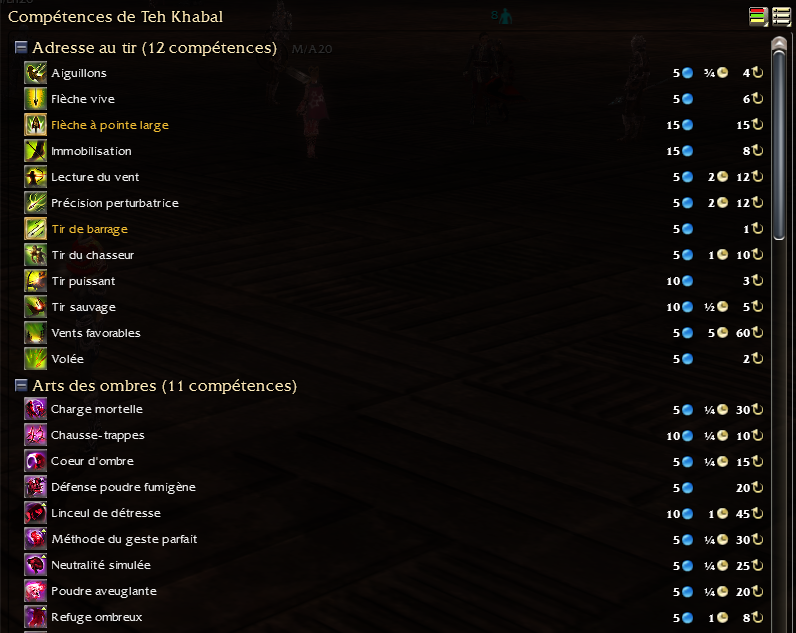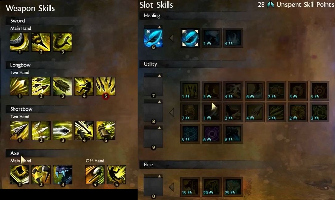 - Les 5 derniers slots (6 à 10) ont des compétences de profession: une compétence de soin, trois compétences utilitaires et une compétence élite.