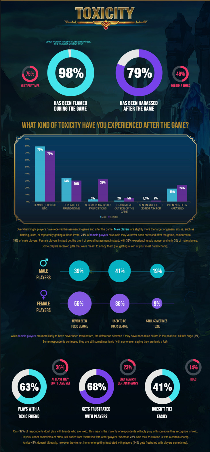 Un sondage mené par des joueurs et exposé via une infographie tend à démontrer que les joueurs de League of Legends ont tous été déjà victimes de harcèlement. Traitement spécial pour les filles.