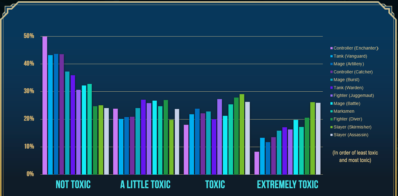 Bien sûr, certains joueurs se confessent et avouent qu’ils sont eux-mêmes toxiques. Un joueur sur 5 contre une joueuse sur 10 se considère comme un minimum toxique (sans évaluation de la gravité). Une chance, puisqu’une partie de League of Legends réunit… 10 joueurs. Chiffre rigolo qui confirme certains clichés : ce sont les joueurs qui privilégient les classes d’assassins qui sont les coéquipiers les plus imbuvables.