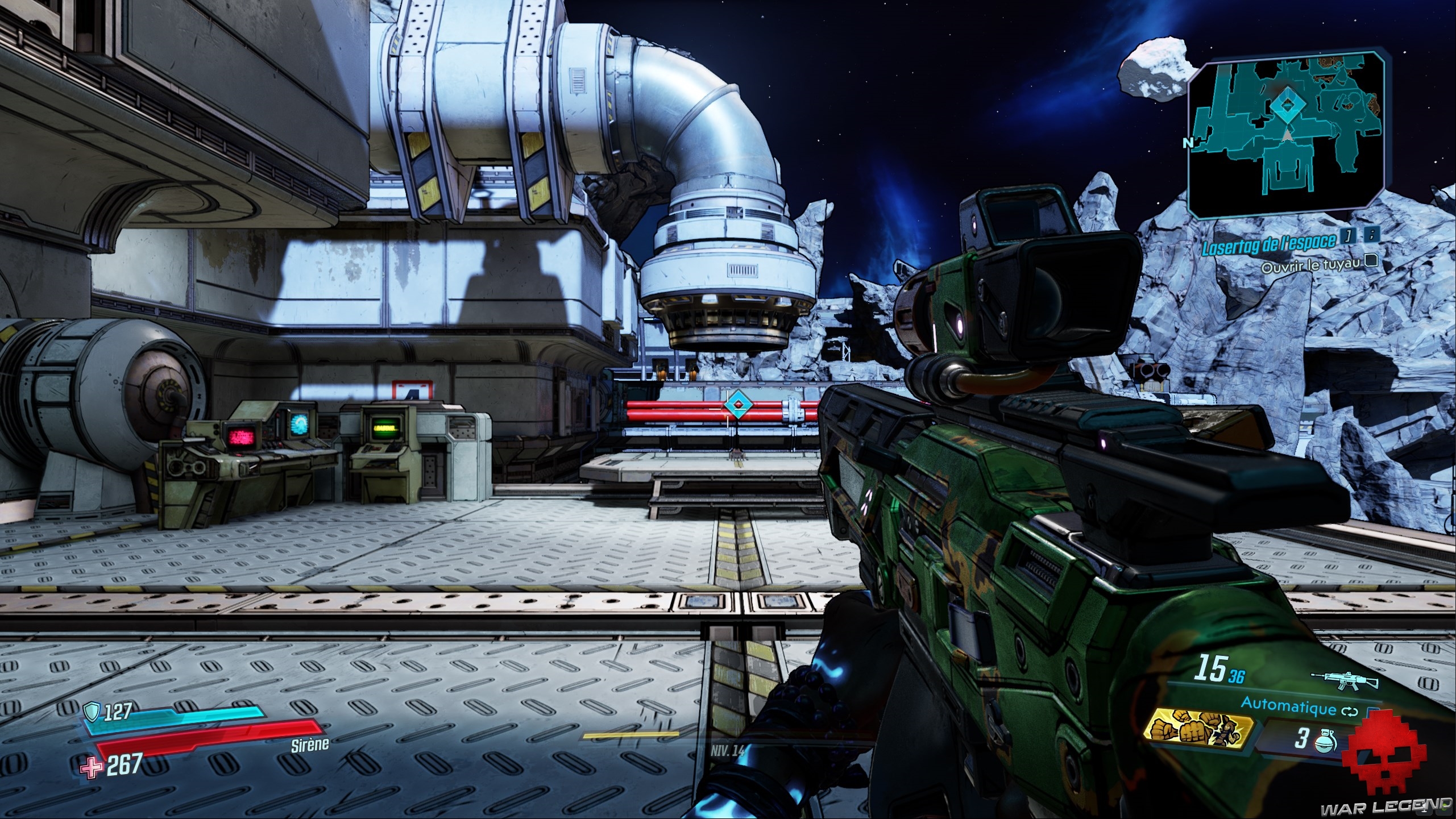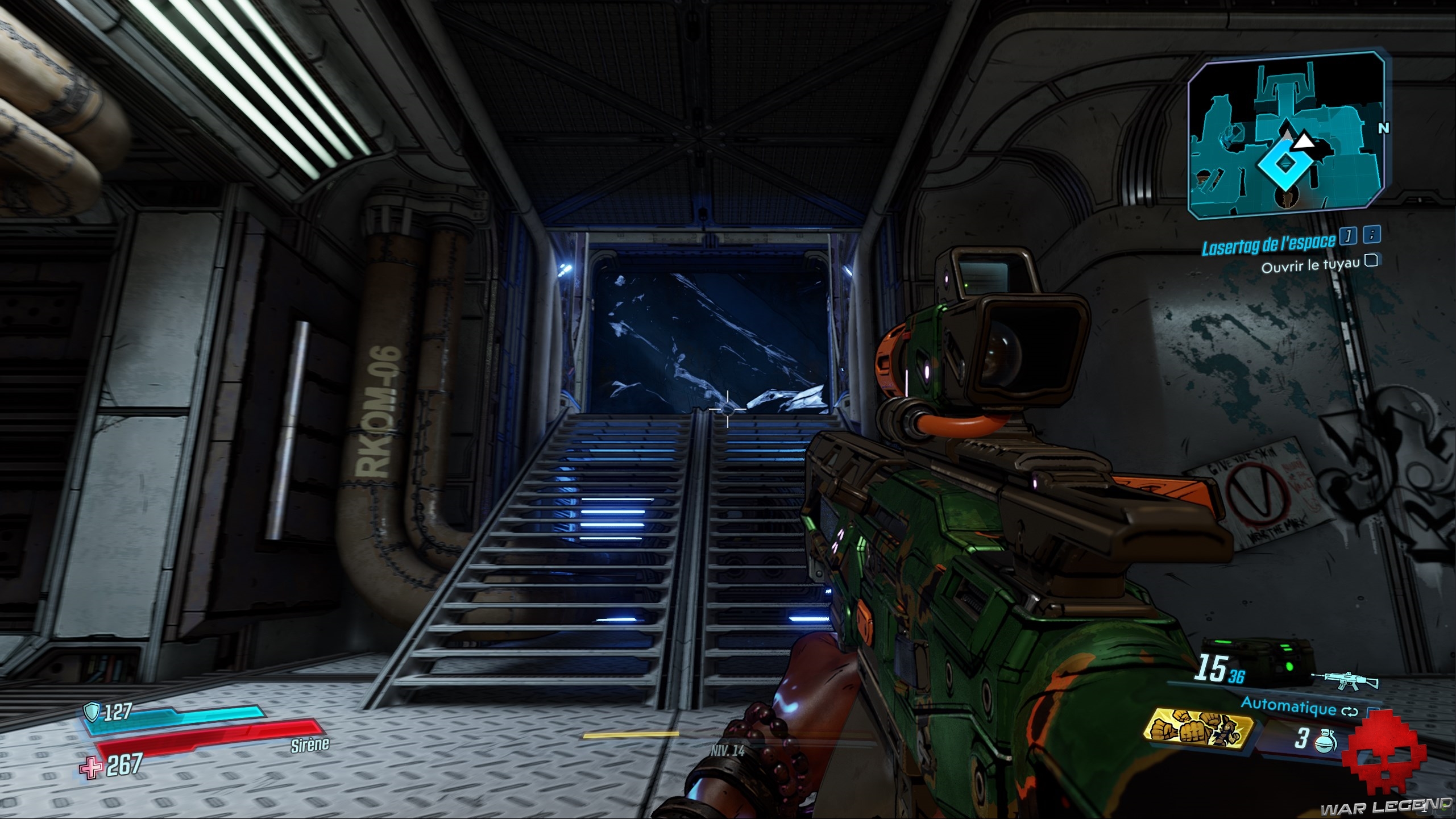 Katagawa Jr (l’homme à la tête de Maliwan) ayant détruit le vaisseau de Rhys, ce dernier vous confie la « clé vipère » afin que vous puissiez pirater une navette Maliwan. Allez juste un peu en arrière et prenez la porte qui se trouve juste à droite. Utilisez la clé vipère pour l’ouvrir, dégommez les quelques ennemis qui attendent de l’autre côté, puis prenez la navette qui vous mènera à la Plateforme Skywell-27.