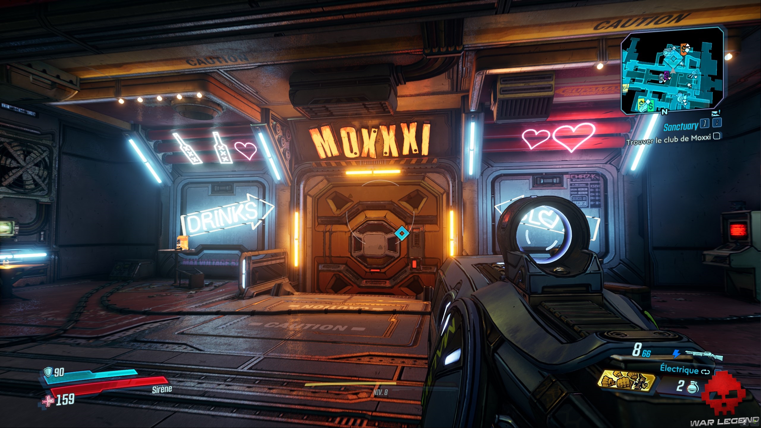 Évidemment, même pas temps de crise, certains refusent de vous aidé sans compensation. Earl ne jurant que par l’éridium, vous devez vous en procurer pour qu’il vous donne son accélérateur entropique. Il vous faut donc aller à la rencontre de Moxxi dans son bar. La porte de Earl derrière vous, prenez les escaliers sur votre gauche. Une fois en haut, allez directement à droite et vous devriez rapidement apercevoir l’enseigne du bar.