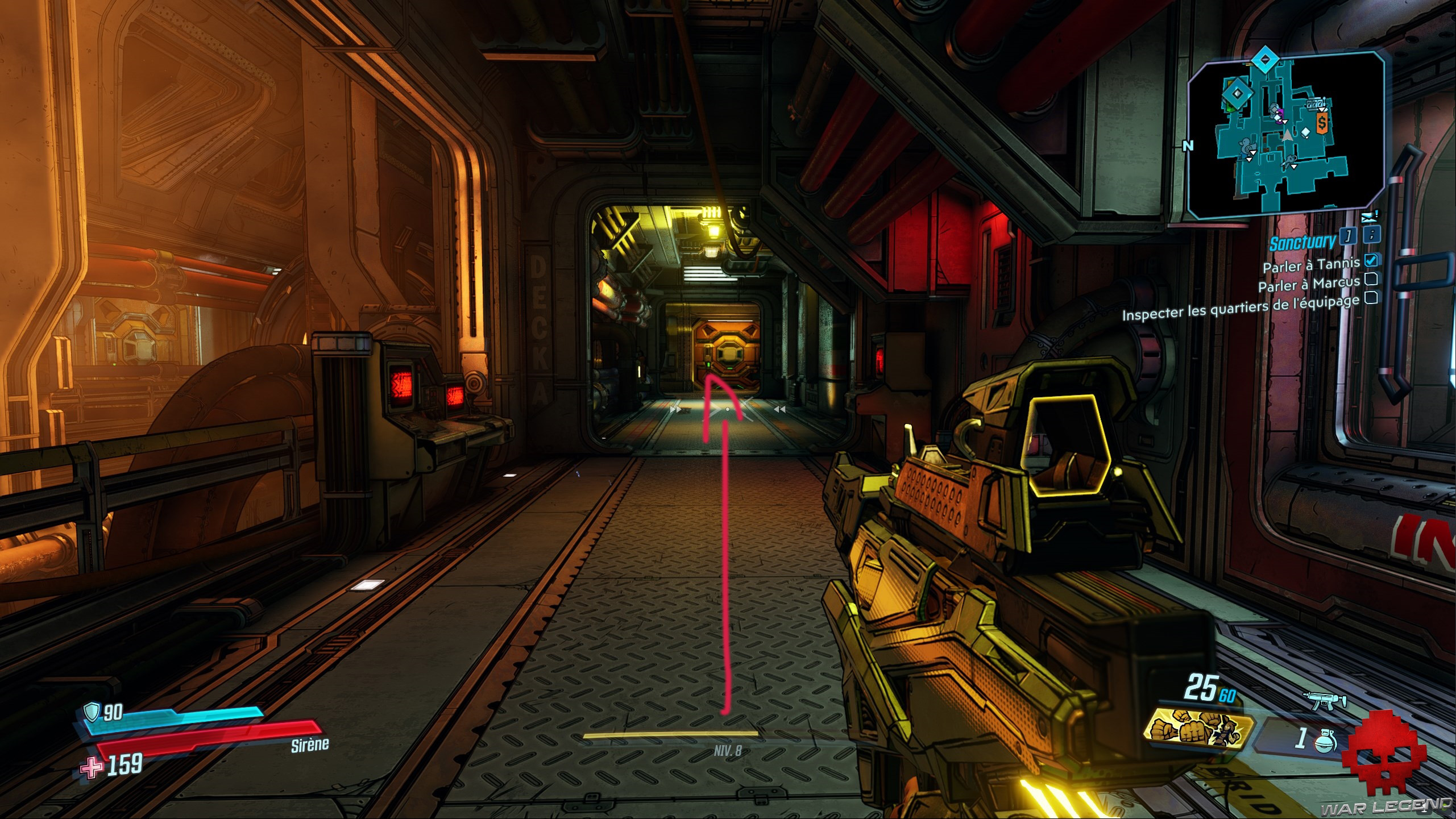 Sortez ensuite de la salle et prenez directement à droite en direction des quartiers de l’équipage. Un peu après la porte, vous devriez apercevoir un écriteau « DECK B » fléché. Descendez pour arriver devant les quartiers. L’équipage s’est fait enfermer par Claptrap (quel boute-en-train) ; il vous suffit d’actionner l’interrupteur à gauche de la porte pour les libérer et découvrir votre nouvelle chambre.