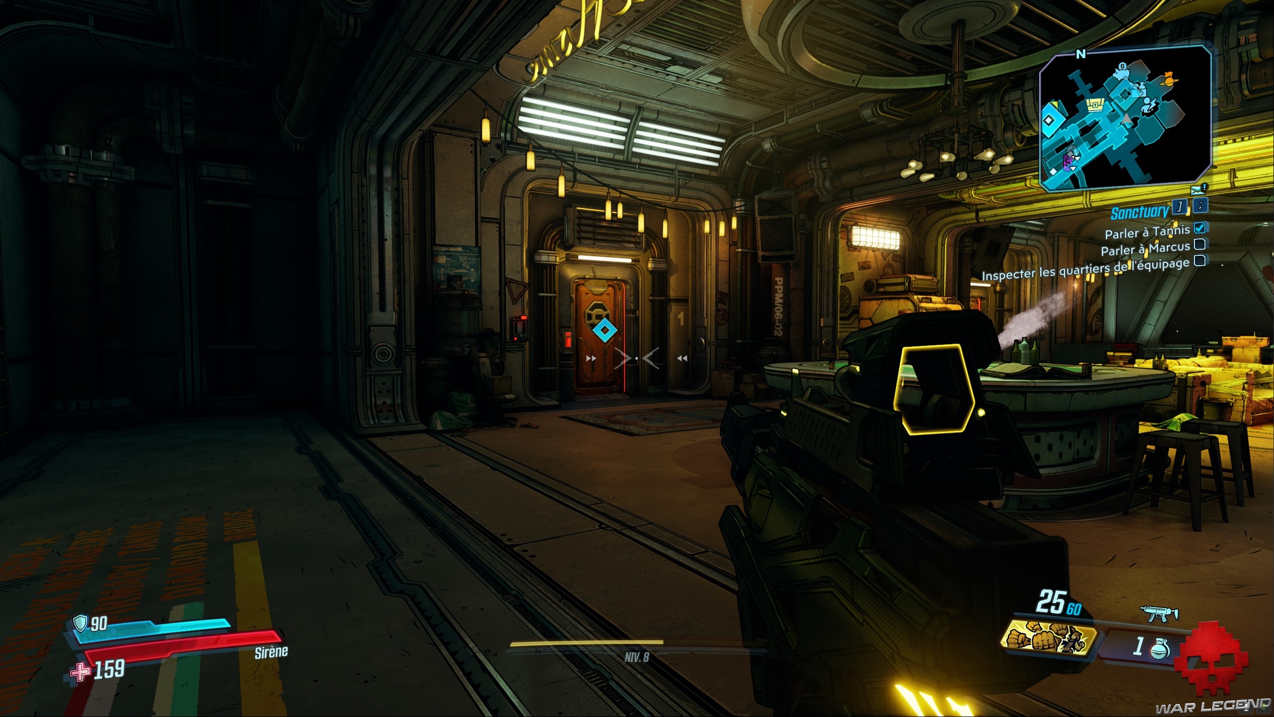 En sortant de votre chambre, prenez à droite pour allez voir Marcus. Son magasin/stand de tir est envahi par les flammes, qu’il va falloir éteindre avec les systèmes anti-incendies (au nombre de 3). Comme on est dans Borderlands, il faut employer la méthode Borderlands : tirez dessus. Parlez à Marcus une fois la tâche accomplie pour qu’il vous remette une amélioration de stockage.
