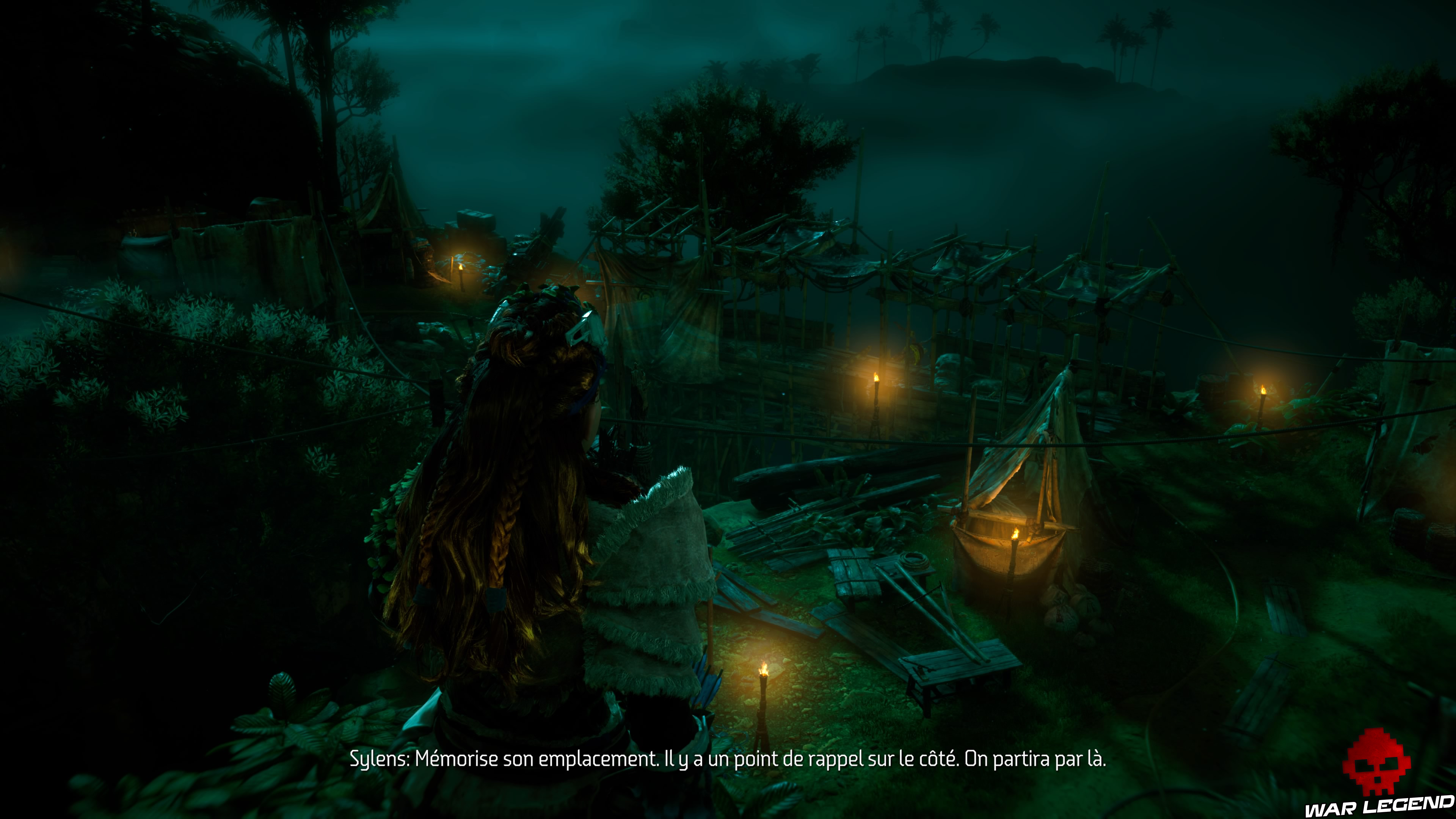 Escaladez la paroi que Sylens vous indique à l’extrême sud-ouest puis interagissez avec le feu pour que la nuit tombe et que l’homme vous explique son plan. Engouffrez-vous dans la fissure, éliminez le veilleur qui est devant vous puis avancez dans le buisson sur la gauche et attendez qu’un autre vienne.