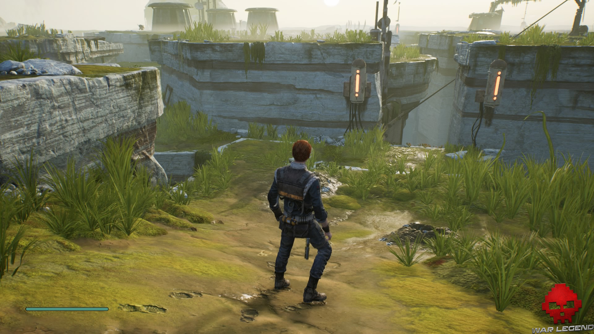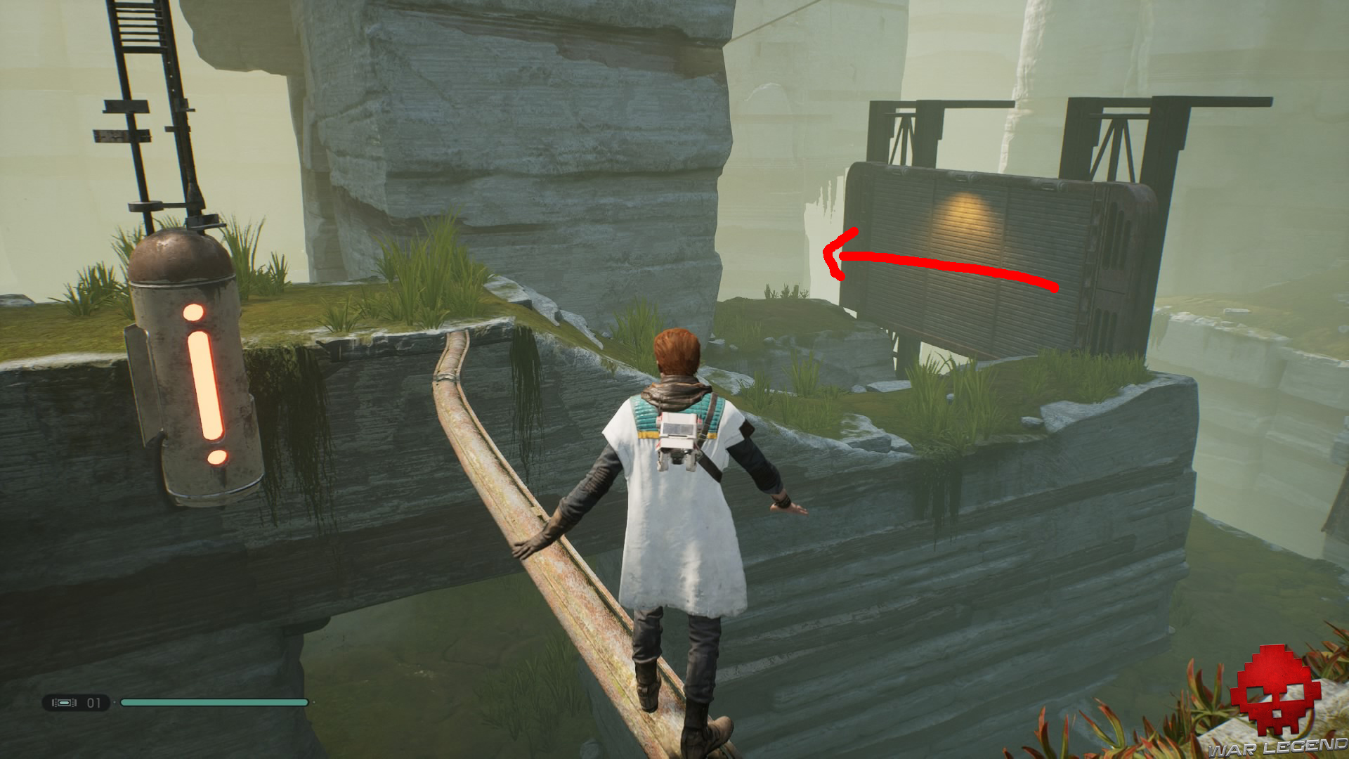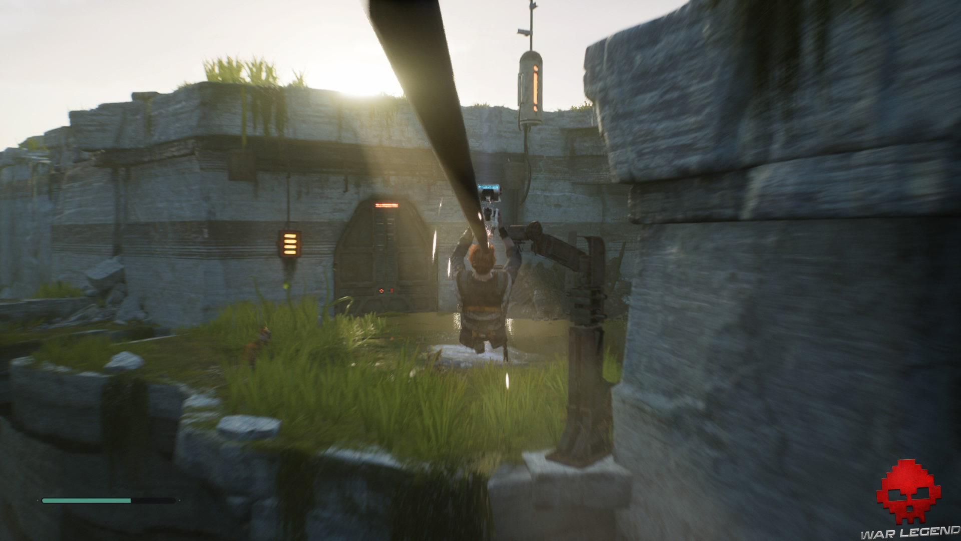 Une fois en haut, donnez un coup de sabre laser sur les tuyaux électrifiés devant vous pour déclencher une cinématique dans laquelle BD-1 vous apprend à vous soigner.