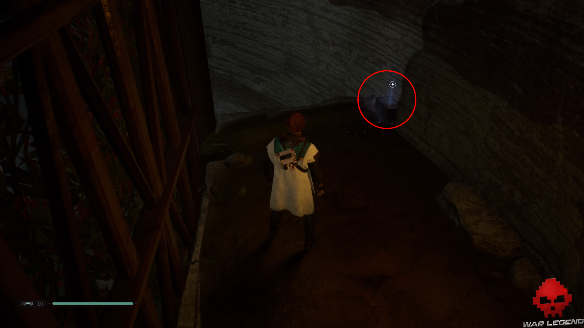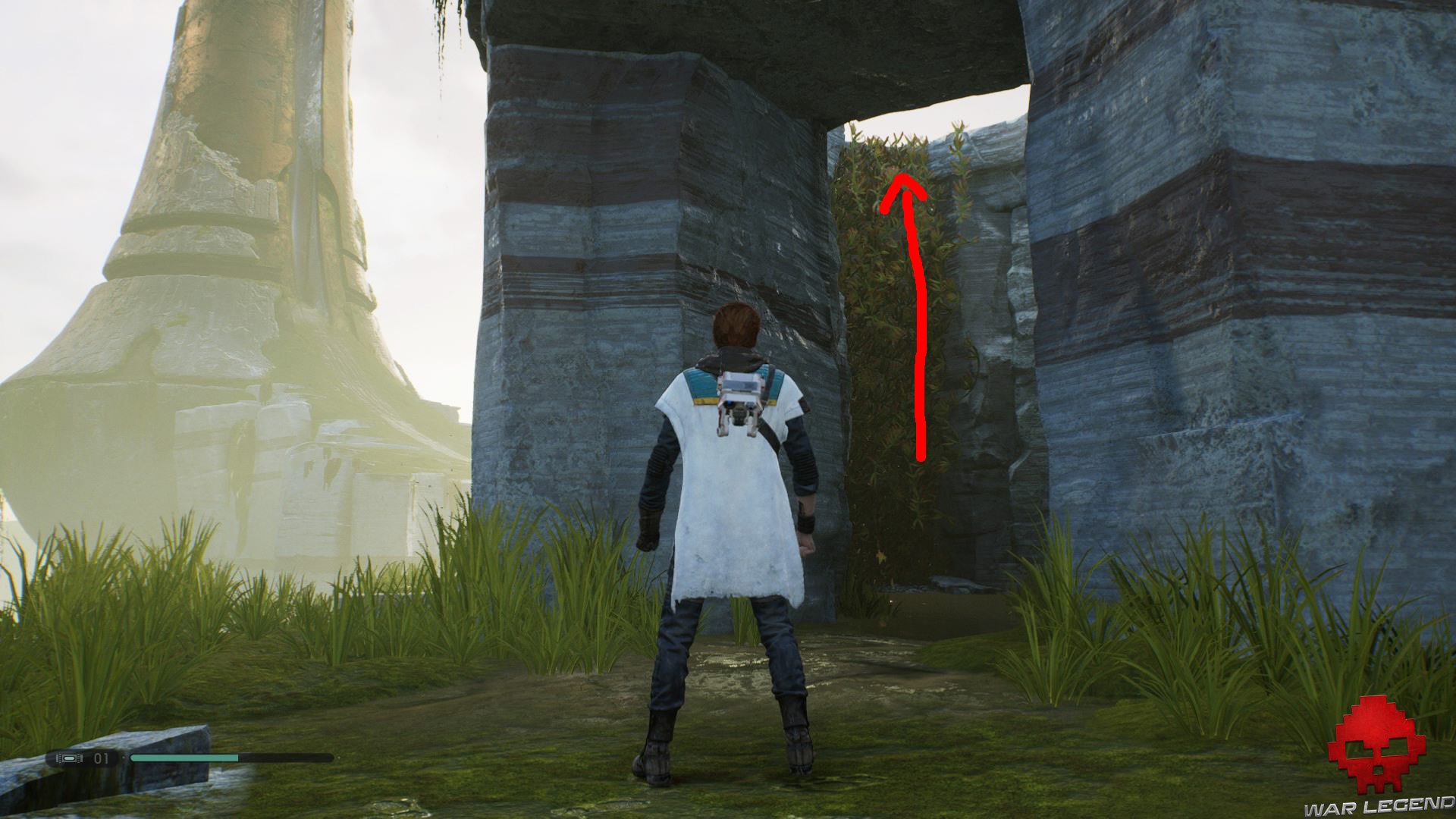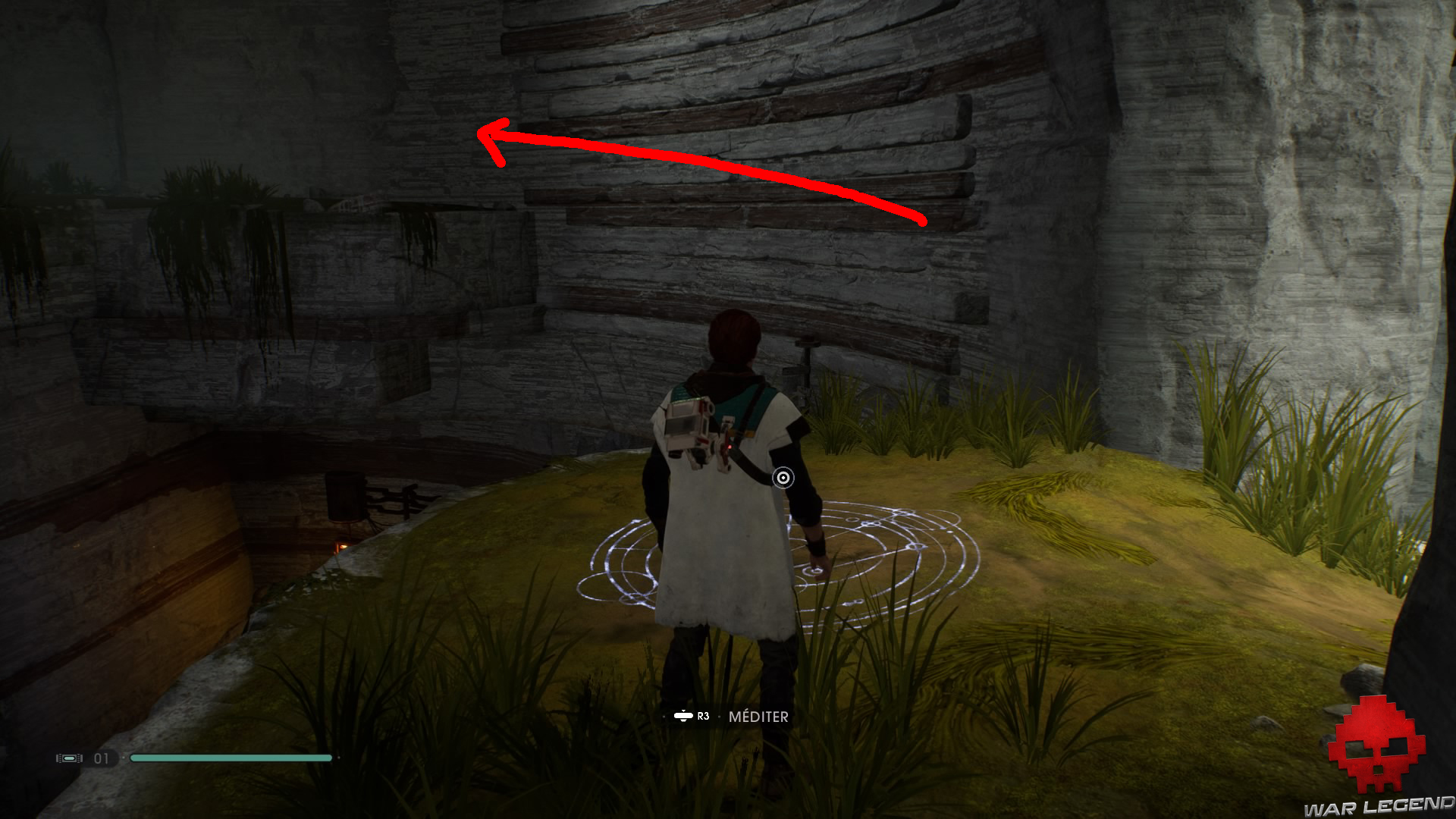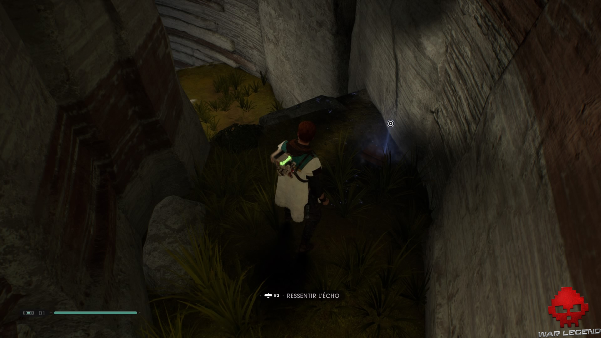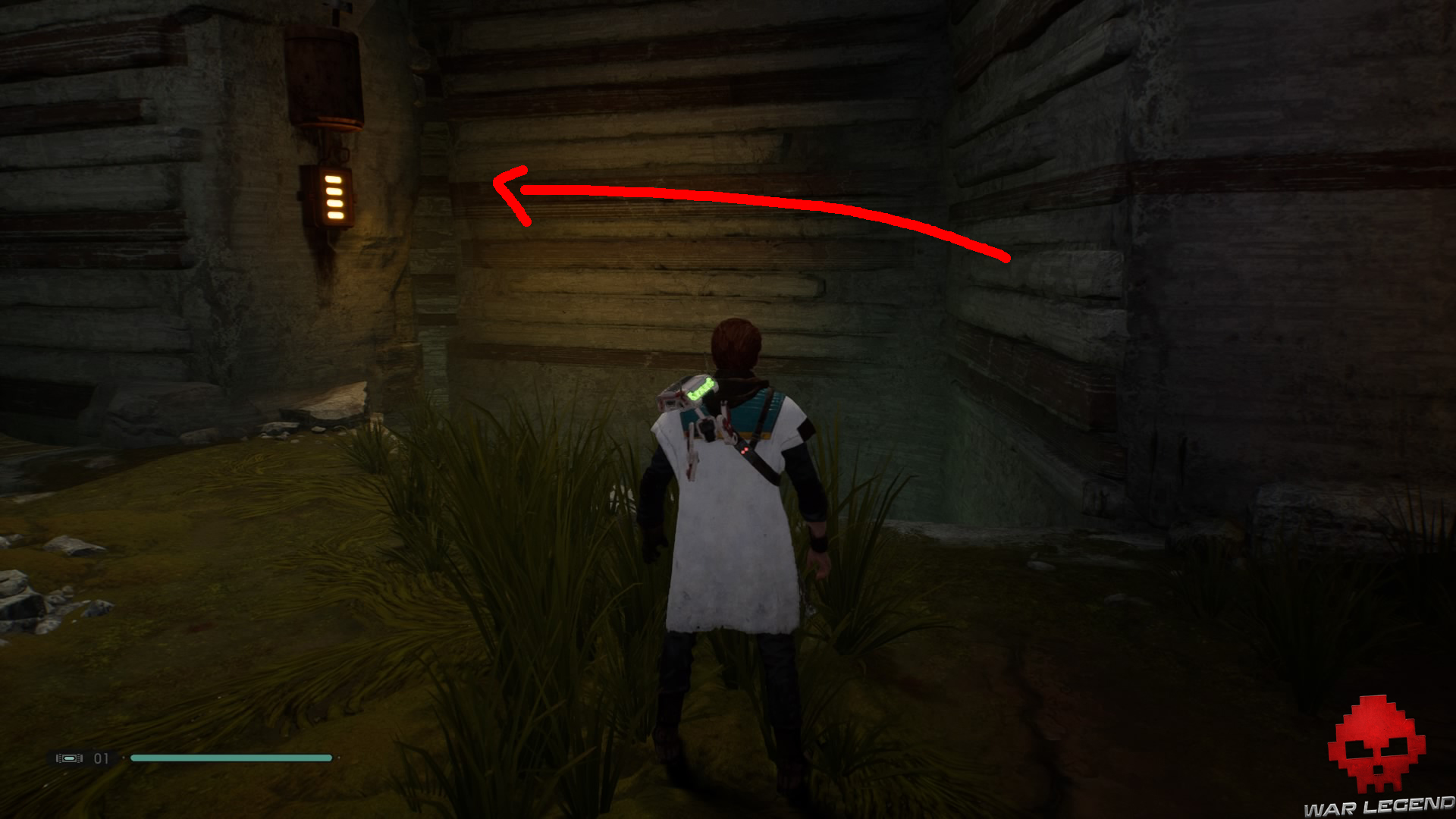 Allumez votre sabre pour vous éclairer dans la pénombre, puis grimpez sur le mur à l’aide du lierre.