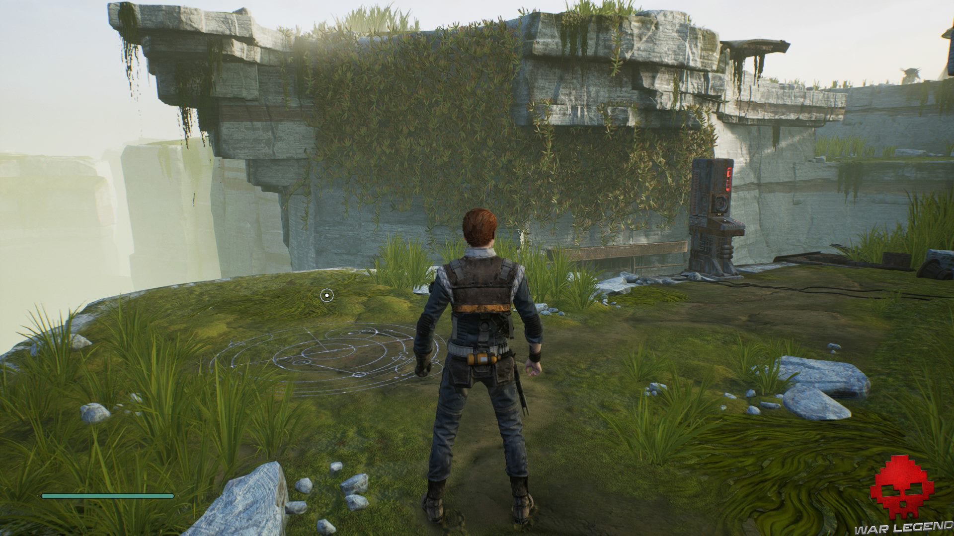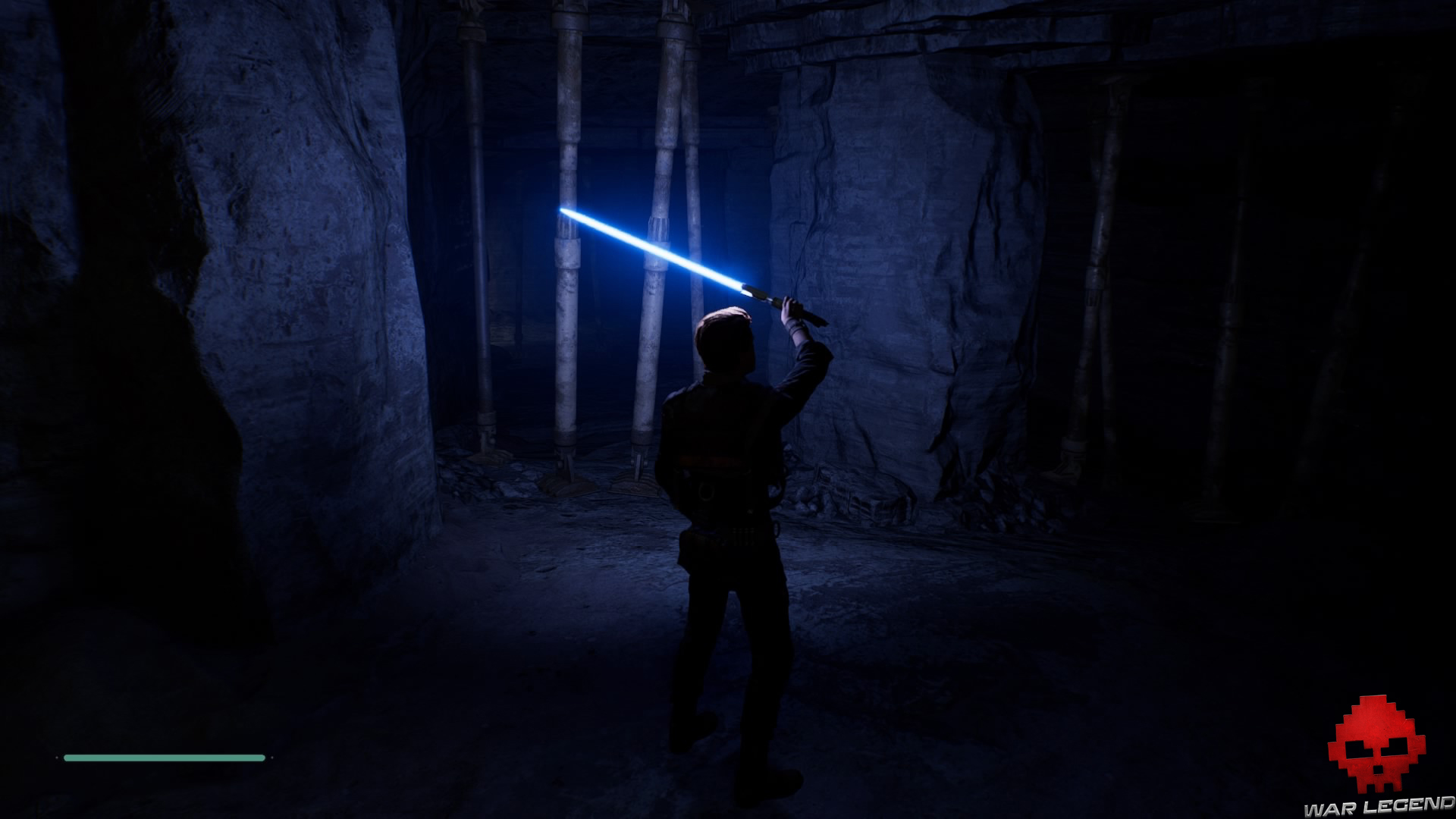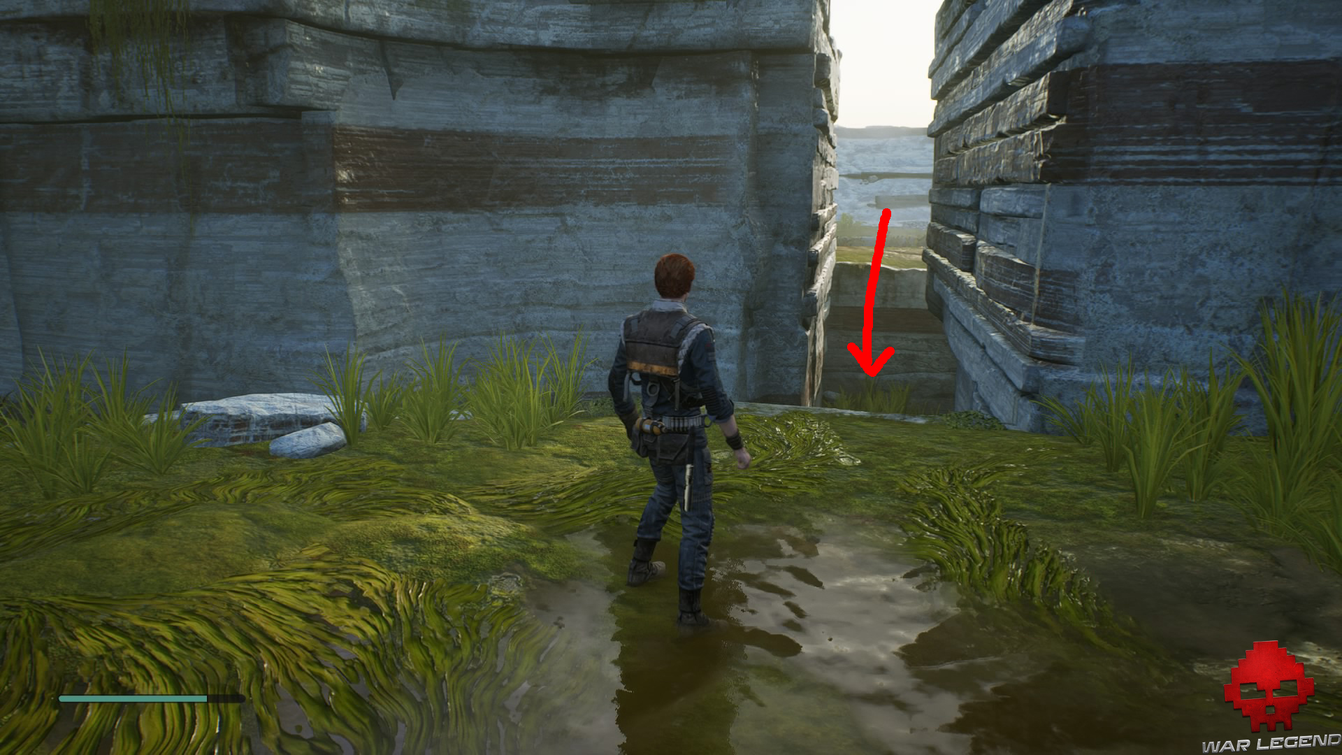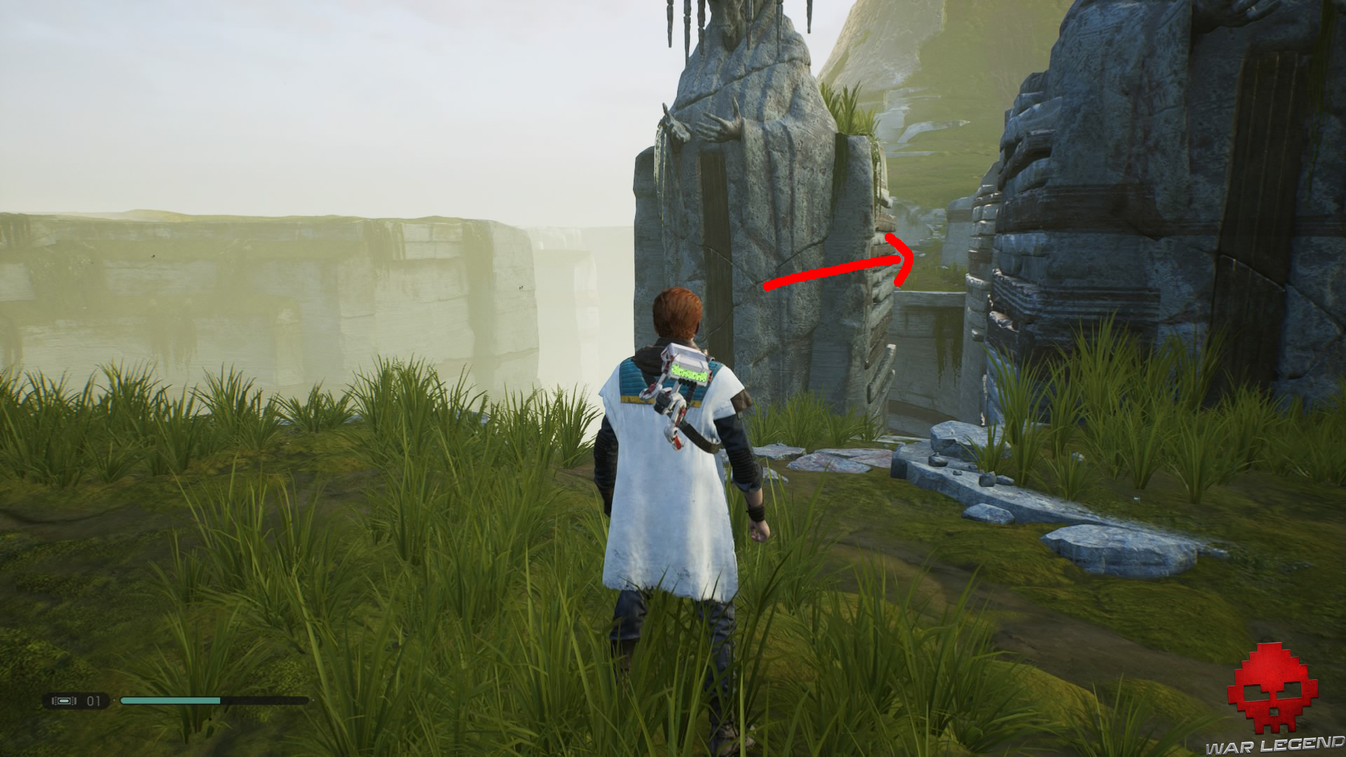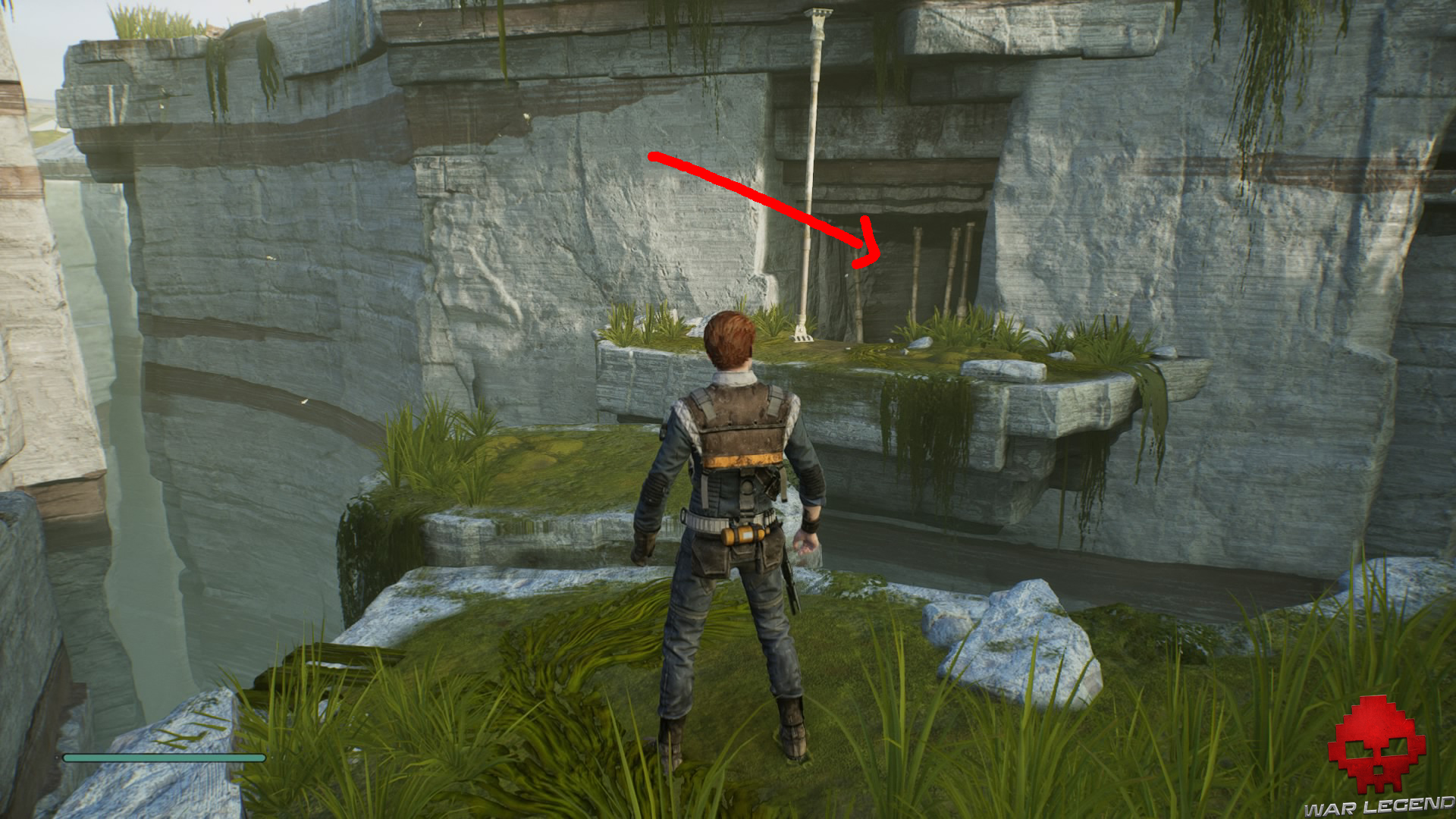 Allumez votre sabre pour vous éclairer dans la pénombre, puis grimpez sur le mur à l’aide du lierre.