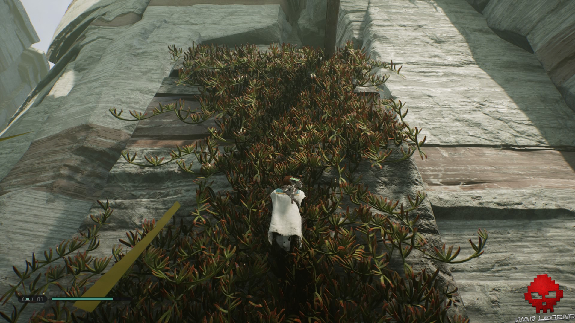 Une fois en haut, dirigez-vous vers la tyrolienne tout au bout — en prenant soin d’éviter les trous — afin de rejoindre rapidement le vaisseau.