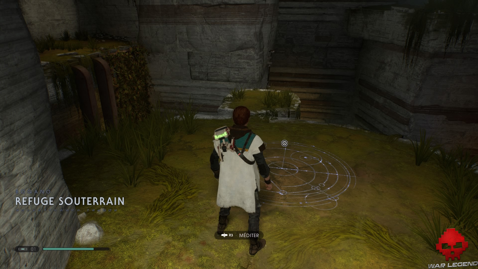 Une fois vaincu, continuez votre chemin jusqu’aux plantes grimpantes. Montez dessus, puis pénétrez dans le refuge souterrain pour débloquer un nouveau point de méditation.
