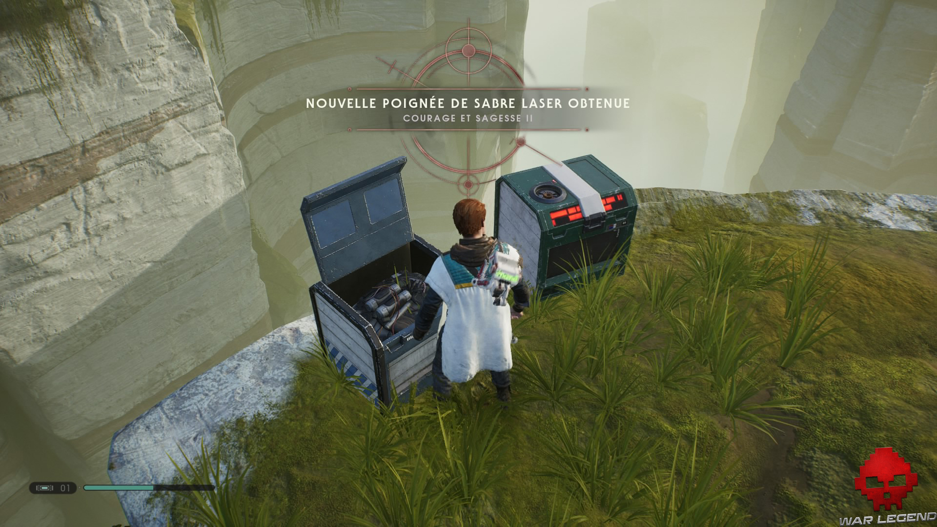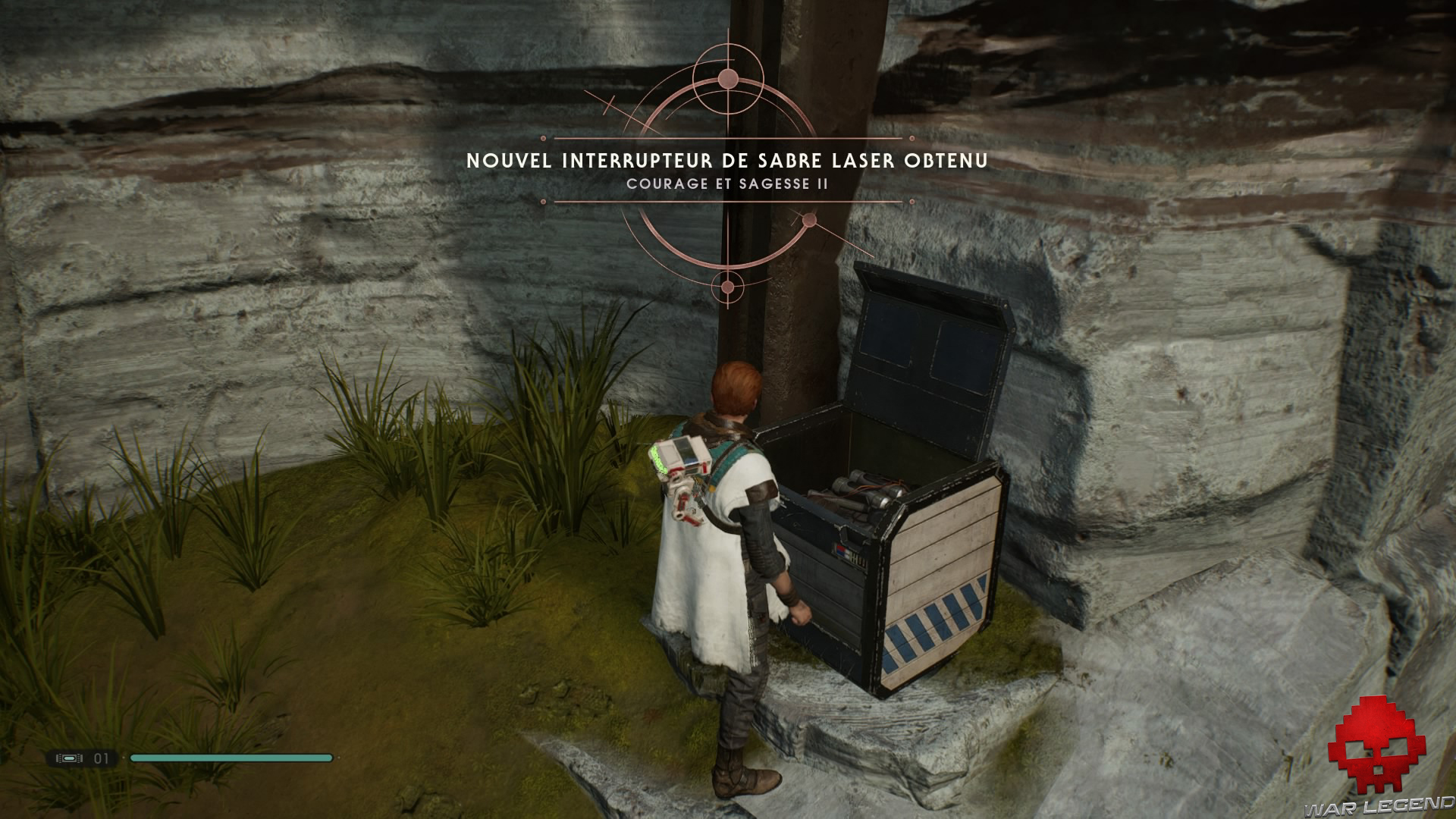 Ensuite, prenez à gauche pour ouvrir le coffre et débloquez un nouvel émetteur (objet cosmétique) pour votre sabre laser.