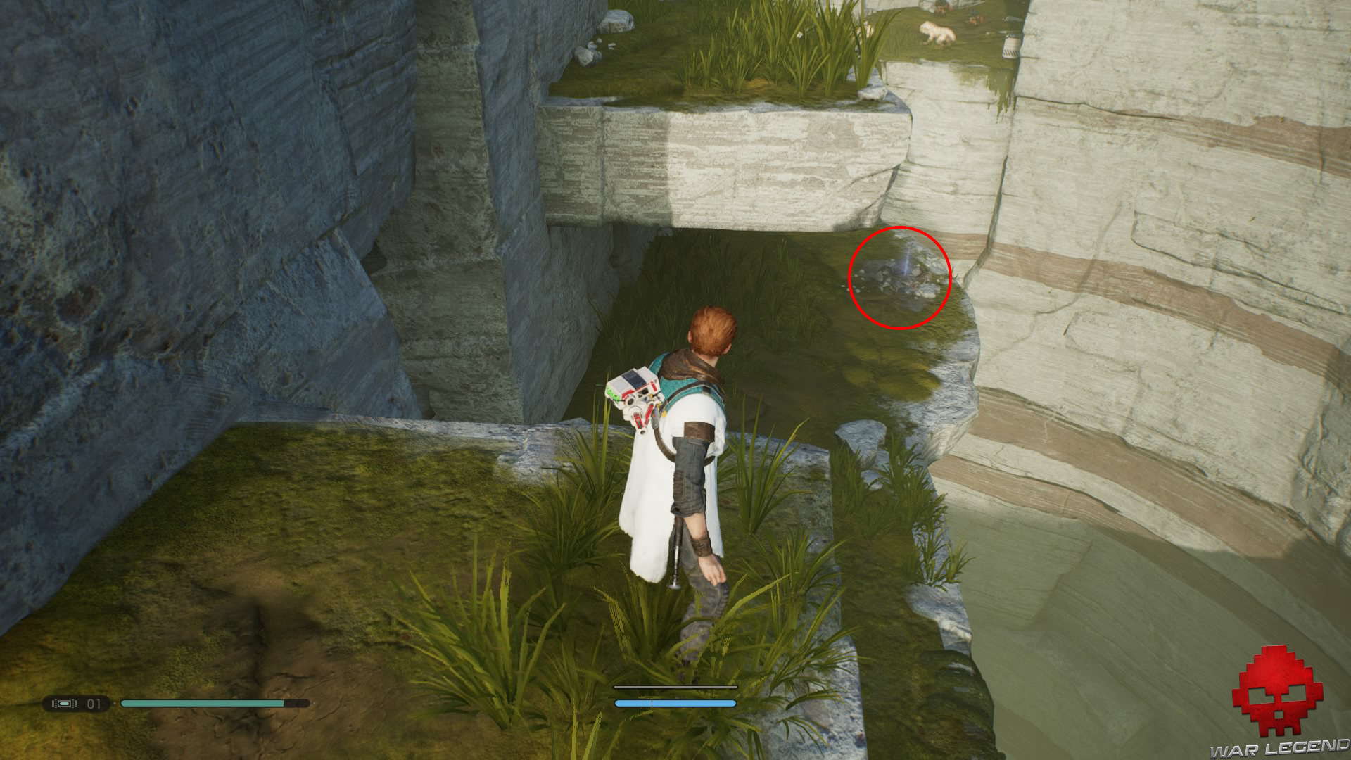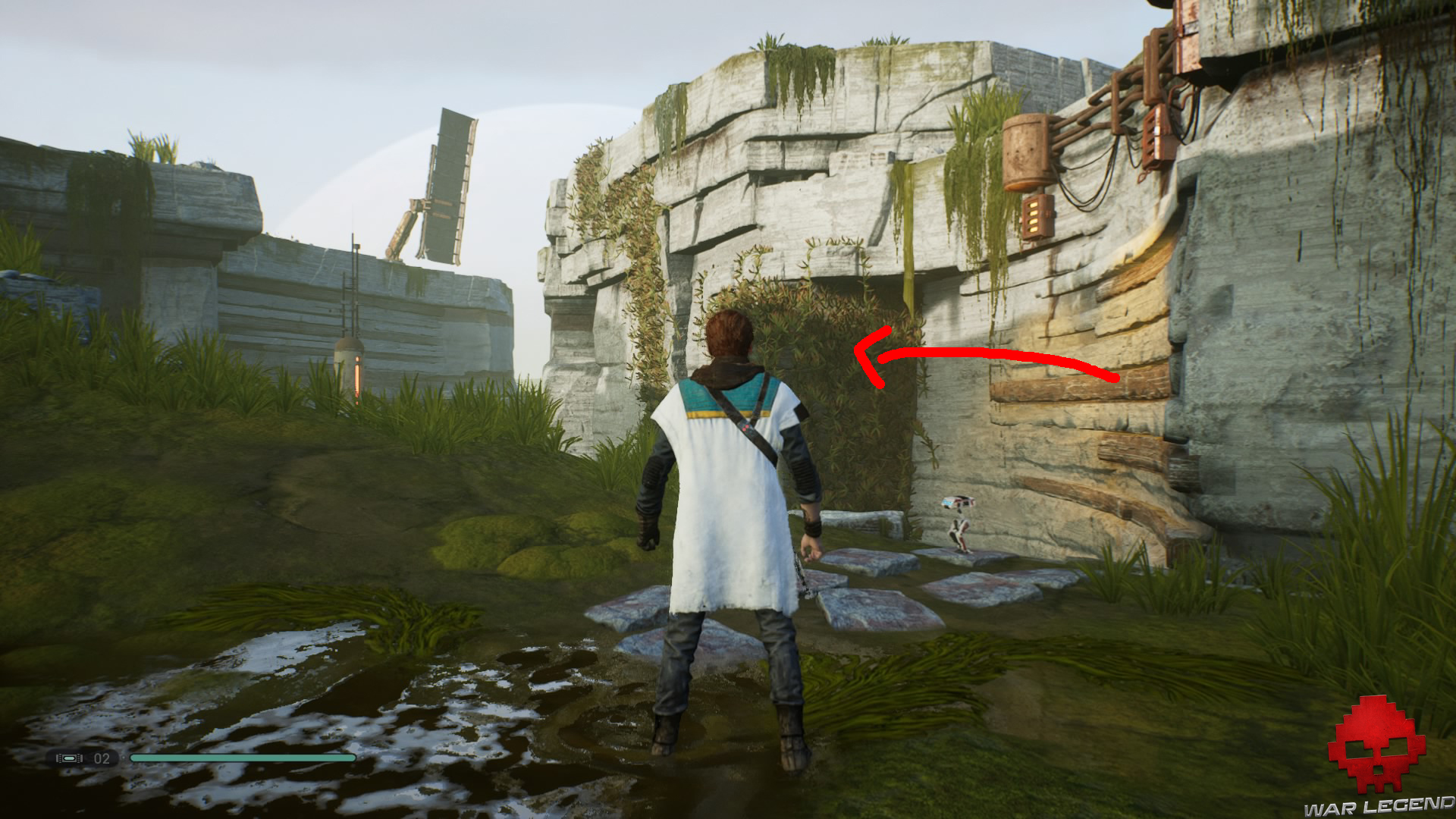 De là, vous allez faire la rencontre de BD-1 qui vous ouvrira la voie en abaissant un pont métallique, vous permettant de grimper sur les lianes. Une fois en haut, prenez à gauche pour aller récupérer votre premier message écho qui se situe en bas, juste après les créatures sauvages.