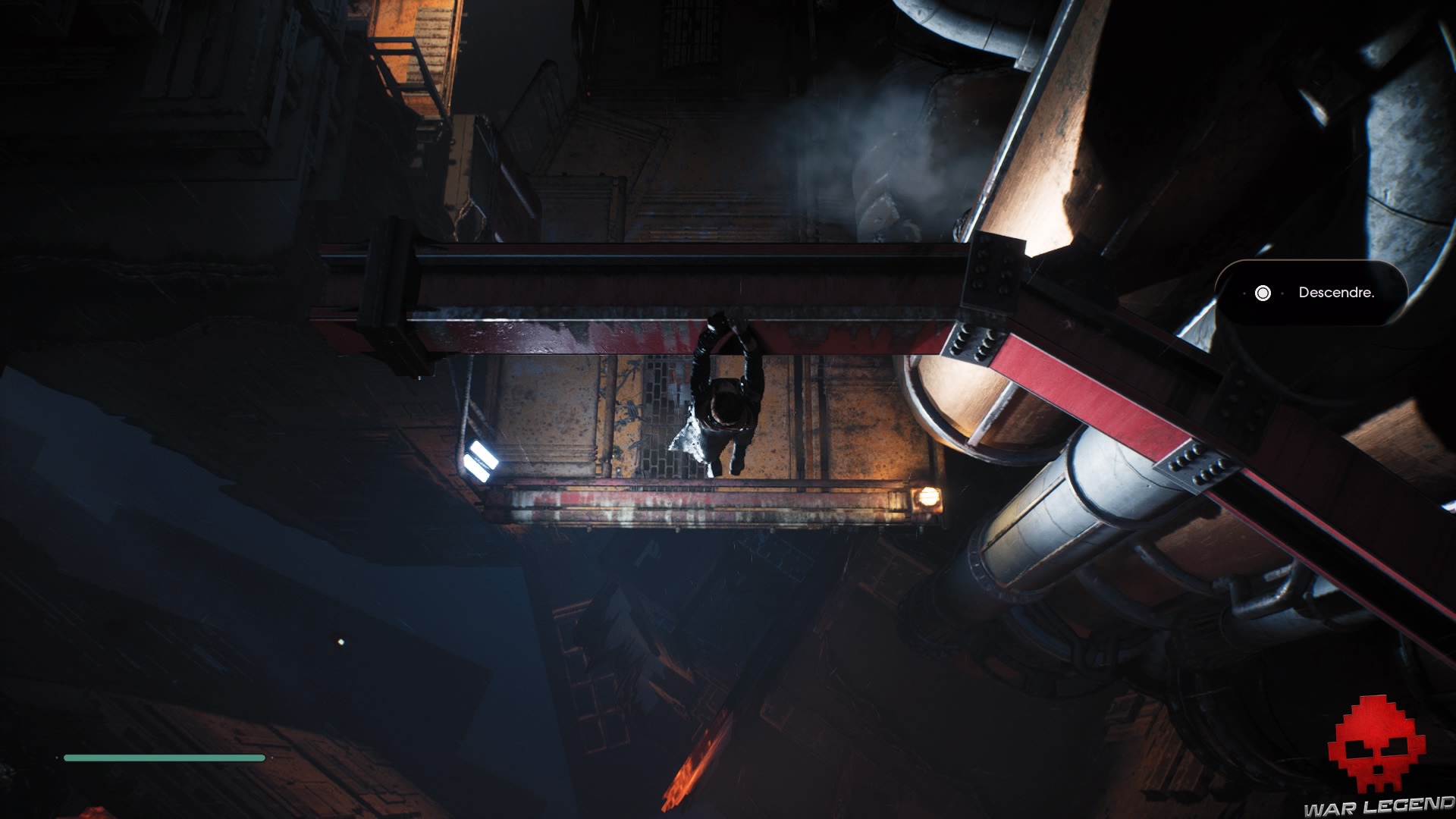Descendez, en vous laissant tomber sur la grille d’en dessous, puis longez sur la gauche. Tombez dans le genre de toboggan et laissez-vous glisser jusqu’en bas.