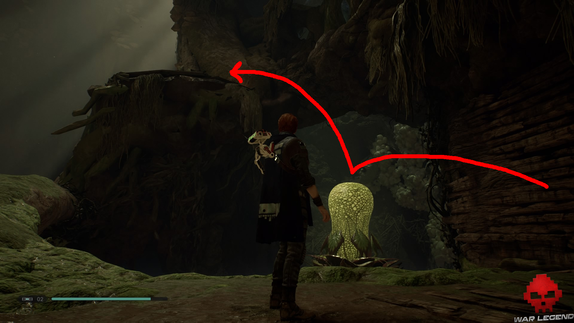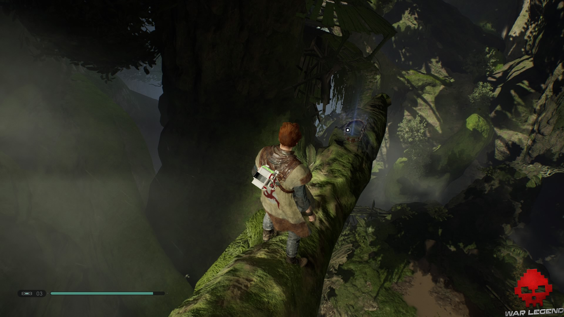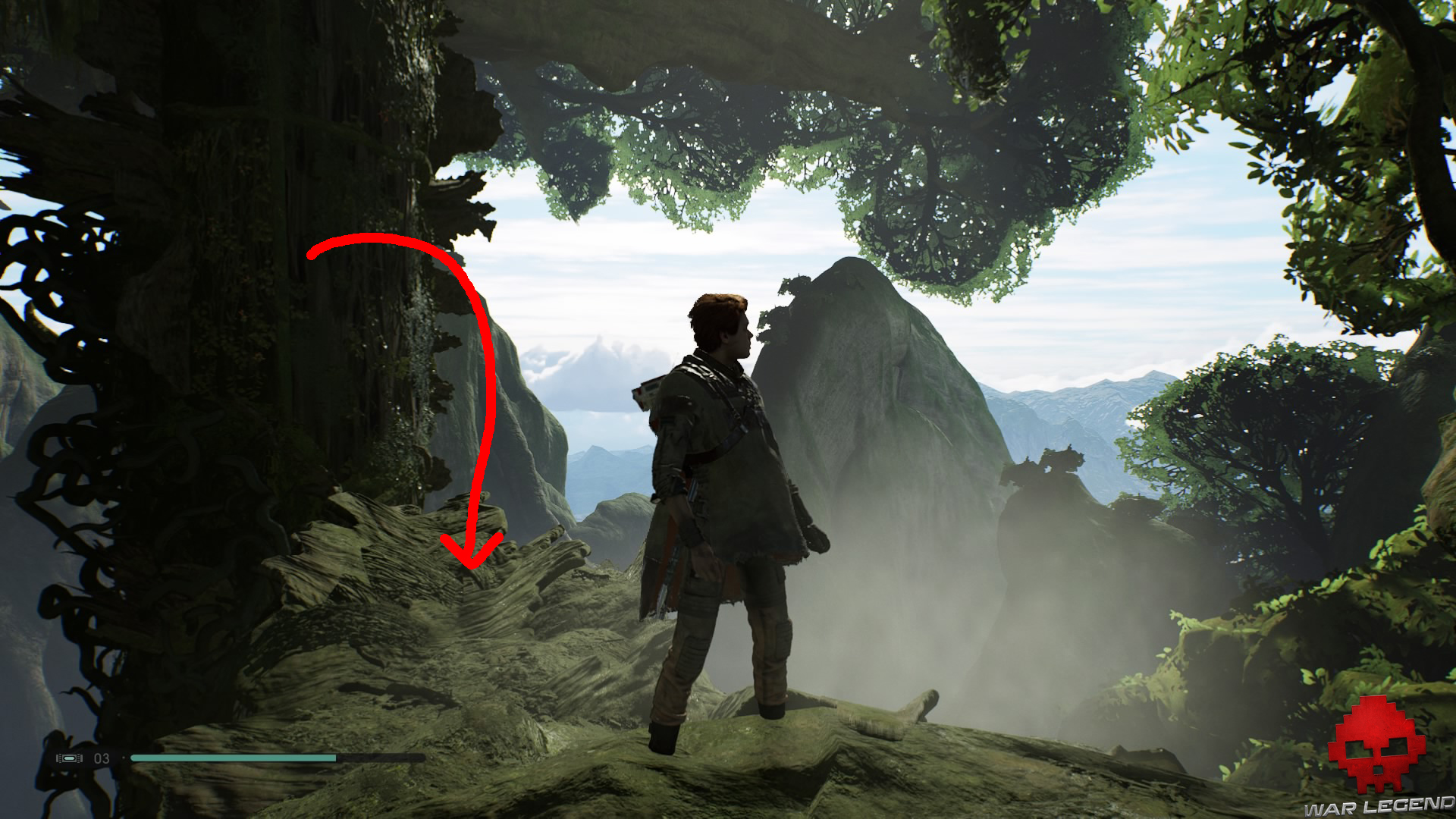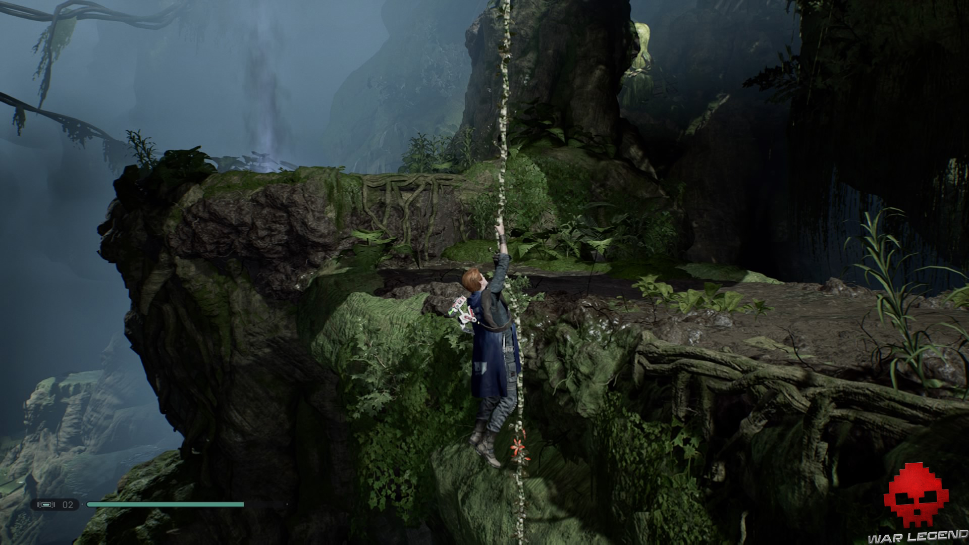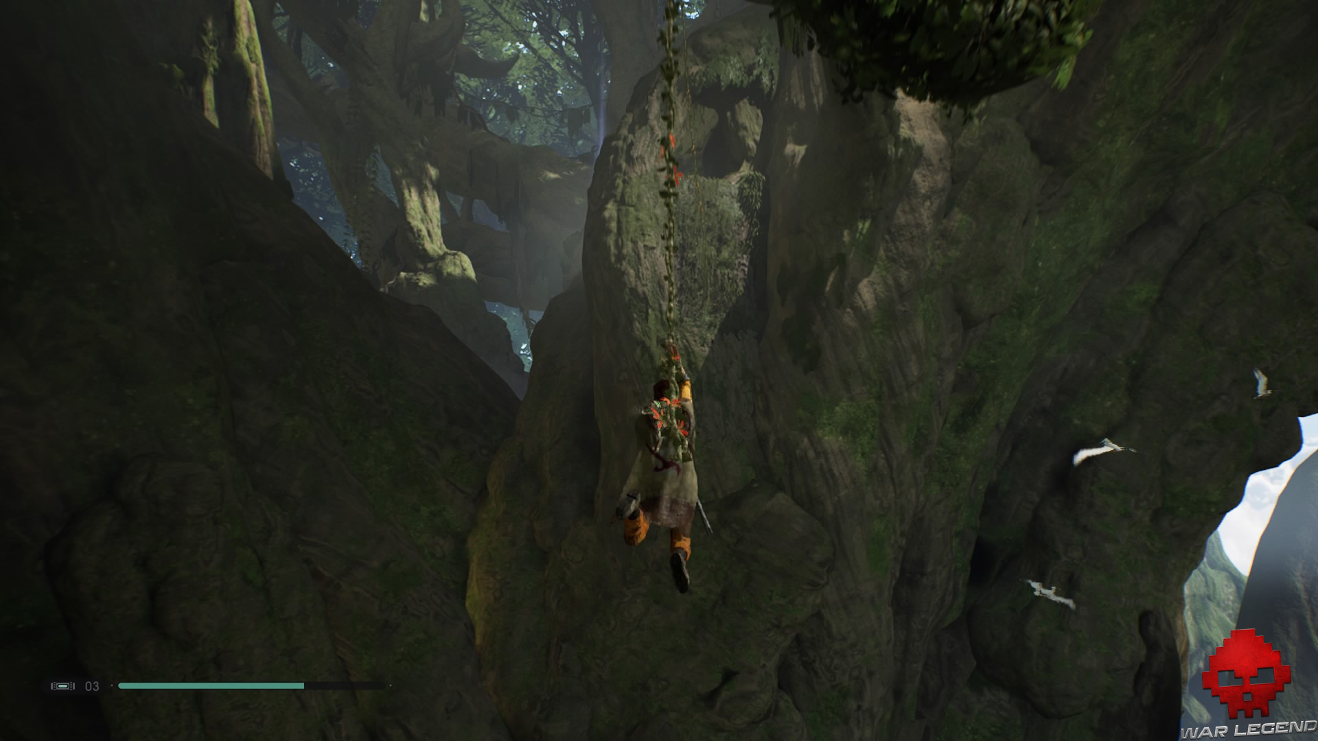 Ensuite, rebroussez chemin et dirigez-vous vers la liane qui pend au-dessus du vide. Balancez-vous et sautez sur le tronc d’arbre suspendu situé de l’autre côté.