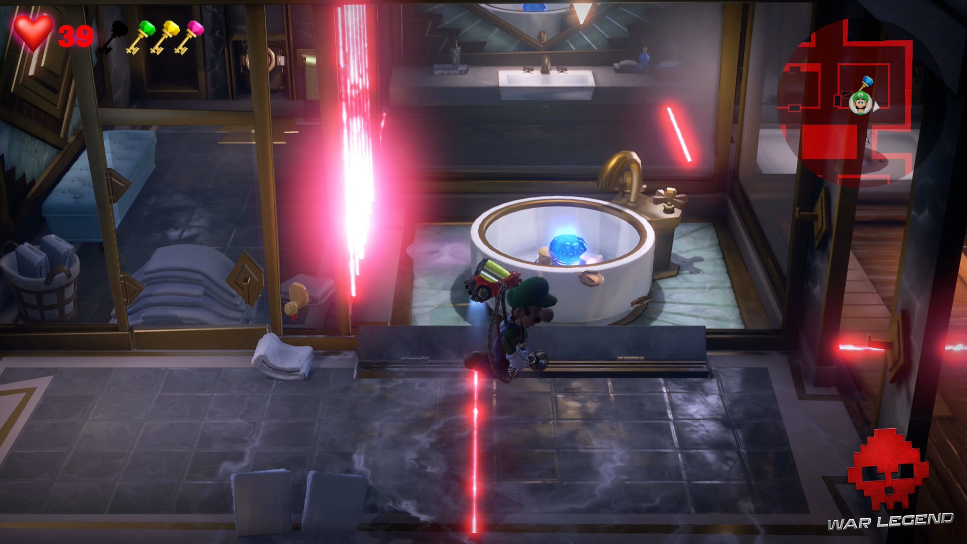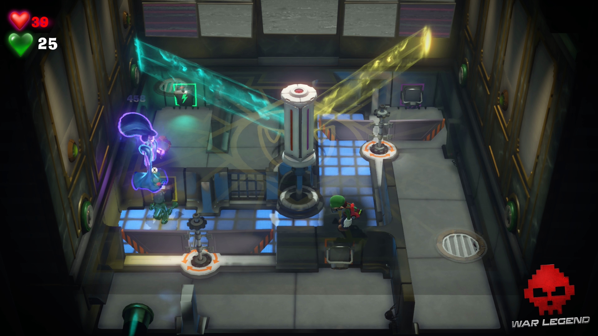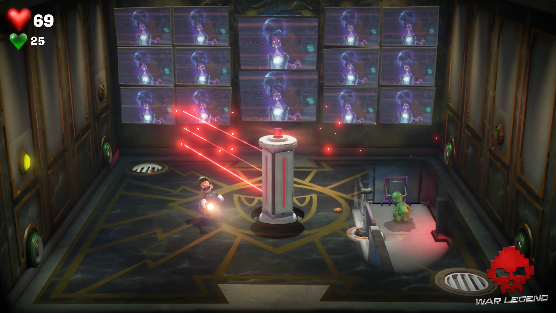 De son côté, Luigi doit esquiver les attaques du boss. Quand Ambre Brusquade plante son miroir dans le sol, il est temps de contre-attaquer avec le Spectroflash, mais il est possiblement risqué de drainer ses points de vie si des murs laser sont encore actifs. N’hésitez pas à lâcher prise si nécessaire.