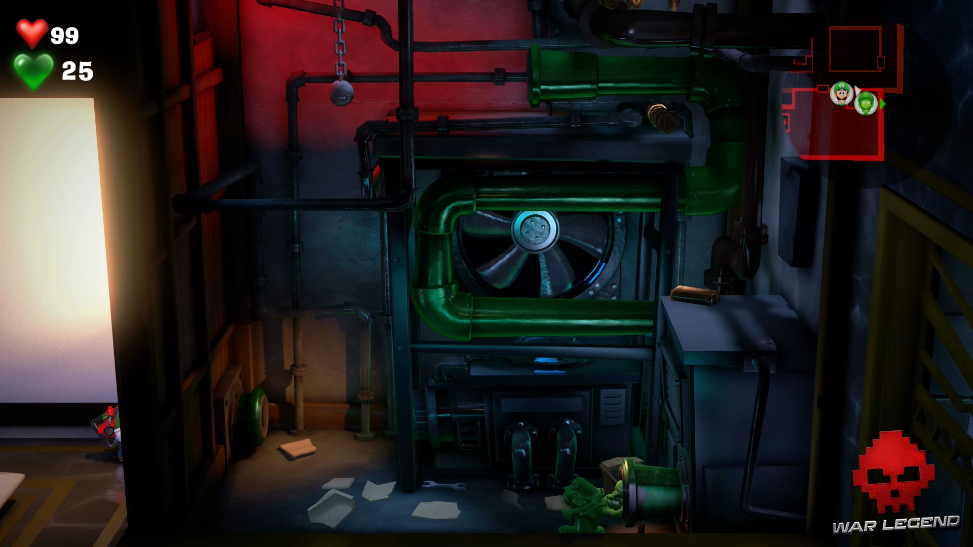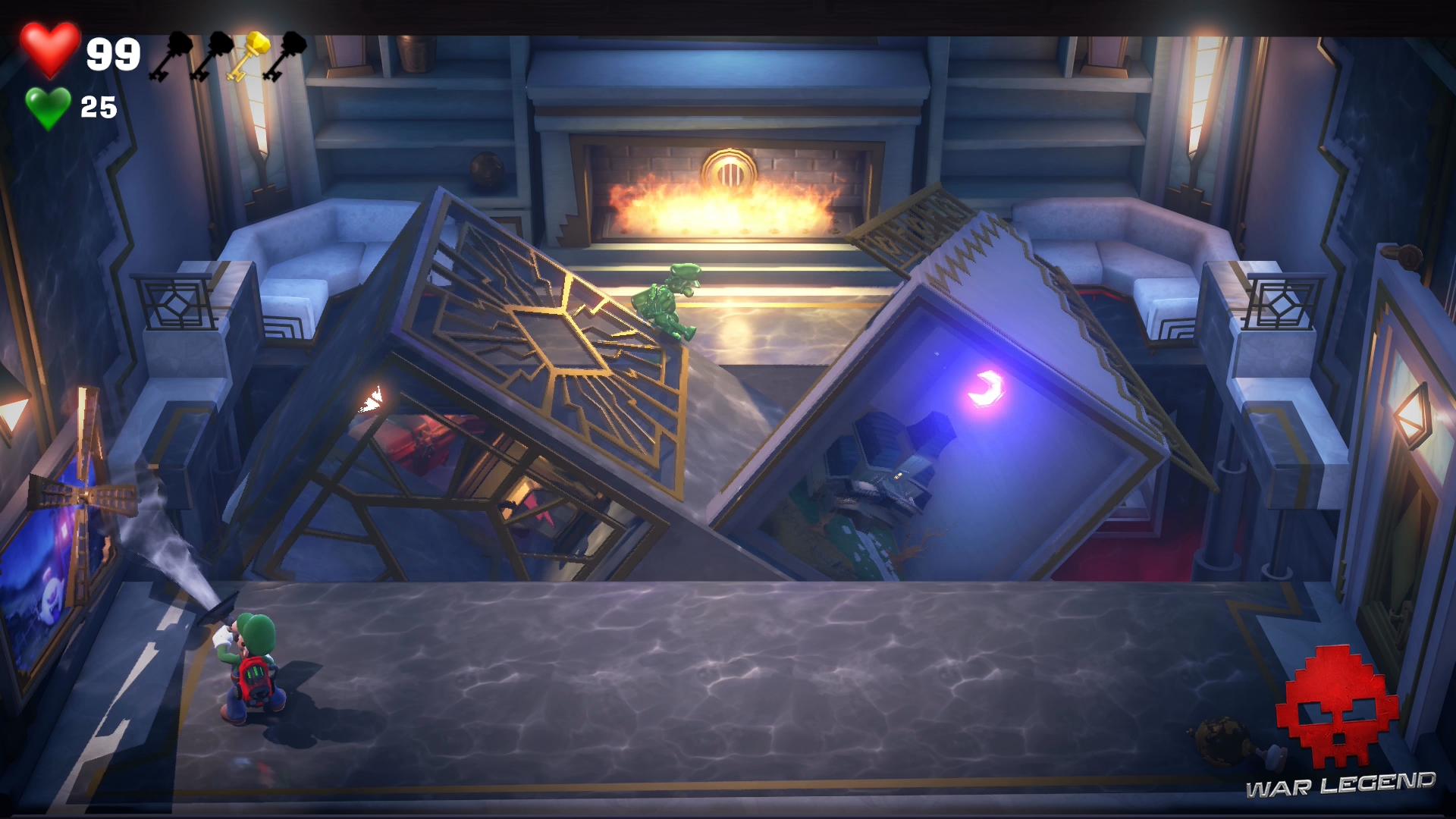 Séparez Luigi et Gluigi de chaque côté de la plateforme tournante. Faites tourner la plateforme jusqu’à ce que l’interrupteur soit accessible pour celui du côté de la cheminée. Actionnez-le.