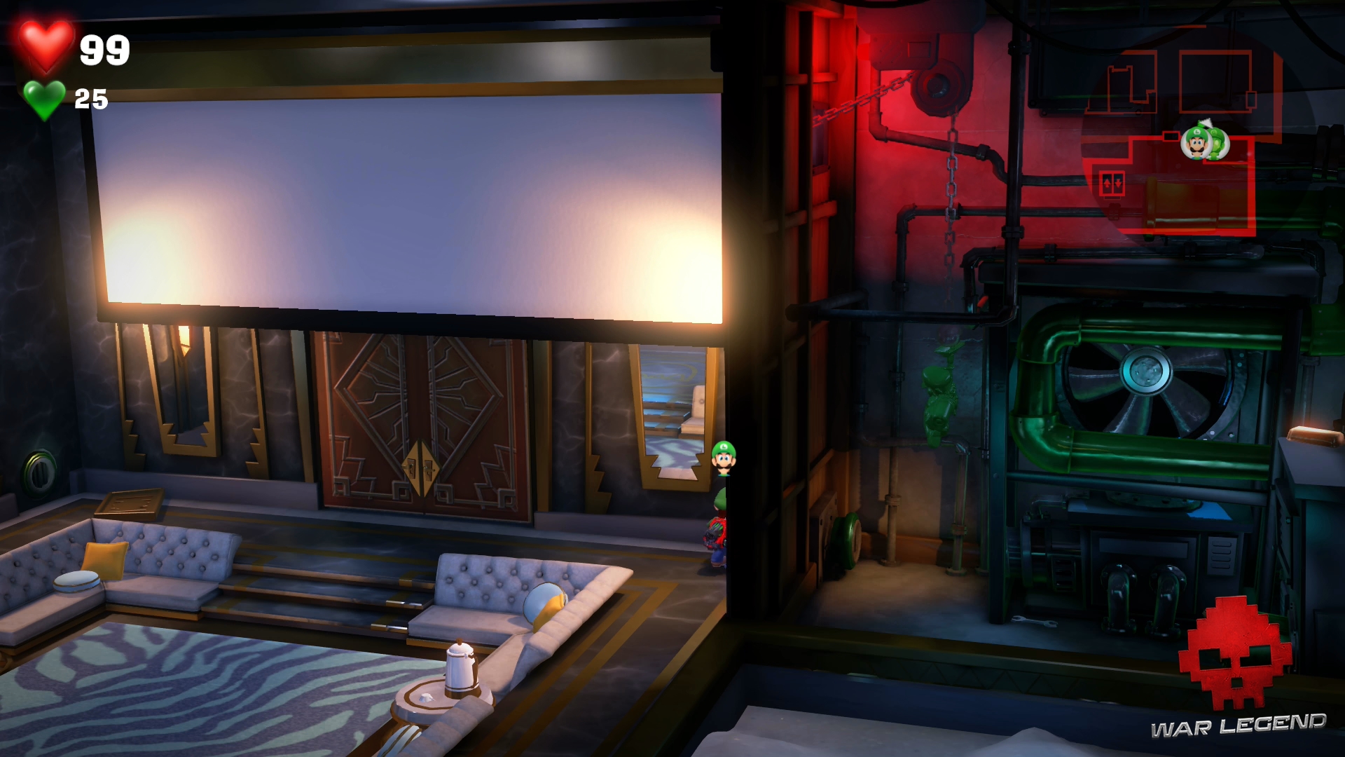La porte est cachée derrière l’écran de projection. Allez sur le mur à droite et arrachez la grille du mur. Envoyez ensuite Gluigi de l’autre côté.