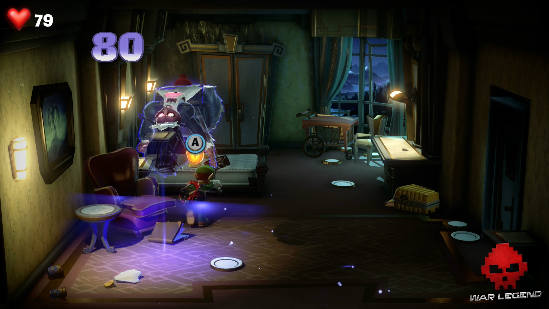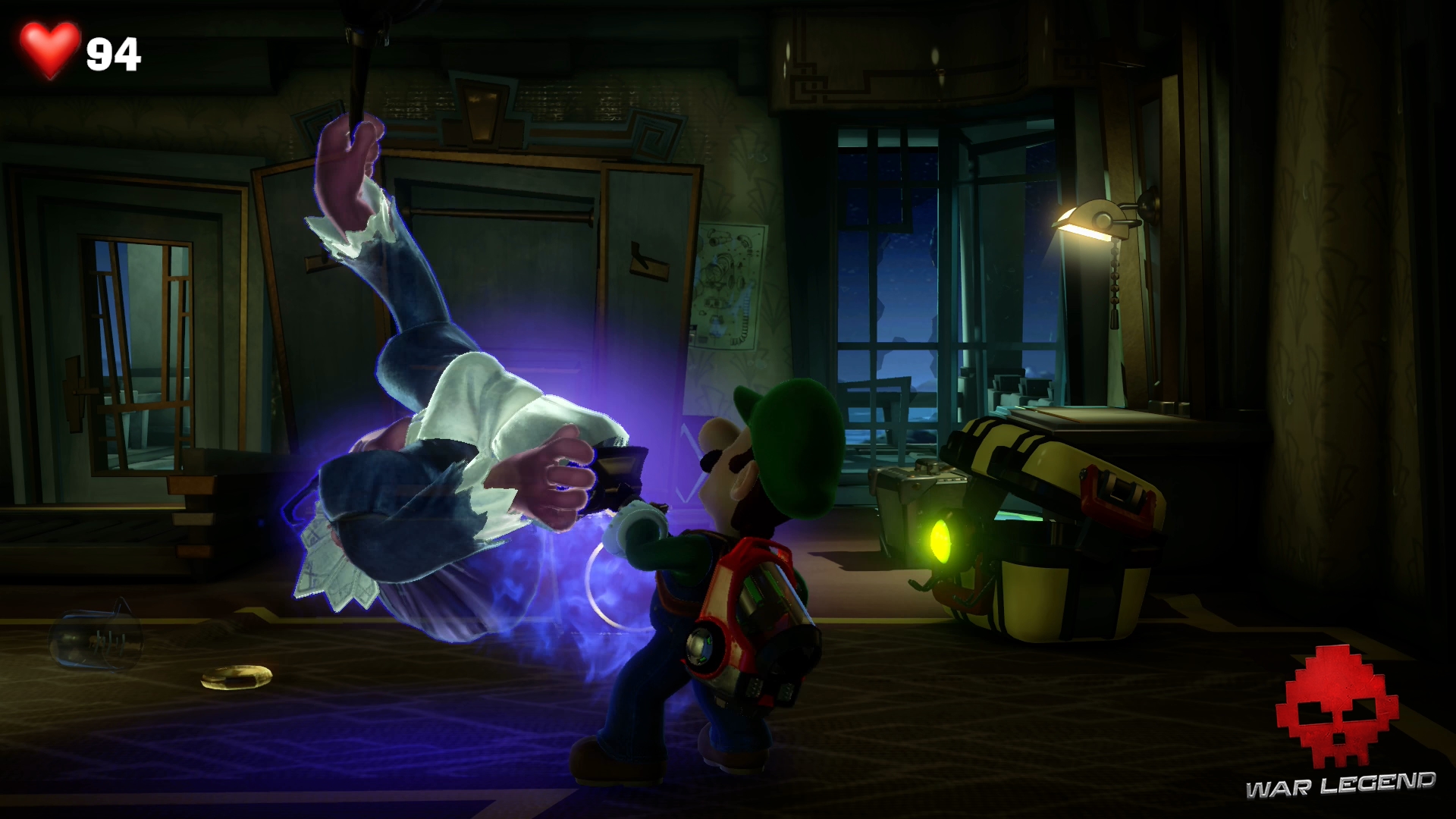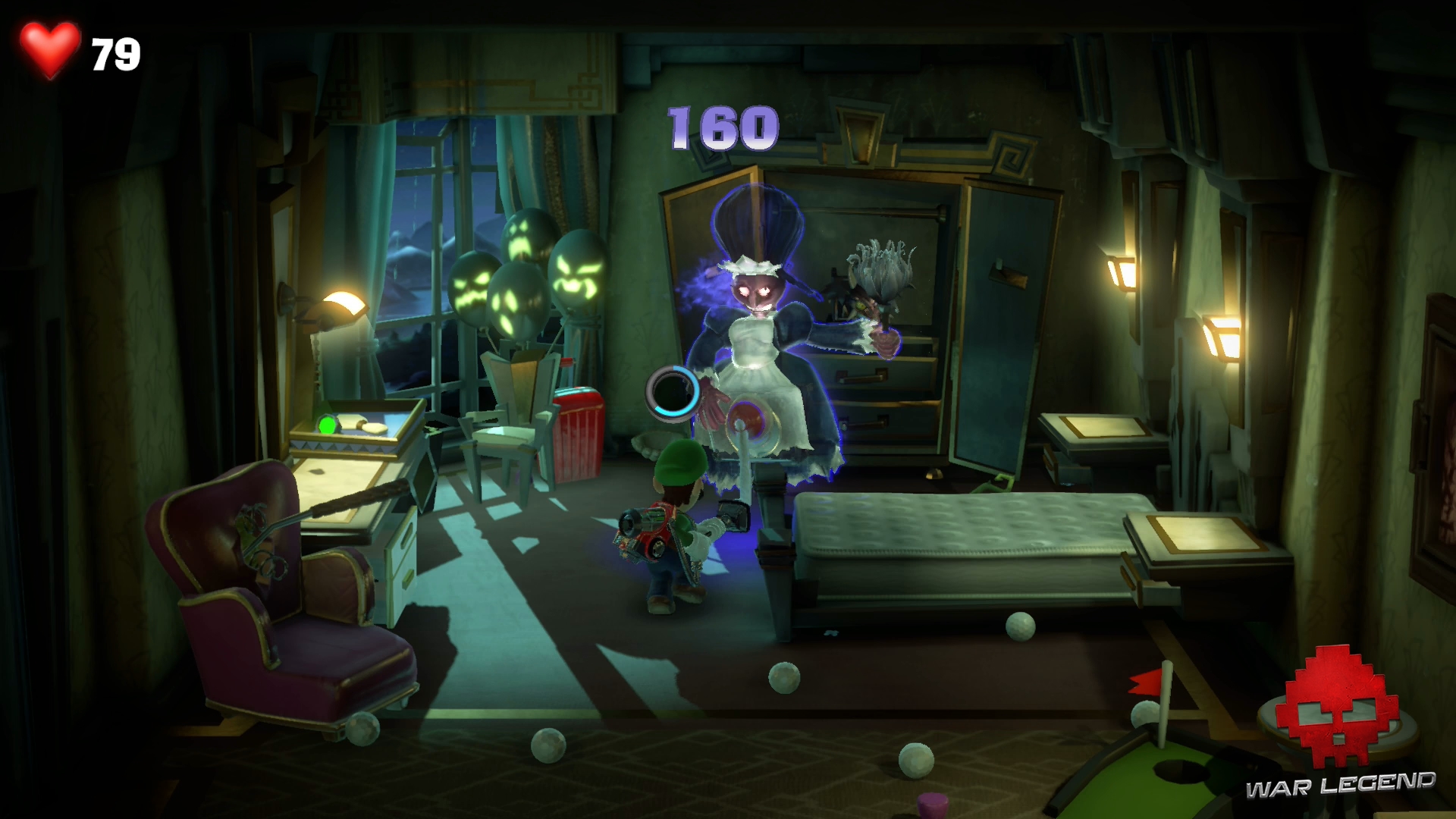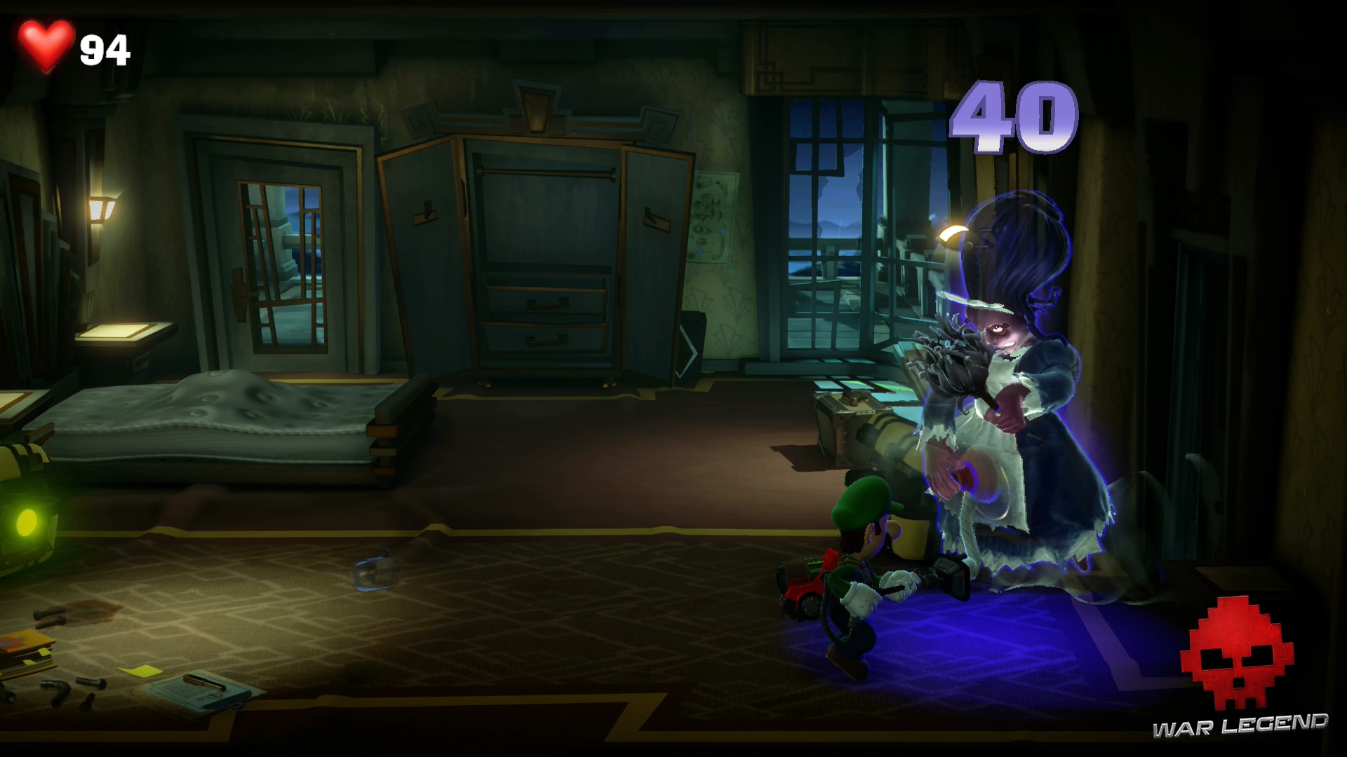 Dominique la Domestique a déniché la valise du professeur avant vous et la trouve très intéressante. En voyant Luigi, le fantôme boniche prend peur et traverse la pièce.