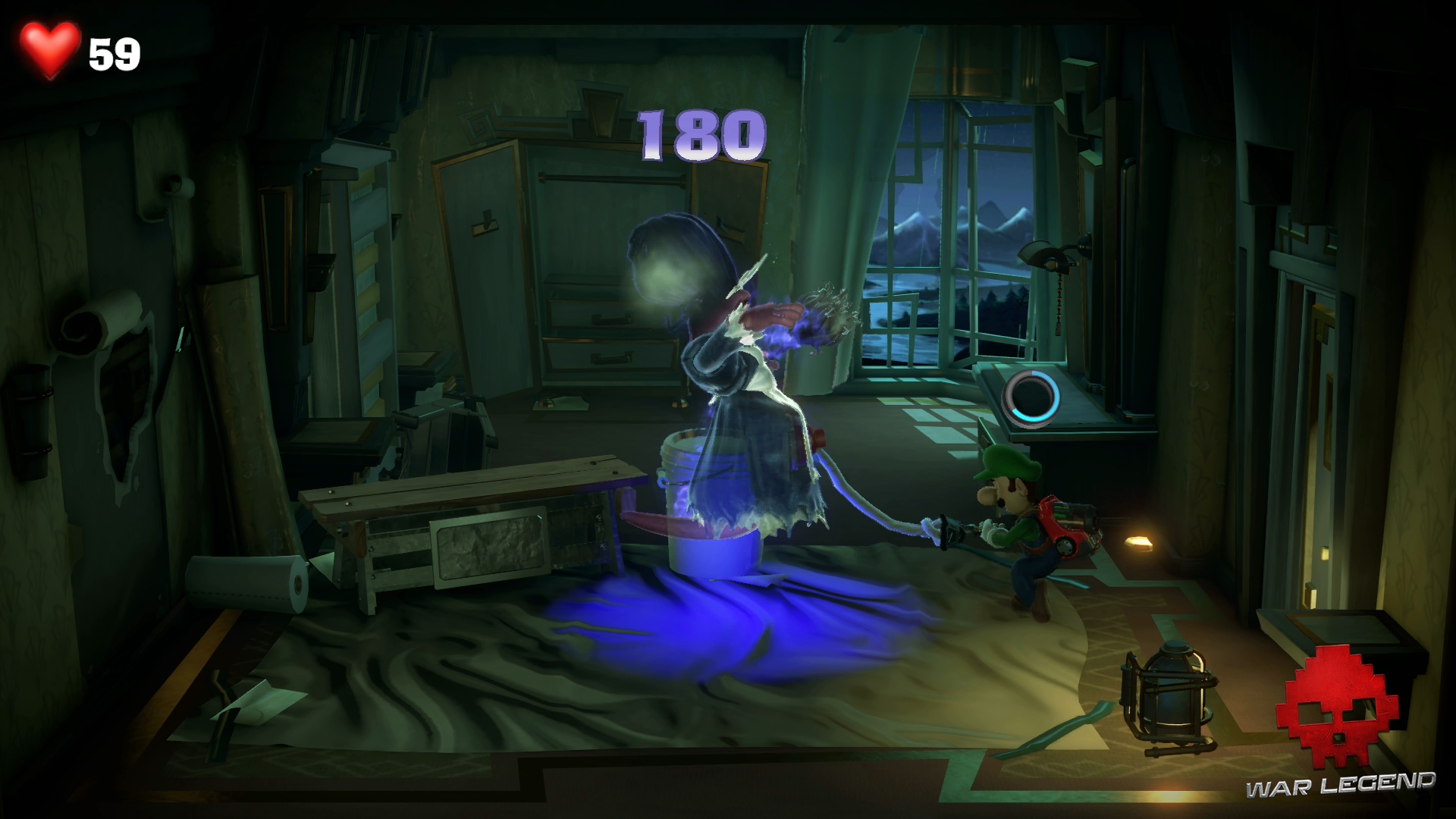 La valise qui est retenue dans son ectoplasme vous empêche de l’aspirer. Le cercle marqué dessus vous donne un indice : utilisez le lance-ventouses.