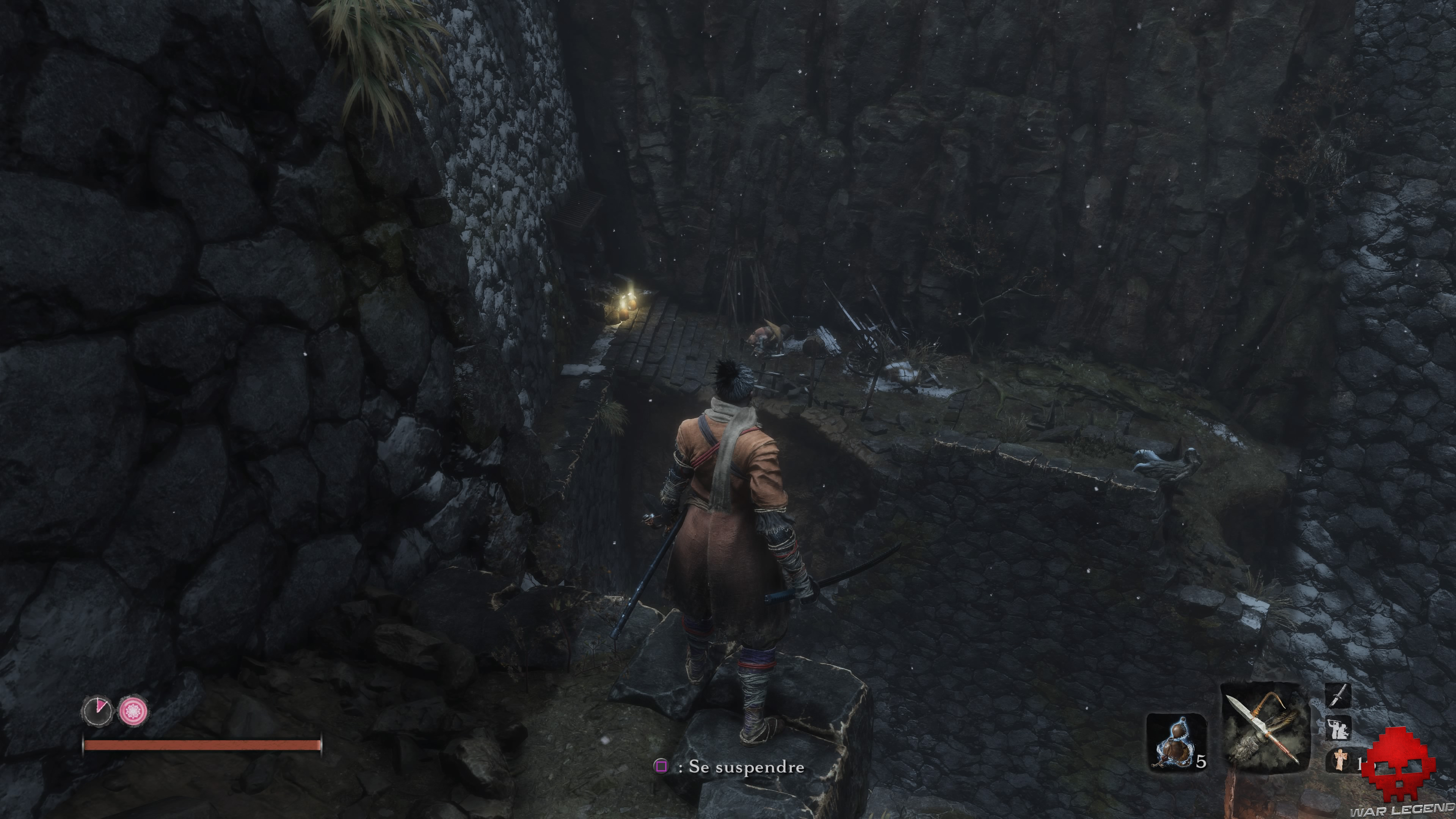 Suivez le chemin pour vous retrouver au-dessus de 3 adversaires qui n’attendent que votre lame. Faites le tour du trou pour trouver une donneuse d’alerte. Tuez-la en premier sans quoi vous vous retrouverez bien vite avec le double d’ennemis.