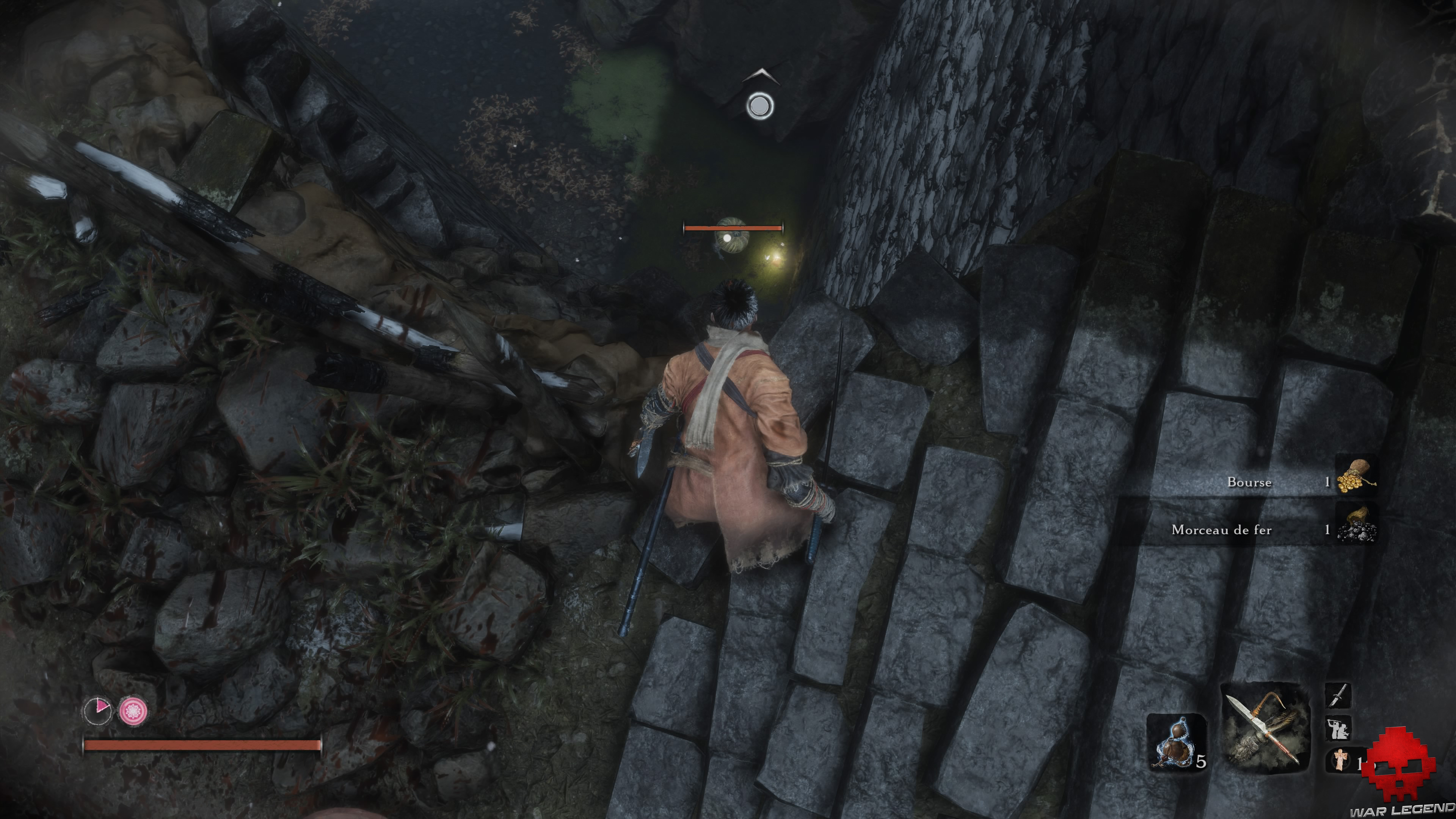 Récupérez 1 Bourse, 1 Morceau de fer et, en contrebas à côté d’un autre assassin dans l’eau, 1 Ballon Mibu d’esprit.