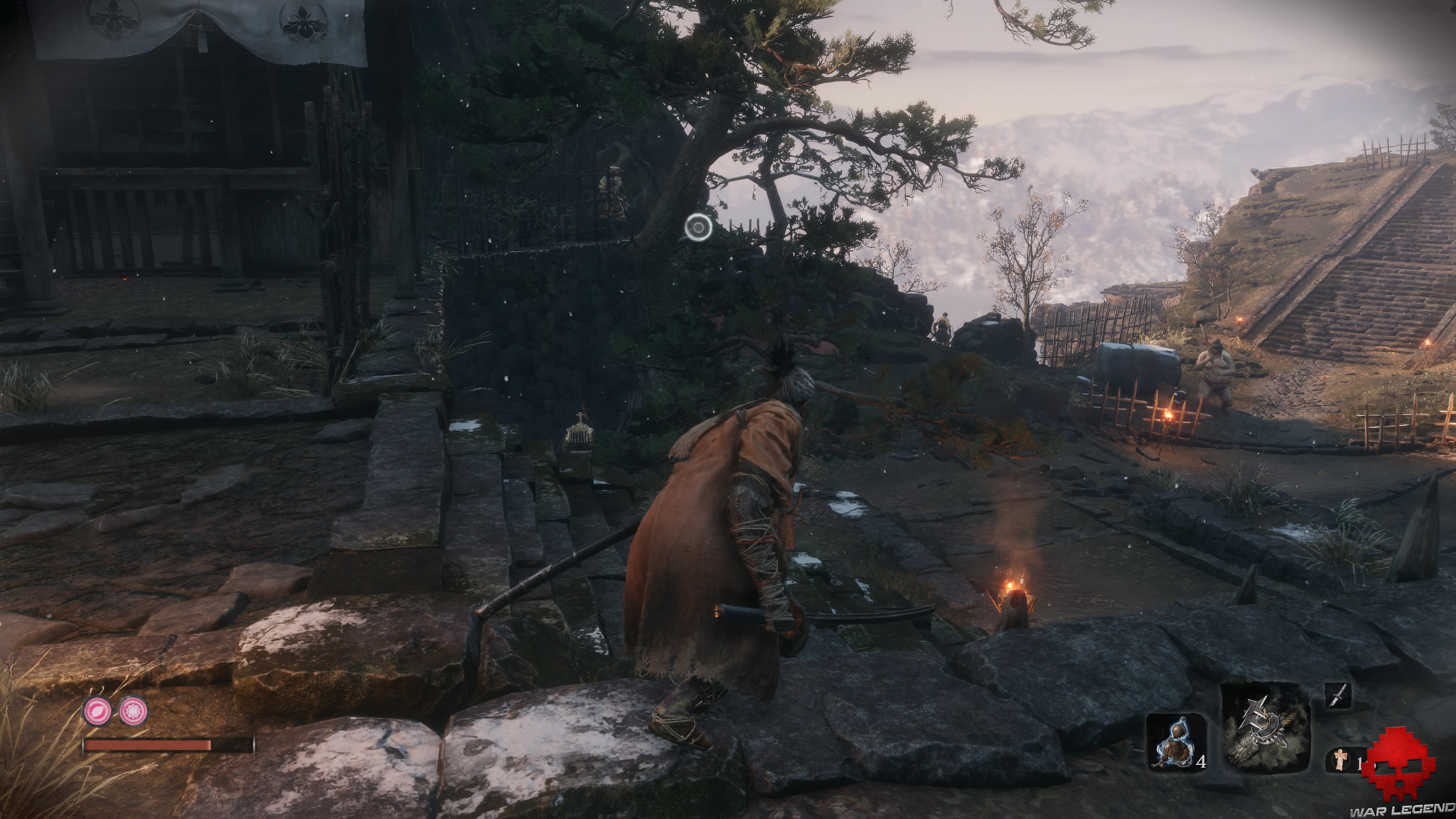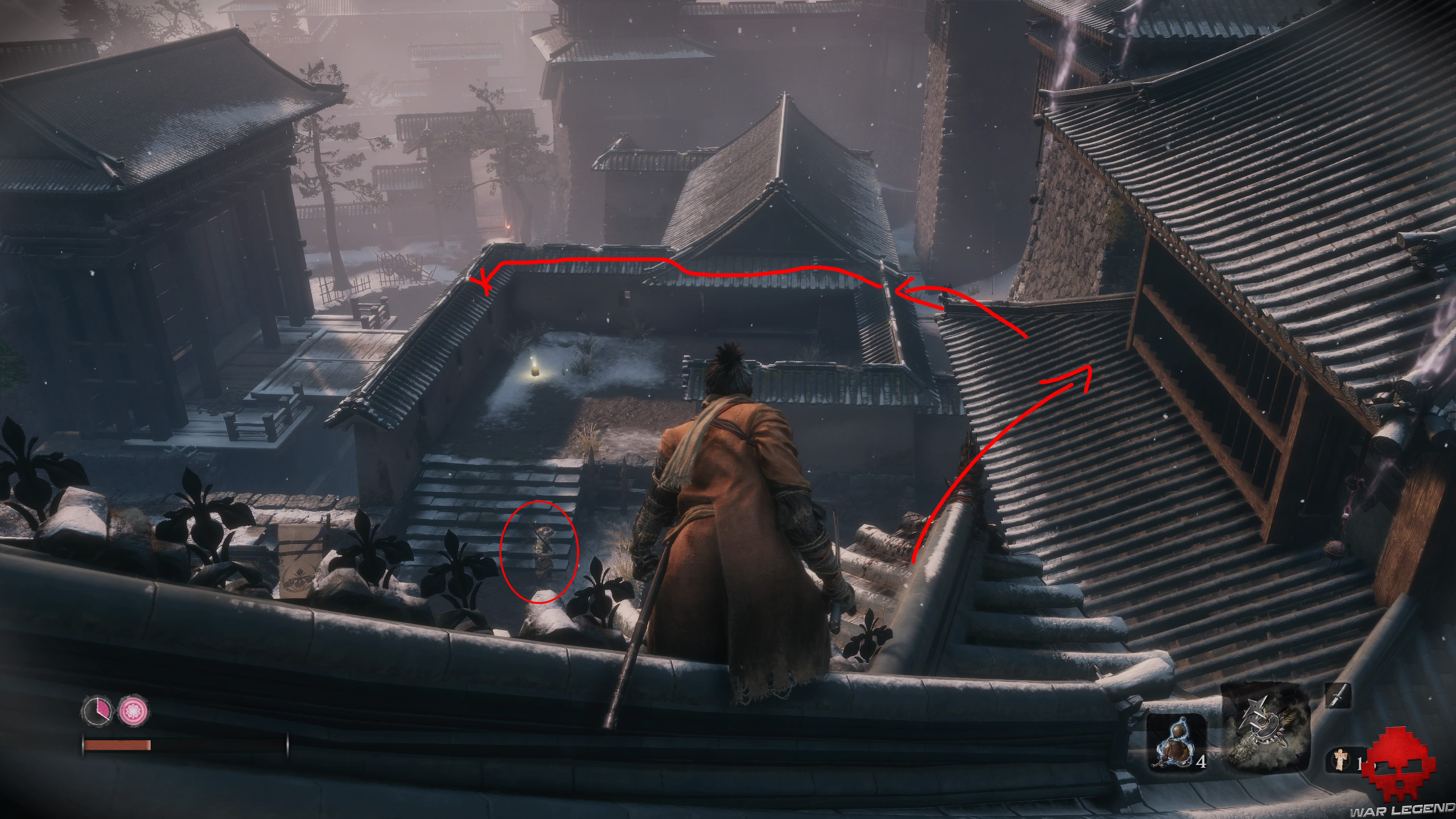 Comme d’habitude, vous récupérez une Perle de chapelet. Faites face à la tour, regardez en hauteur et utilisez le grappin pour grimper à son étage. Faites le tour pour récupérer 1 Statuette recouverte puis préparez-vous à descendre les escaliers. Au bas des marches, un soldat se cache sur la droite, attendez que le gros type au marteau vous tourne le dos pour aller le dessouder avant de poursuivre par M. Marteau.