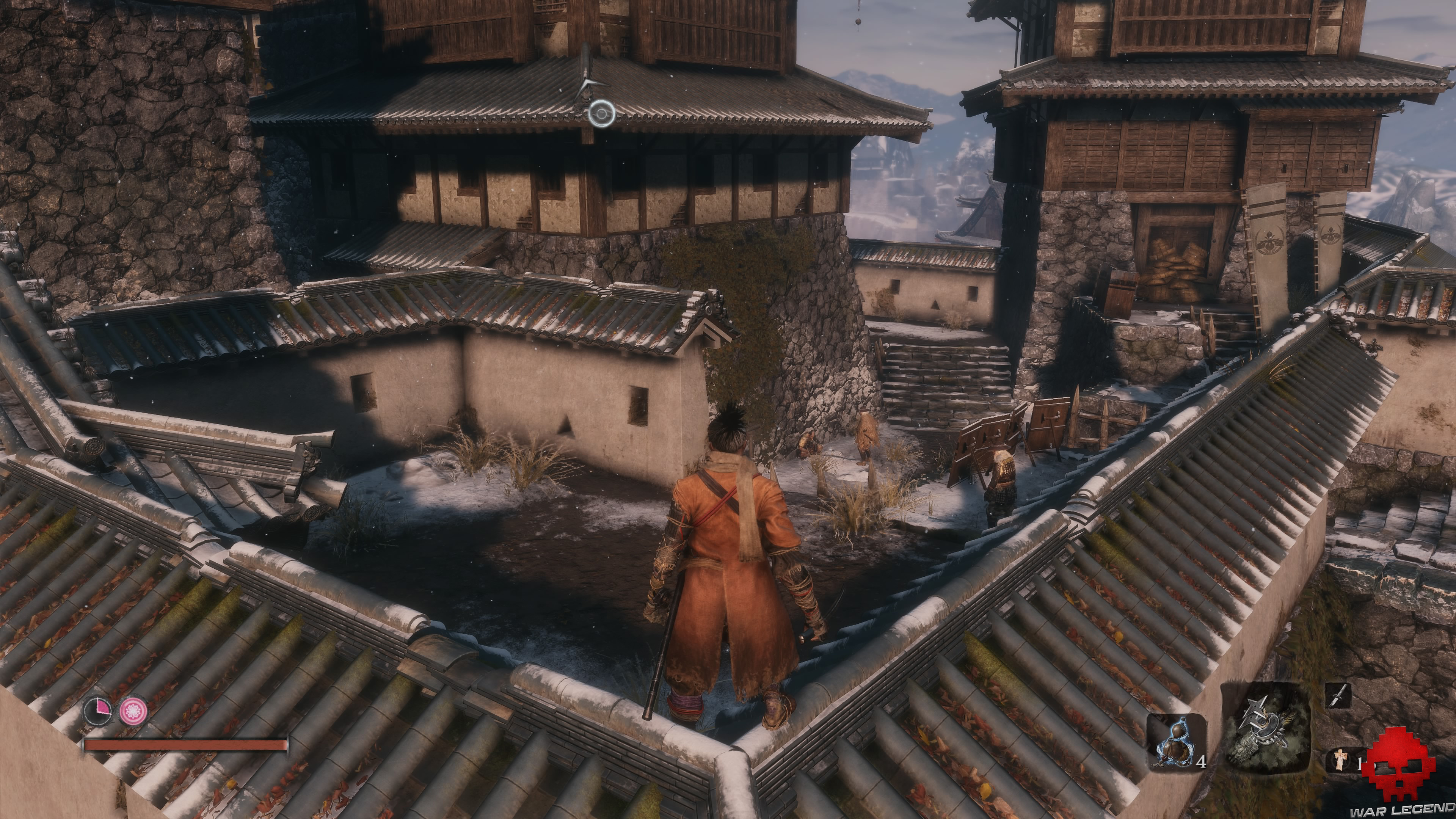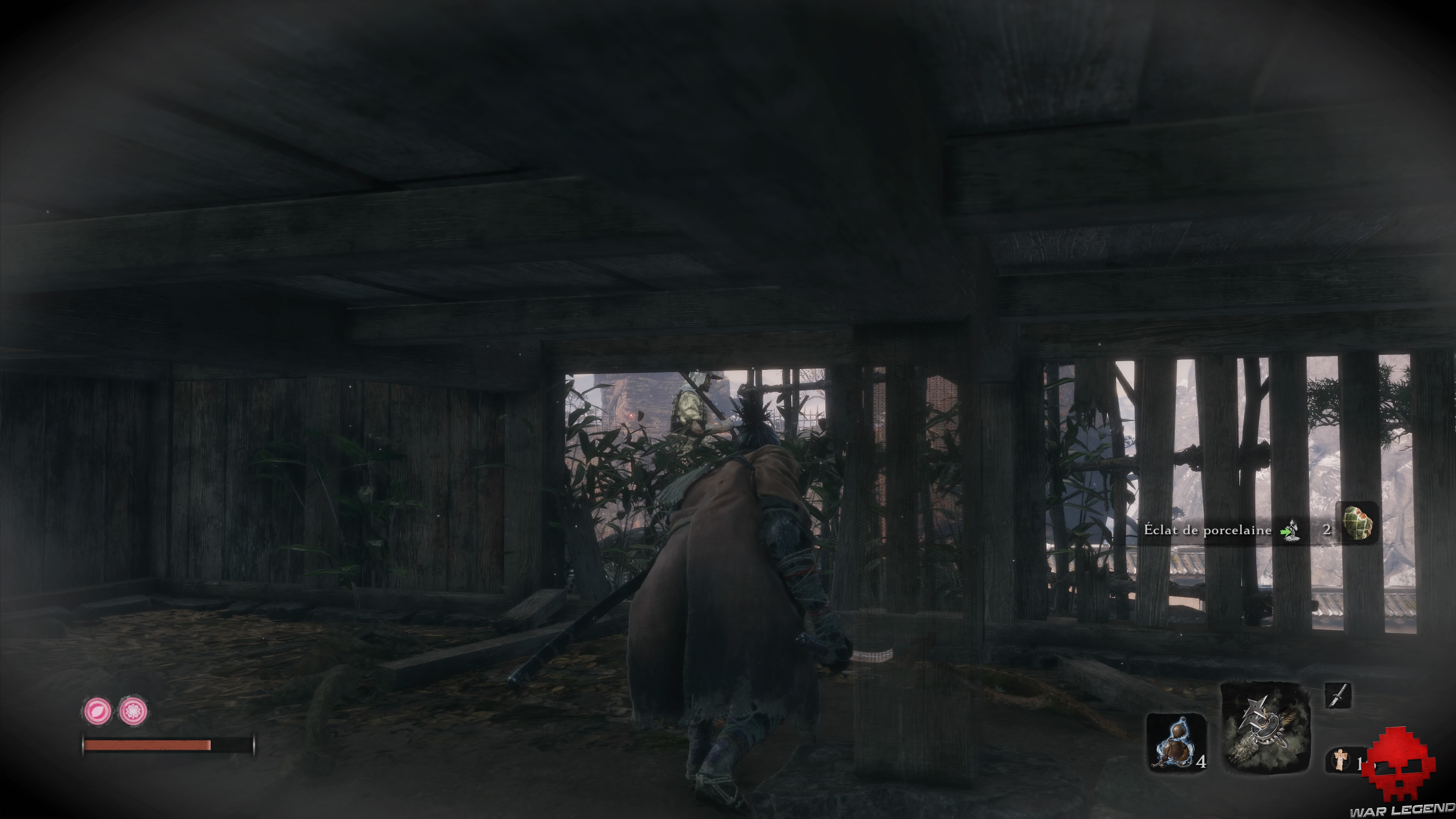 Faites maintenant le tour du toit pour tuer les 2 autres. Un butin (Éclat de porcelaine) vous attend un peu plus loin, mais prenez bien garde à l’autre homme-cerf-volant que vous apercevez au loin sur la gauche. Collez-vous au mur du butin, juste derrière se trouve un autre adversaire.