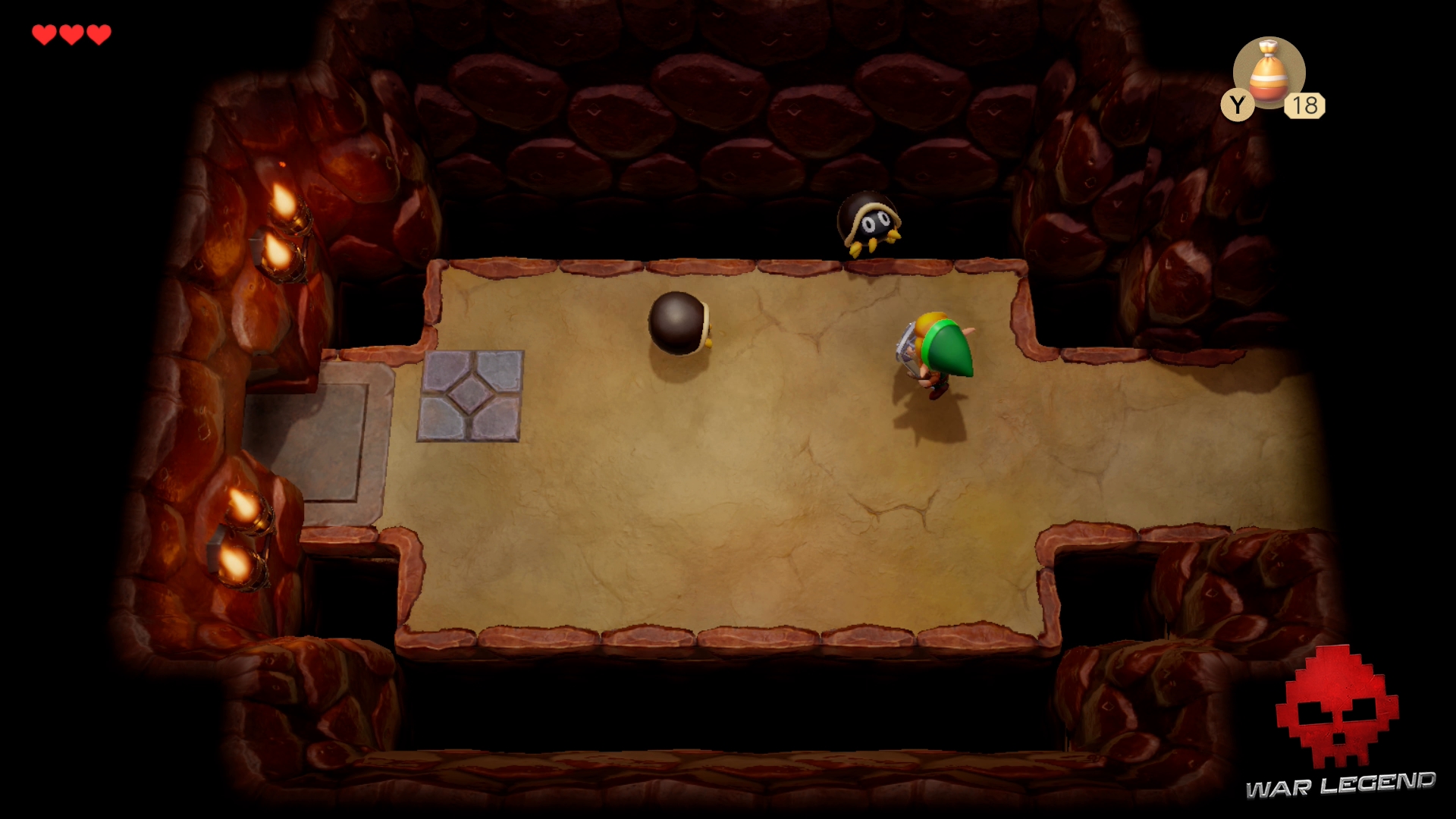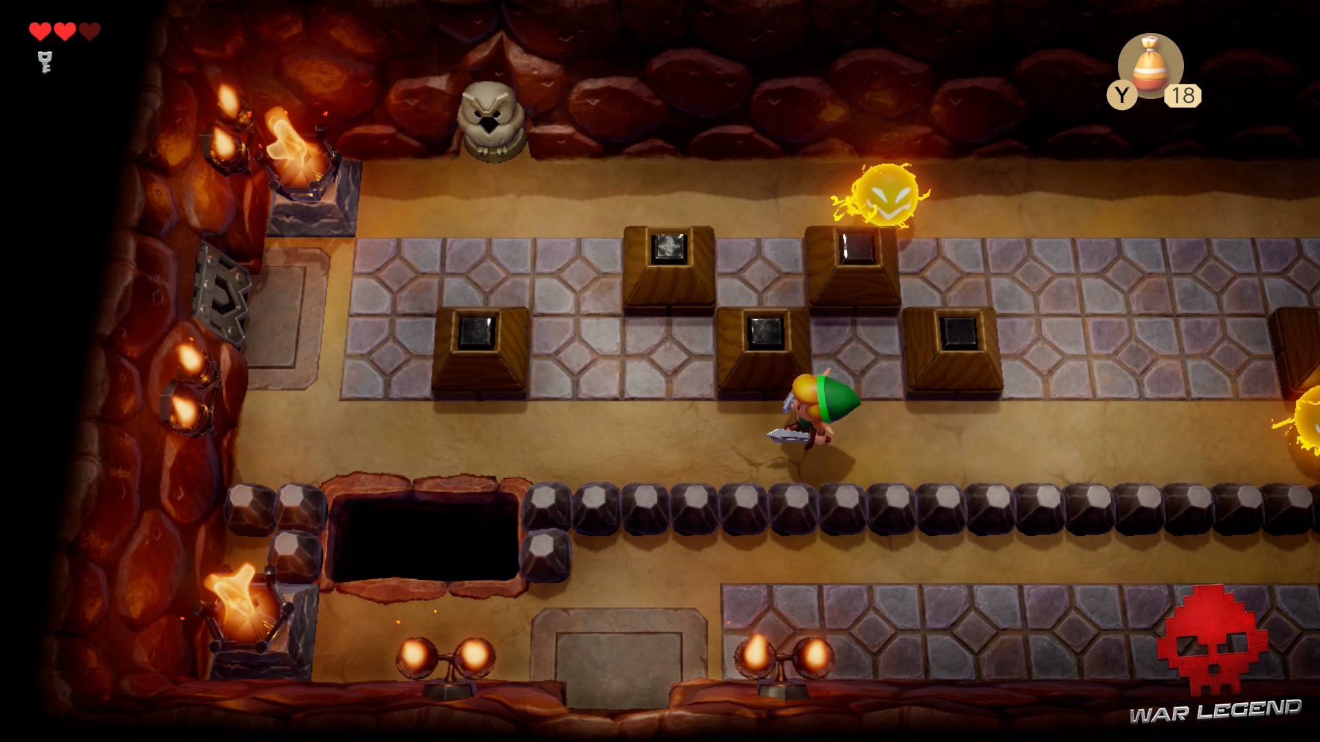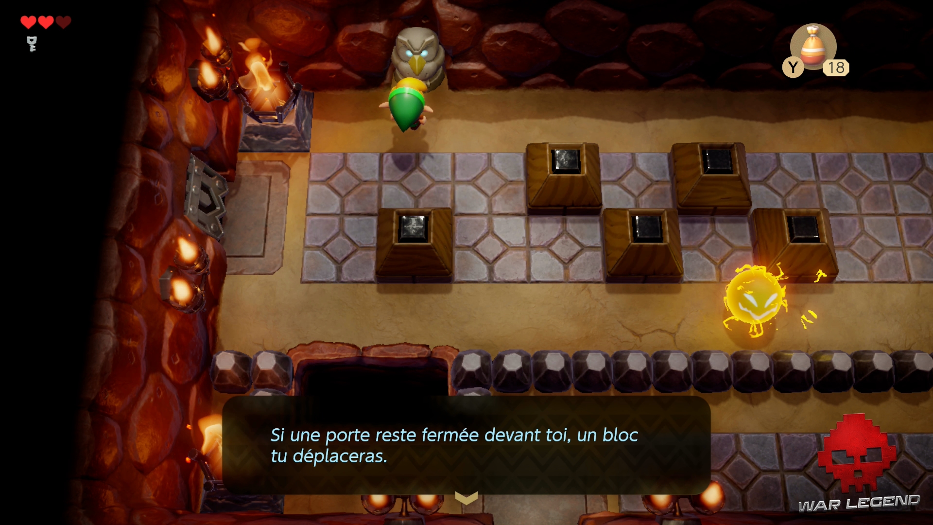 Dans cette nouvelle pièce, éliminez les ennemis en les basculant sur le dos avec votre bouclier, comme conseillé par la statue de hibou.
