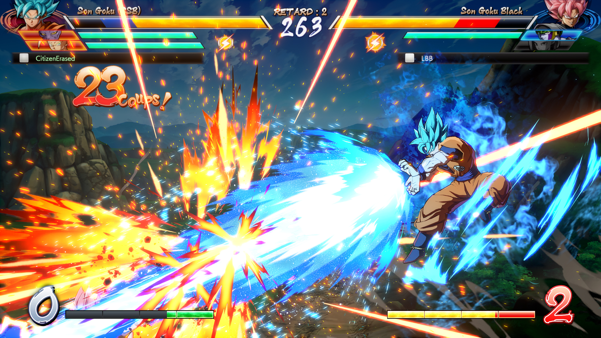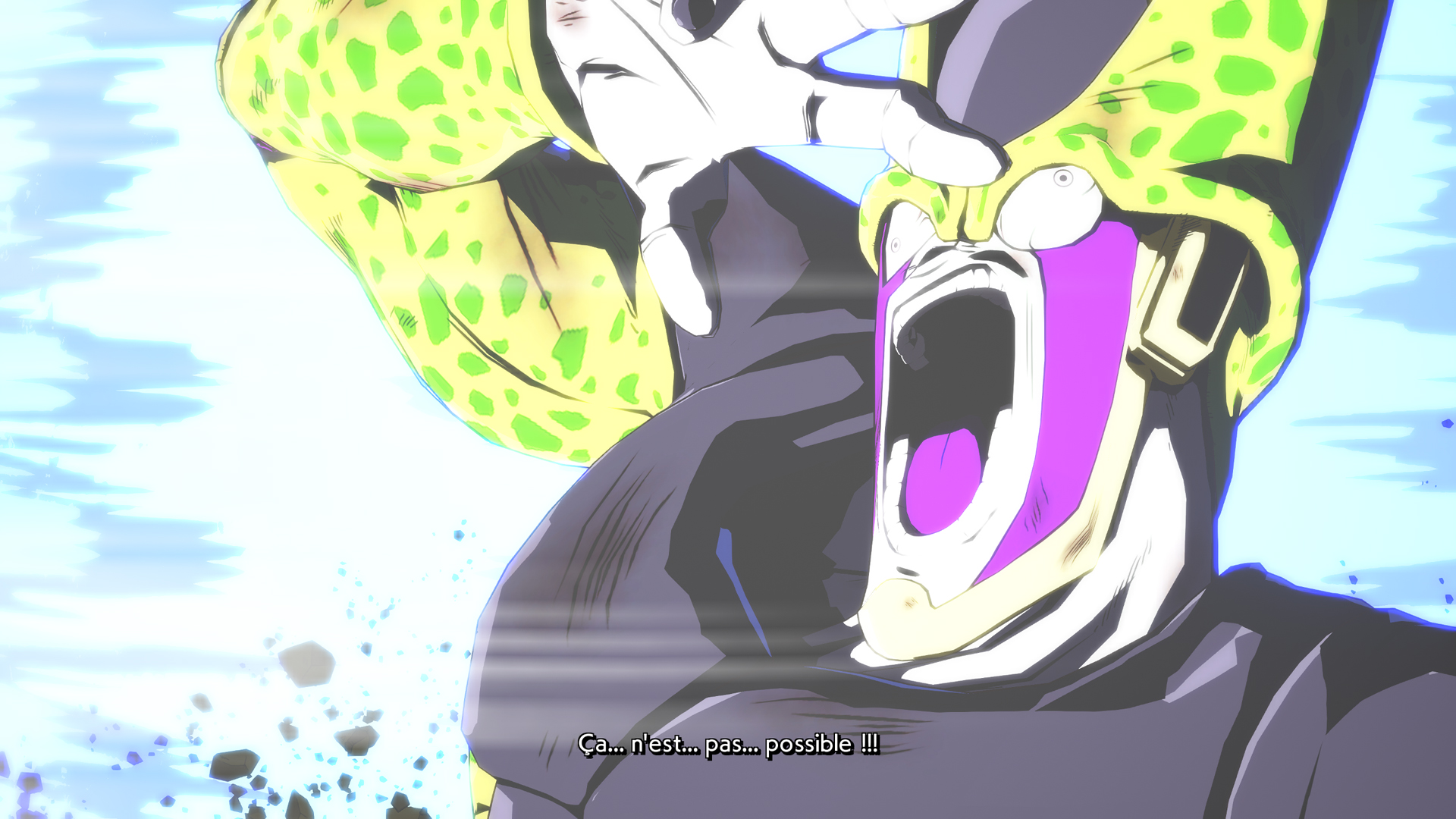 Le truc qui saute à la tronche en premier lieu, ce sont CES GRAPHISMES VENUS DU CIEL, OH, MON KAMI-SAMA. Tiré des travaux de recherche et développement sur le moteur de Guilty Gear Xrd avec l’Unreal Engine 3 qui arrive à aplatir les couleurs pour un rendu proche d’un anime japonais, le passage à l’Unreal Engine 4 (renommé UE4 RED) rend DBFZ encore plus impressionnant visuellement qu’était le précédent titre d’ArcSys, et le respect quasi religieux de la licence donne vraiment l’impression d’avoir un produit de la TOEI Animation sous les yeux (ce qui n’est pas très dur, vu la qualité de Dragon Ball Super). Le souci du détail va jusqu’à la reproduction précise des attaques que l’on peut voir dans le manga et l’anime, où l’on peut même s’amuser à les calquer pour être confondus de manière parfaite. Le jeu est d’une fluidité sans failles autant techniquement qu’une fois le gameplay en main, et tout s’emboîte parfaitement. On avoue quand même que le jeu manque parfois de lisibilité quand les vagues déferlantes fusent tous azimuts.