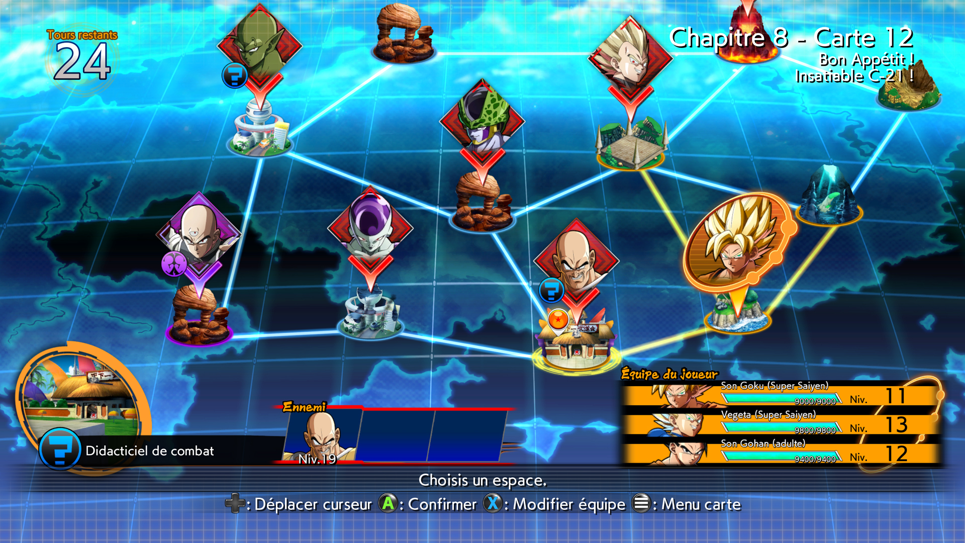 Proche d’un Marvel vs Capcom, vous constituez une équipe de trois guerriers et gagnez quand les trois d’en face sont au tapis. En sus de votre capacité à créer des combos efficaces et à lire le jeu de votre adversaire, il faudra alors gérer les ressources de votre équipe en surveillant la barre de Ki commune et les barres de vies qui remontent quand vos guerriers ne combattent pas. Changez de personnage pour éviter de le perdre trop rapidement ou prenez le risque d’en utiliser plusieurs pour créer de plus longs combos.