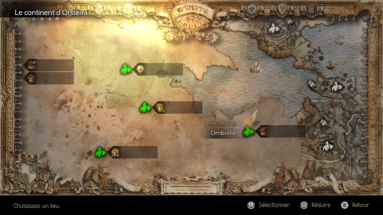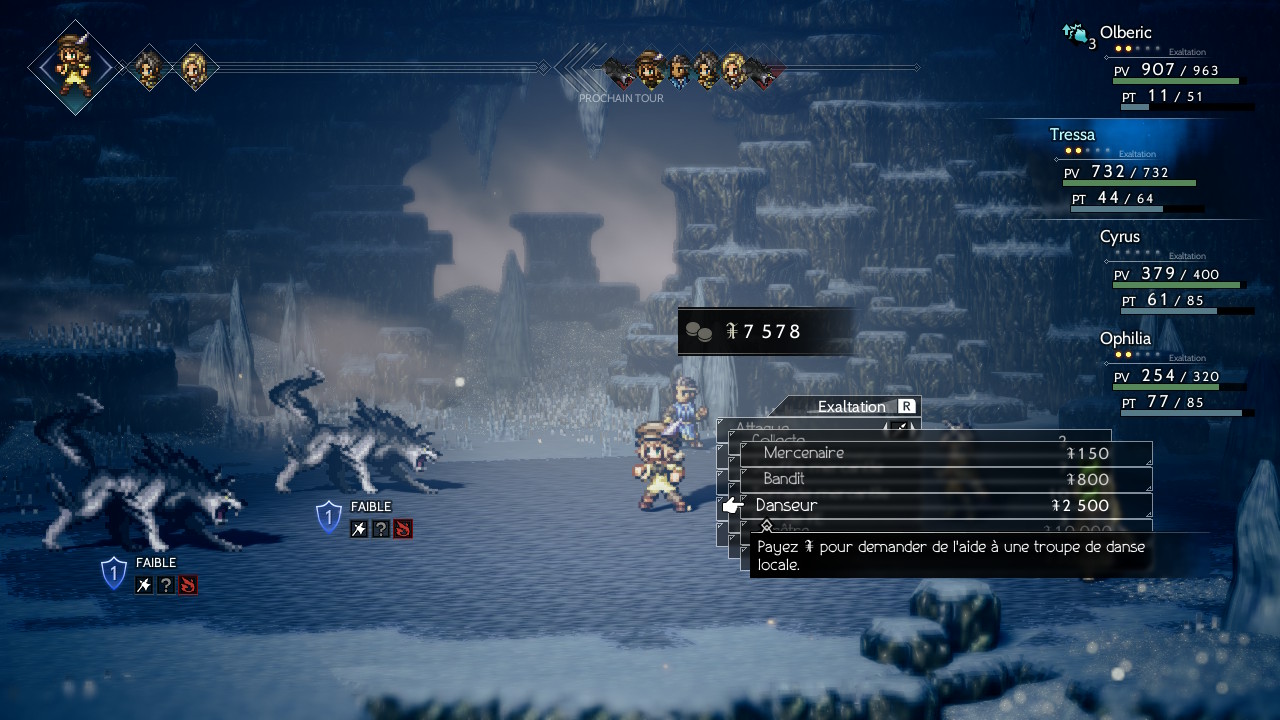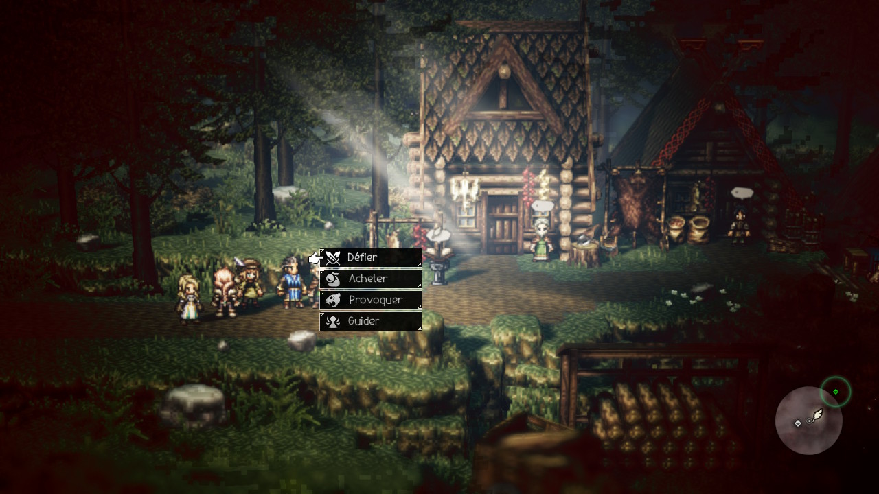 À cela, chaque personnage possède une compétence unique à utiliser sur la carte du monde, généralement sur des PNJ croisés en chemin. La danseuse peut séduire quelqu’un pour qu’il rejoigne temporairement le groupe, la chasseuse peut capturer des monstres pour les invoquer pendant les combats, le voleur peut dérober l’argent des PNJ et ouvrir des coffres spéciaux, le chevalier peut défier des PNJ en combat singulier, etc. Le plus drôle reste Tressa la marchande qui trouve de l’argent par terre régulièrement, peut acheter tout et n’importe quoi à n’importe qui, et qui peut invoquer des mercenaires sur le terrain en dépensant votre argent.