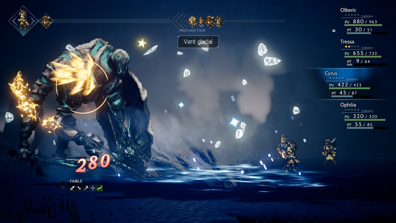 Si on retrouve les mécaniques classiques d’un système de combat au tour par tour, les personnages peuvent attaquer avec leurs armes ou bien utiliser des compétences. Les ennemis possèdent une jauge de défense qu’il faudra exploiter en appliquant un dégât dont ils sont sensibles. Une fois cette jauge à zéro, l’ennemi en question devient vulnérable à toutes les attaques et ratera son prochain tour.