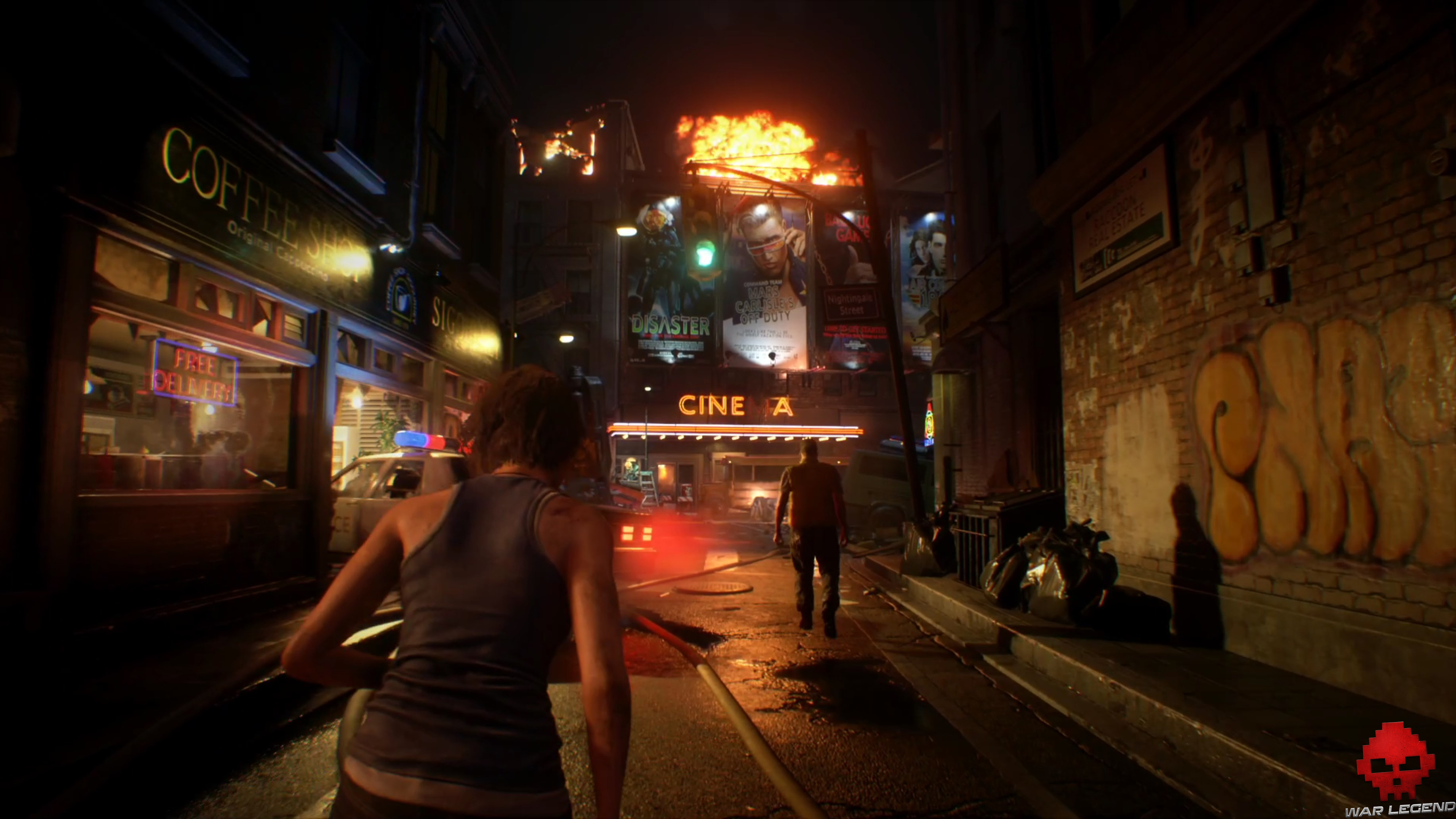 La première chose que l’on remarque dans Resident Evil 3, c’est sa superbe plastique. Graphiquement le titre se montre tout aussi bluffant que son prédécesseur, et même davantage : cette fois-ci se mêlent environnements intérieurs et extérieurs avec des jeux d’ombre et de lumière encore plus saisissants puisque la lumière froide des néons se conjugue à la chaleur des flammes dans la nuit.