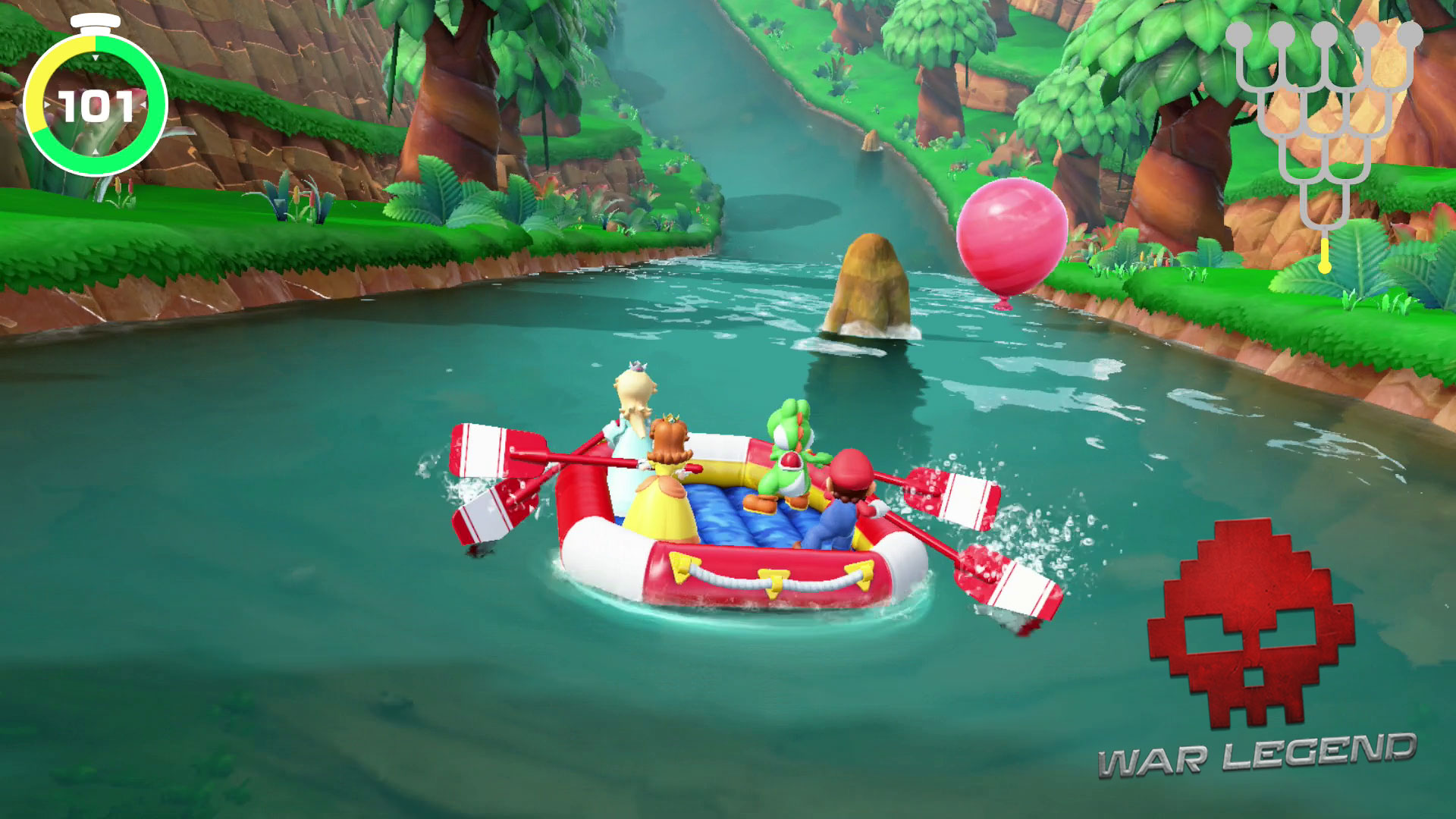 L’autre mode principal est le rafting. À quatre sur un radeau, il faut coopérer pour descendre un fleuve dans le temps imparti (tout en moulinant les Joy-Cons comme des cons, cela va de soi). Sur le chemin, il faudra toucher des ballons pour lancer les fameux mini-jeux en coopération et gagner du temps supplémentaire sur le chronomètre.
