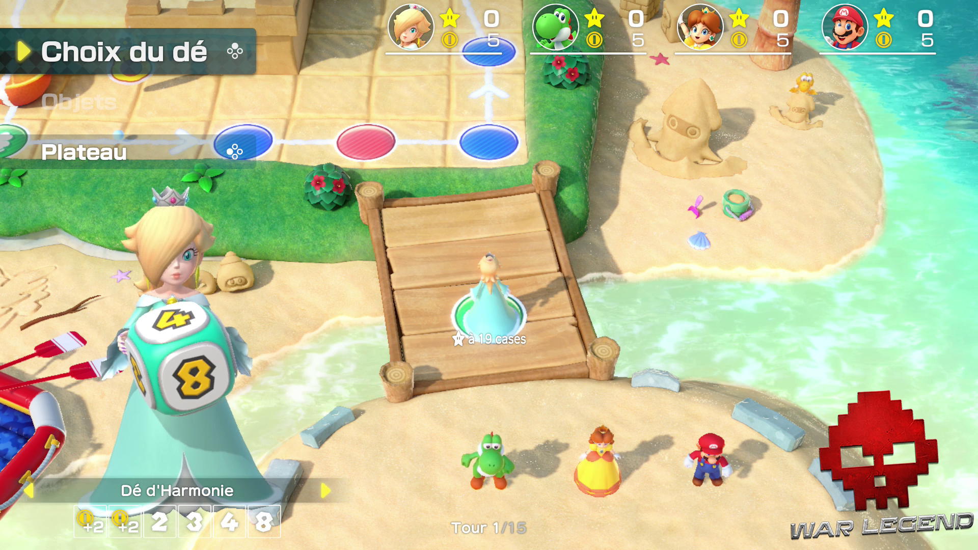Il existe quatre plateaux, dont un à débloquer. Ces derniers ont connu une cure d’amaigrissement depuis le dernier Mario Party et ils sont bien moins grands, mais les fourchetes des résultats des dés sont également moins importantes, ce qui rééquilibre un peu le tout.
