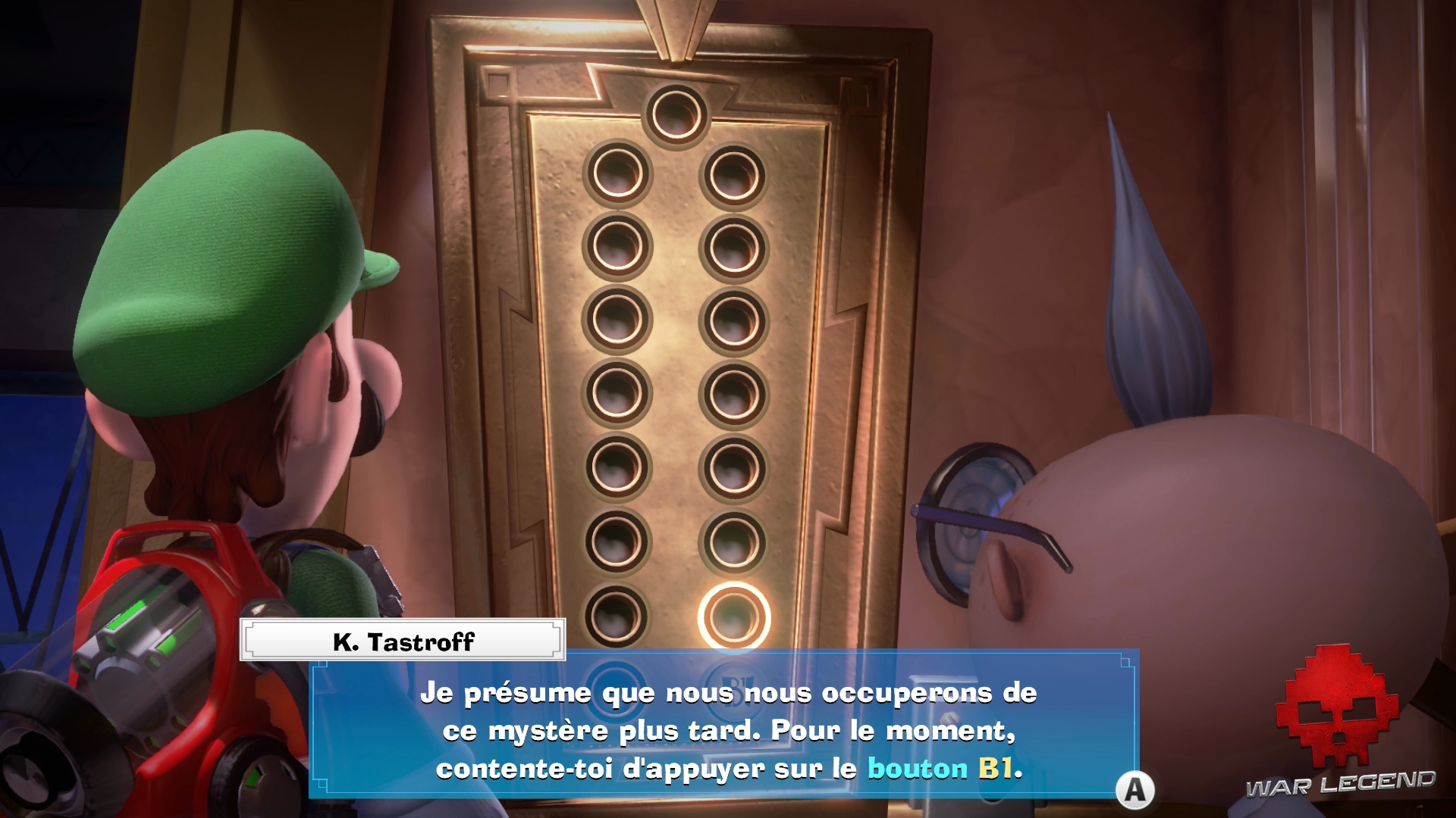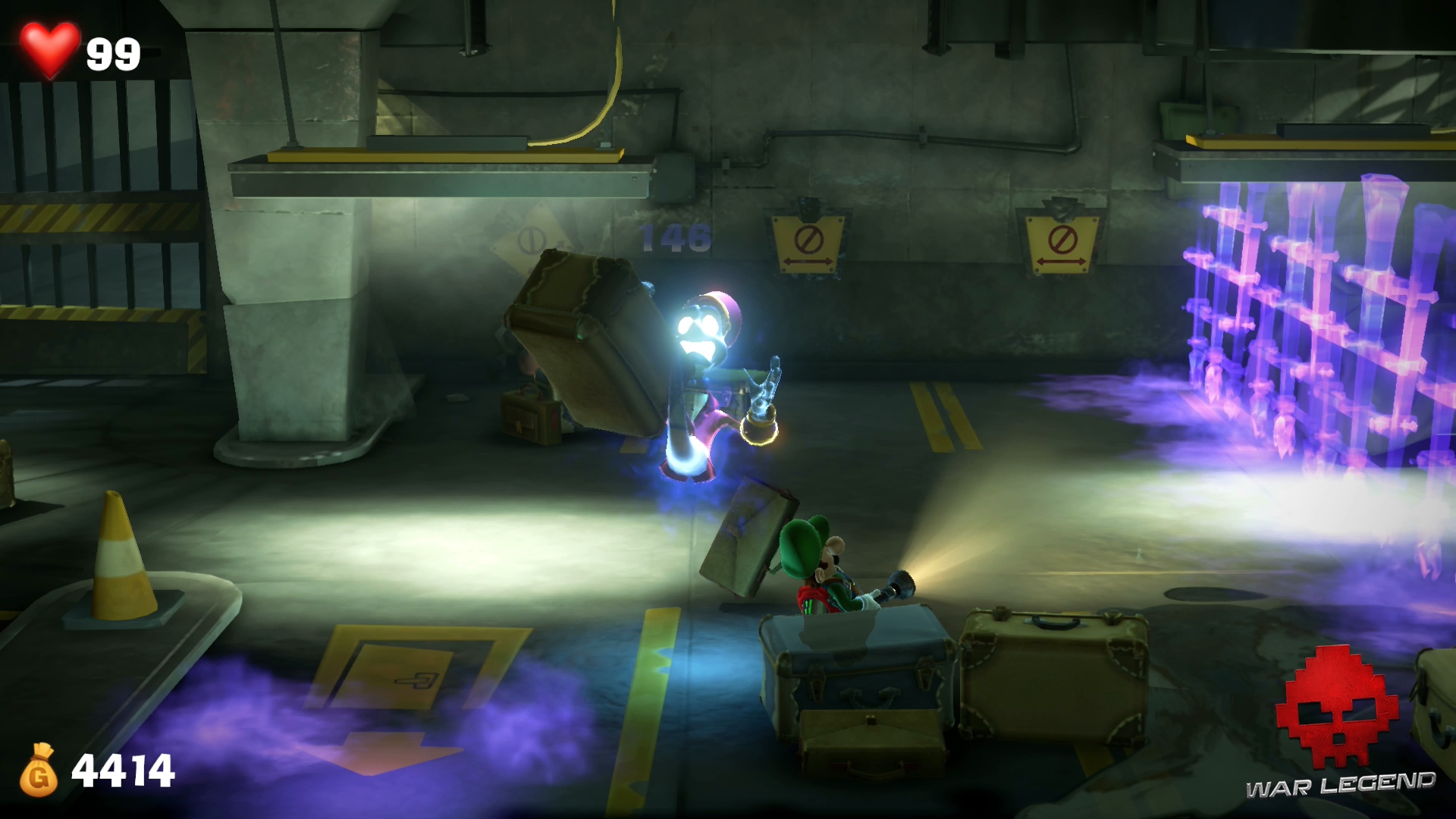 Le professeur K.Tastroff s’installe dans le parking avec son labo mobile qui fera office de refuge pour Luigi afin de pouvoir consulter sa collection de fantômes et connaître la marche à suivre en consultant le journal. Le professeur a besoin de mettre à jour l’Ectoblast, mais sa valise est restée dans sa chambre au 5e étage. Cependant, vous êtes désormais équipé du lance-ventouse qui sera très pratique pour la suite.