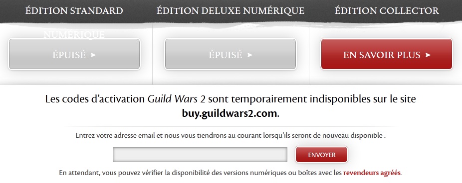Le succès du jeu est tel qu’ArenaNet a suspendu sa vente de jeu en ligne pour mieux gérer l’afflux de nouveaux joueurs. Ce n’est pas la première fois que cela arrive, en effet pour le MMO Star Wars, EA & Bioware avaient déjà utilisé cette technique pour limiter l’affluence de joueurs en fermant la boutique en ligne pendant quelques jours.