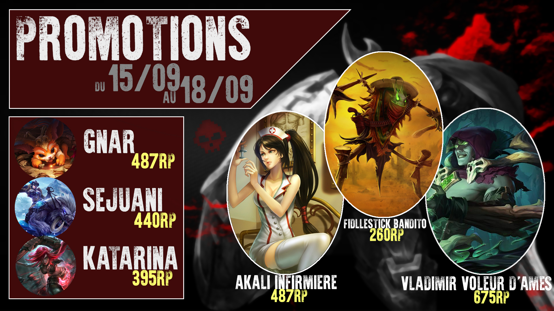 Les voici, les voilà : les promotions toutes fraîches du 15 au 18 septembre ! Servez-vous ! L’occasion d’agrandir votre collection avec ces -50% sur trois champions et trois skins. Cette semaine c’est au tour de GNAR, SEJUANI et KATARINA d’être en promotion…