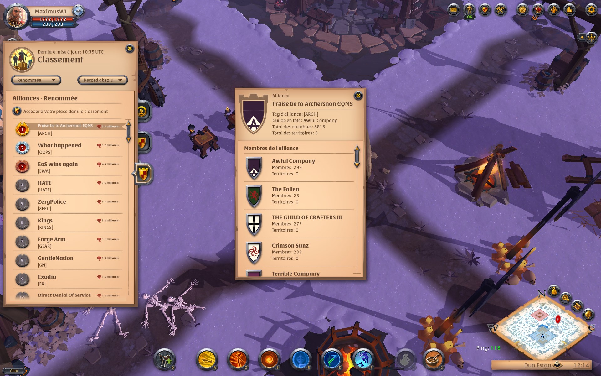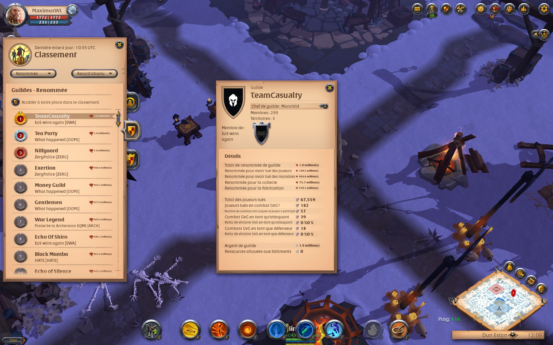 L’alliance Arch, dans laquelle se trouve War Legend est toujours première en renommée, ceci grâce à un nombre imposant de joueurs. Elle est suivie par l’alliance Oops et Ewa. Plus important à ce niveau, ce sont les alliances Hate, Zerg et Ewa qui prennent les premières places du classement en territoire. L’alliance Oops, dirigée par Money Guild semble en difficulté. Exercer une hégémonie sur un continent est une force, mais entraine également des faiblesses comme la nécessité de faire front partout à la fois et de multiplier les combats. La première place devrait se disputer encore un bon moment, la guerre ne meurt jamais.