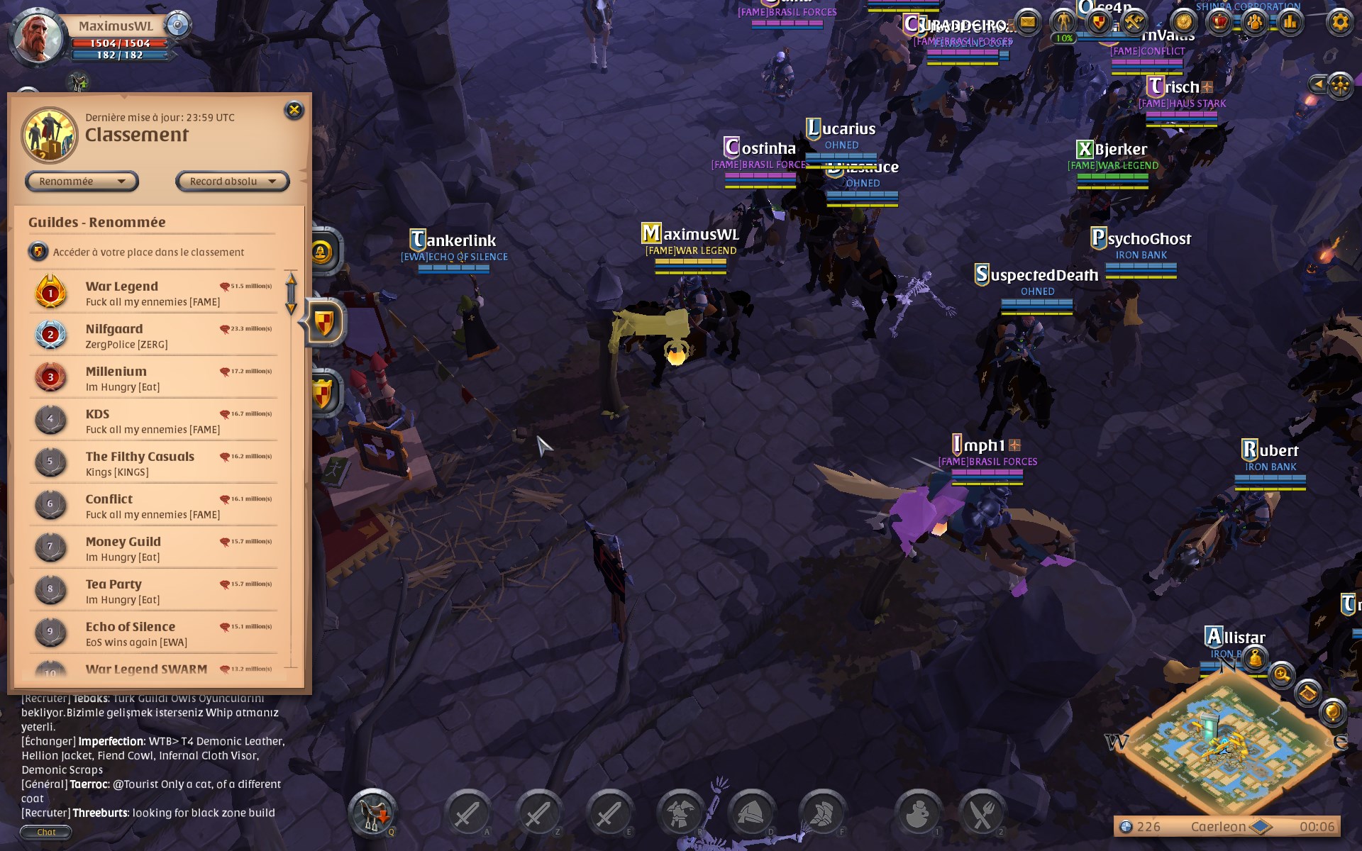 D’autres combats ont eu lieu dans la journée, notamment avec Chicken Kiss. Ceux-ci sont parvenu à décrocher la victoire par trois fois contre Say My Name. War Legend sécurise le top trois en terme de contrôle de territoire à égalité avec Echo of Shiro et Money Guild en cumulant un total de 9 terres contrôlées. De son côté, War Legend Swarm, après être rentré dans le tableau des scores hier avec 2 territoires, grimpe rapidement en 3e place, ex aequo avec Hammer and Sickle, avec un cumul de 6 provinces. De nombreuses zones sont encore libres de droit et les prochains jours vont encore décider drastiquement la forme que prendra le monde d’Albion dans le futur.