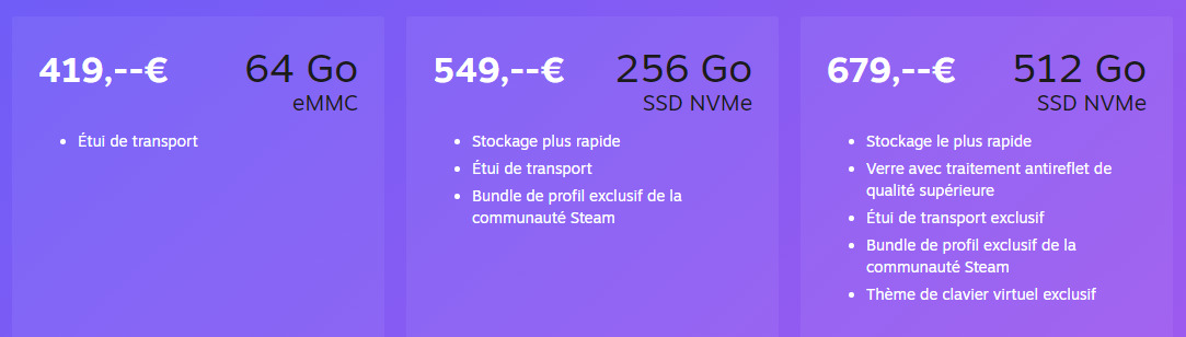 Le Steam Deck sera décliné en 3 modèles. La fiche technique est rigoureusement la même pour les trois offres, mais le prix influera sur la capacité de stockage et sa vélocité. Le premier prix à 419€ propose 64 Go de mémoire embarquée classique, tandis que les versions à 549€ et 679€ profitent d’un SSD NVMe, respectivement de 256 Go et 512 Go. Valve confirme qu’il sera possible d’étendre la mémoire avec des cartes micro SD.